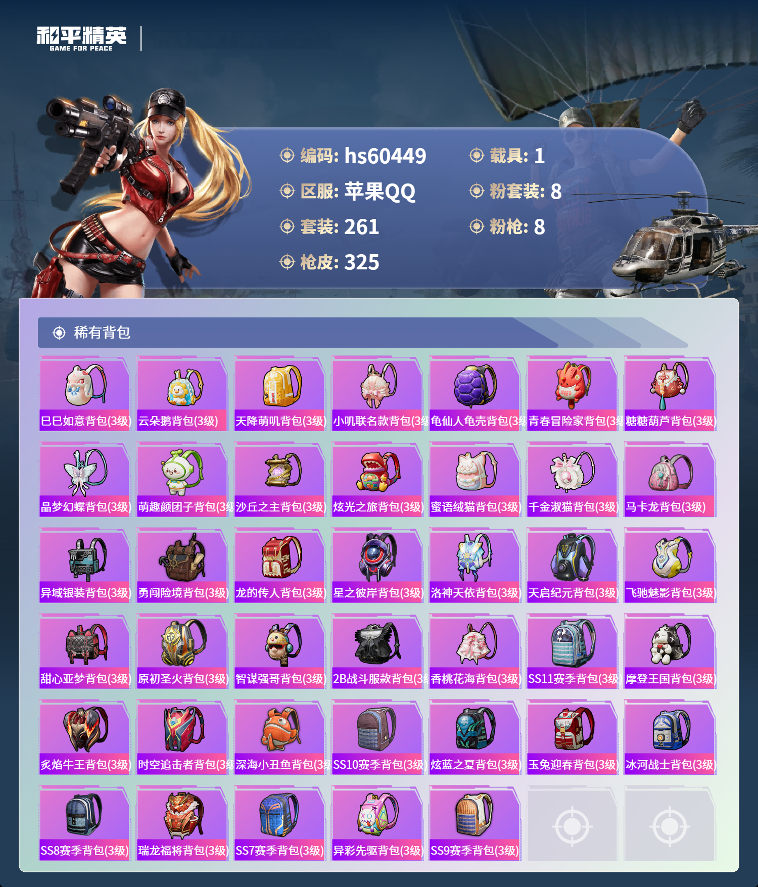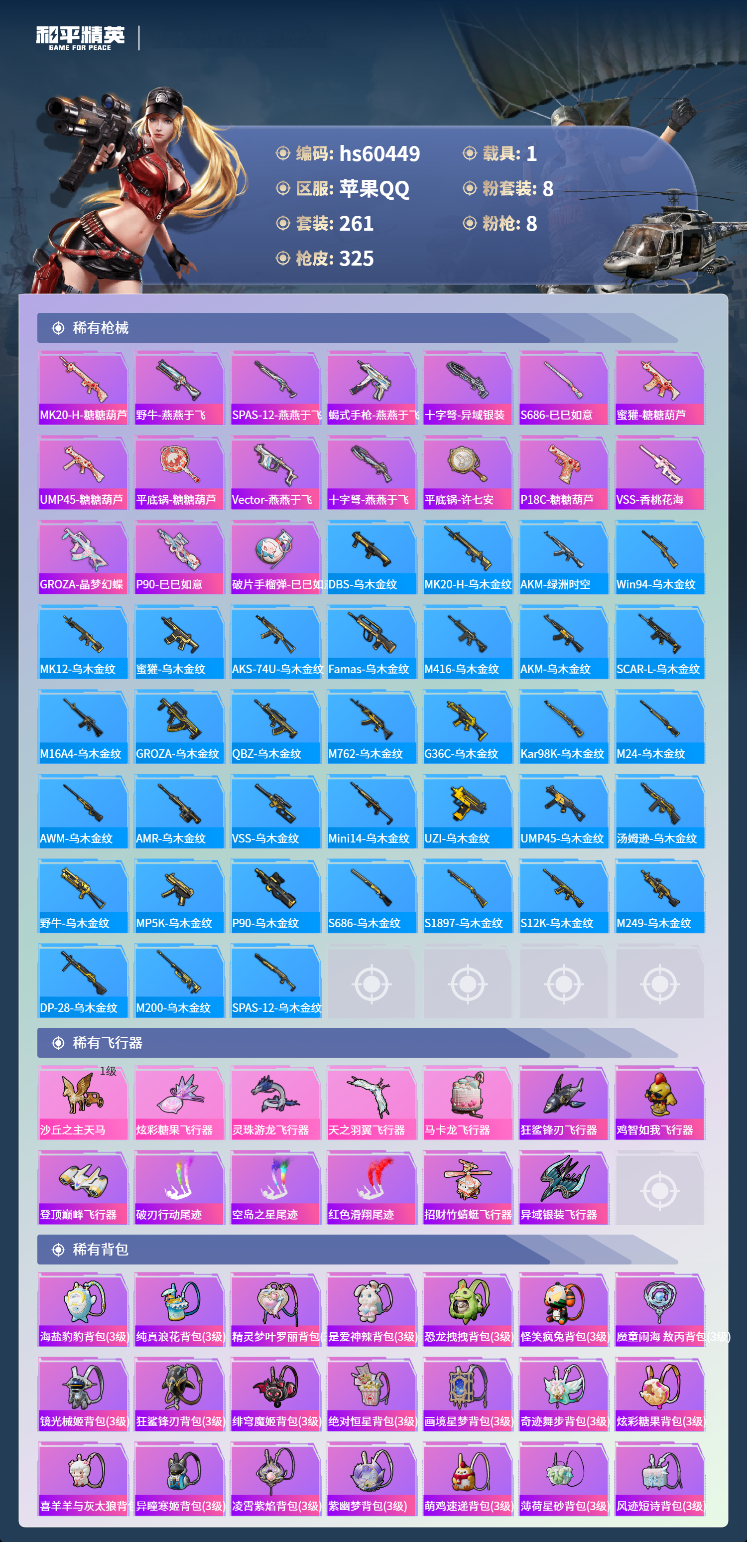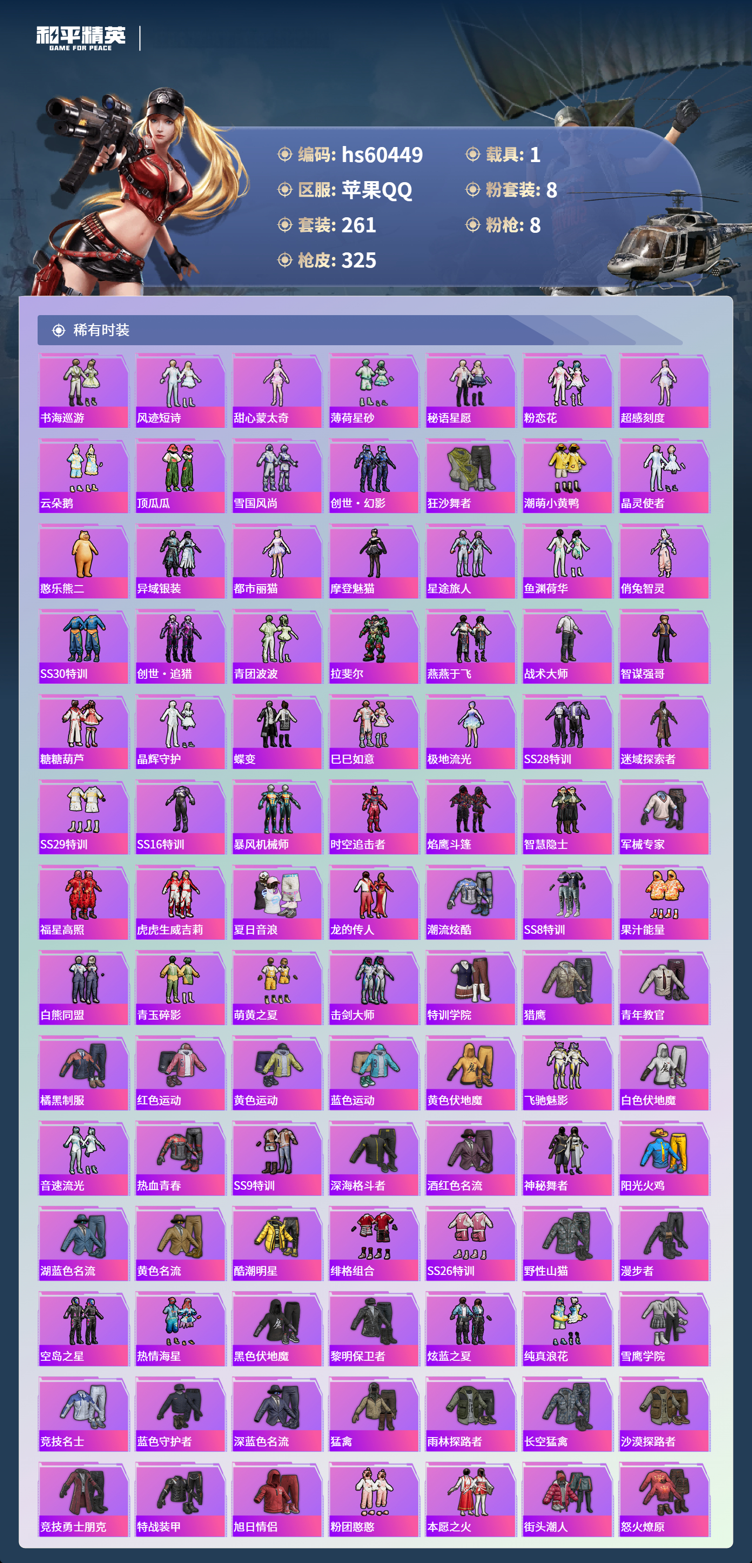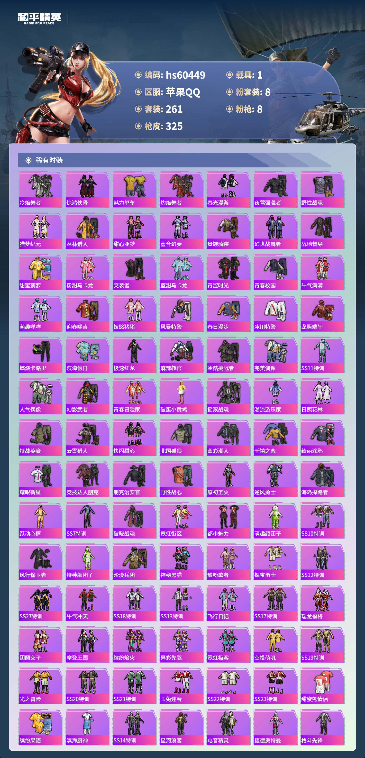 hs60449 苹果手q-19王牌印记-1红装-8粉装-8特效呛-1载具-热力值-261套装-325呛皮-4卓越印记【1红装】沙丘之主-图卡盟/4级【8粉装】角色-洛天依套装-创世·救赎角色-星云暗核套装-星穹咏叹调角色-呆萌星弥套装-星之彼岸角色-异瞳寒姬角色-奇迹舞步 美琪【8特效呛】aks-74u-无垠阁/1级scar-l-青春物语/7级kar98k-巳巳