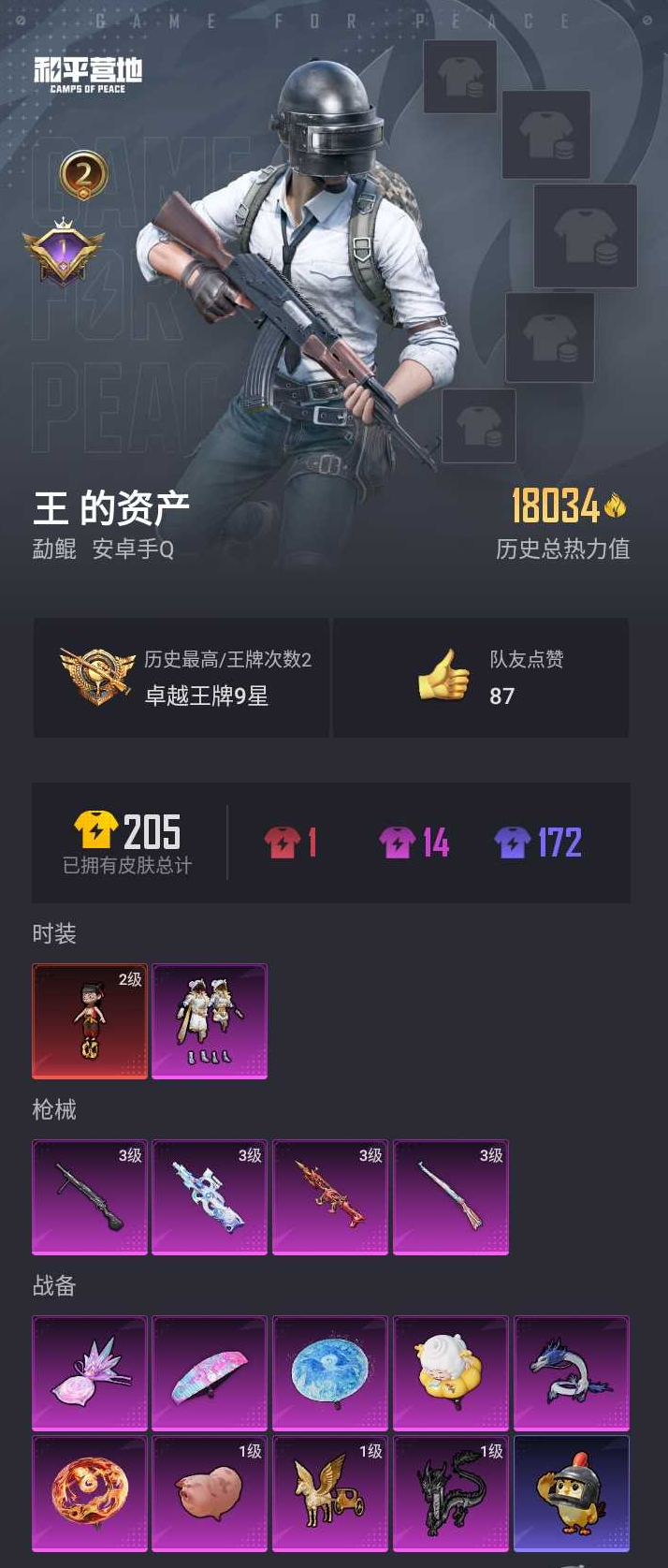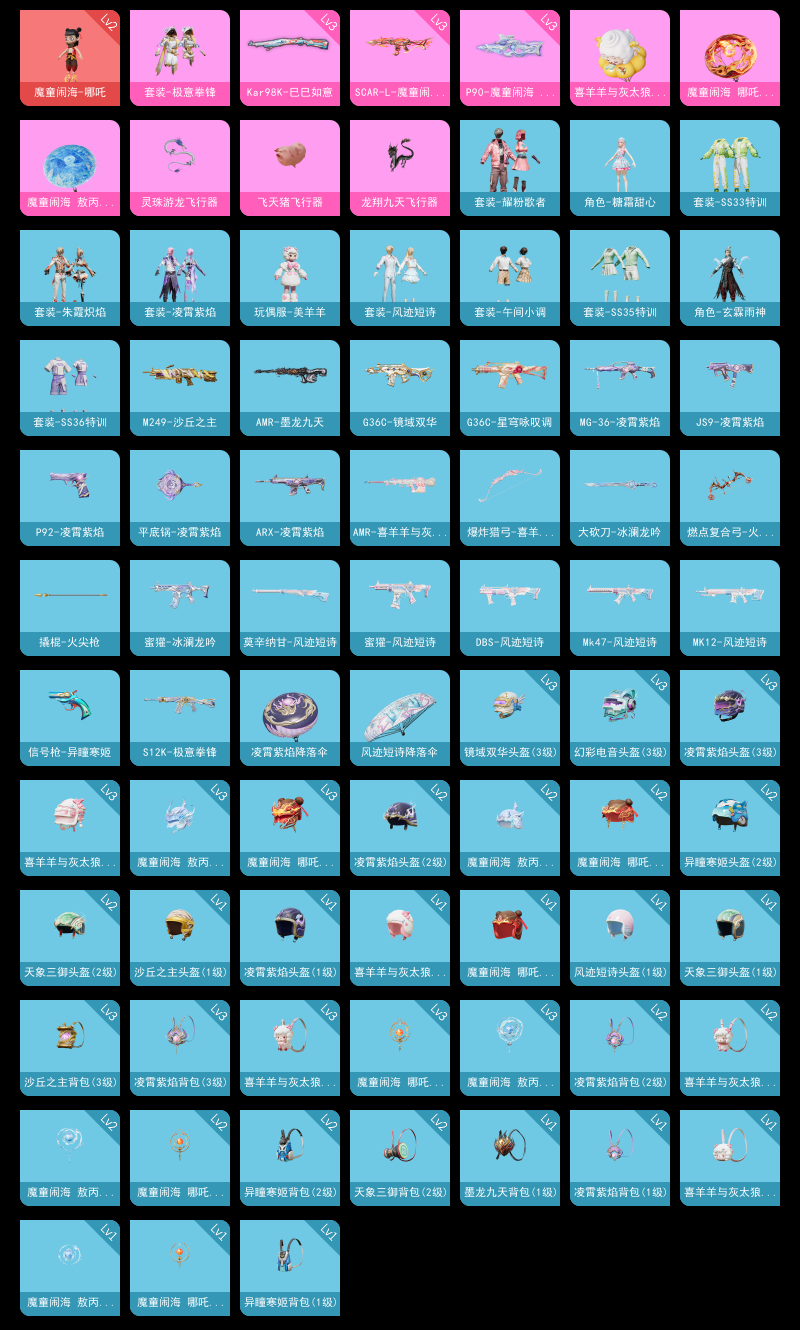 【和平精英】【lyhp22198】1粉装,4特效呛,0载具,历史最高段位:卓越王牌9星 王牌印记2次 热力值:18034,33套装,58呛械,77装备,26战备;套装:魔童闹海-哪吒,套装-极意拳锋,套装-特训学院,套装-蓝色运动,套装-海岛探路者,套装-人气偶像,套装-疯狂小兔子,套装-鹤鸣,套装-萌黄之夏,套装-白糯汤圆,套装-战术大师,套装-耀粉歌者,套装-玉兔迎春,套装-云魄琉璃,套装-恋语绒绒,套装-街头风暴,角色-糖霜甜心,套装-ss31特训,套装-ss33特训,套装-ss32特训,套装-顶瓜瓜,套装-炫彩糖果,玩偶服-美羊羊,套装-ss34特训,套装-朱霞炽焰,套装-凌霄紫焰,套装-ss35特训,套装-午间小调,套装-风迹短诗,角色-玄霖雨神,套装-ss37特训,套装-ss36特训,套装-萌鸡速递;呛皮:3级scar-l-魔童闹海 哪吒,scar-l-炫彩节奏,scar-l-彩虹符号,scar-l-玉兔迎春,groza-紫矿核心,famas-霓彩脉冲,famas-乌木金纹,akm-霓彩脉冲,g36c-镜域双华,g36c-星穹咏叹调,蜜獾-风迹短诗,蜜獾-冰澜龙吟,蜜獾-乌木金纹,ac-val-天降萌叽,ace32-冰晶雪宝,aug-冰晶雪宝,mk47-风迹短诗,arx-凌霄紫焰,amr-墨龙九天,amr-喜羊羊与灰太狼,3级kar98k-巳巳如意,莫辛纳甘-风迹短诗,m200-乌木金纹,win94-乌木金纹,slr-霓彩脉冲,mk12-风迹短诗,mk20-h-狂鲨锋刃,sks-炫彩节奏,3级p90-魔童闹海 敖丙,p90-巳巳如意,js9-凌霄紫焰,aks-74u-乌木金纹,uzi-炫彩糖果,汤姆逊-天降萌叽,spas-12-狂鲨锋刃,spas-12-乌木金纹,s12k-极意拳锋,s12k-霓彩脉冲,dbs-风迹短诗,pkm-啾咪啾咪,mg3-幻世战舞者,m249-沙丘之主,m249-乌木金纹,3级dp-28-豹影疾电,mg-36-凌霄紫焰,p92-凌霄紫焰,信号呛-异瞳寒姬,大砍刀-冰澜龙吟,平底锅-属我最6,平底锅-凌霄紫焰,撬棍-火尖呛,燃点复合弓-火尖莲影,盐雾蛋-冰澜龙吟,破片手留单-拽到爆炸,破片手留单-火尖莲影,破片手留单-爆破雪人,爆炸猎弓-喜羊羊与灰太狼,铝热弹-炫彩糖果;降落伞:炫彩糖果飞行器,灵珠游龙飞行器,沙丘之主天马,龙翔九天飞行器,飞天猪飞行器,鸡智如我飞行器,登顶巅峰飞行器; 详情看图1红装1粉装4特效呛 2级哪吒 3级p90魔童闹海 3级死噶魔童闹海地铁满天赋
