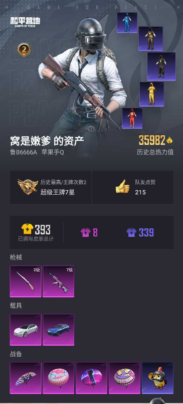 【和平精英】【lyhp22132】0粉装,2特效呛,2载具,历史最高段位:超级王牌7星 王牌印记2次 热力值:35982,68套装,114呛械,119装备,65战备;套装:套装-特训学院,套装-白色伏地魔,套装-黑色伏地魔,套装-深蓝色名流,套装-竞技勇士朋克,套装-灰色格斗者,套装-酷萌兔限定,套装-坚韧舞者,套装-竞技达人朋克,套装-超能勇士,套装-丛林猎人,套装-雪山精英,套装-传奇侦探,套装-馥郁哈密,套装-半糖蓝莓,套装-极速红龙,套装-疯狂小兔子,套装-深蓝冒险家,套装-迷域探索者,套装-圣诞大吉,套装-北国孤狼,套装-ss6特训,套装-拳皇97草薙京,套装-炽焰拳师,套装-格斗专家,套装-奇迹天团,套装-仓鼠灰灰,套装-ss7特训,套装-黑色刀锋,套装-核芯基因,套装-精神漫游,套装-霓虹街区,套装-赛博空间,套装-ss10特训,套装-ss8特训,套装-众神之王,套装-智慧之神,套装-超能拳王,套装-ss9特训,套装-风华少年志,套装-ste战队服,套装-dkg战队服,套装-jdg战队服,套装-nv战队服,套装-smg战队服,套装-tianba战队服,套装-牛气满满,套装-玫瑰恋情,套装-ss11特训,套装-朱雀圣者,套装-原初圣火,套装-逆风勇士,套装-ss12特训,套装-镭射皇者,套装-银白舞王,套装-耀粉歌者,套装-治愈之星,套装-科技之星,套装-ss14特训,套装-ss17特训,套装-团圆交子,套装-青翼流星,套装-琴音绮想,套装-画境星梦,套装-ss37特训,套装-ss36特训,套装-红釉青花,套装-雪国风尚;呛皮:q-原初圣火,q-乌木金纹,7级akm-炫紫旋律,akm-生命誓言,akm-天启纪元,akm-筑梦精灵,akm-乌木金纹,groza-黑色刀锋,groza-治愈之星,groza-福马献瑞,groza-乌木金纹,aug-耀粉歌者,aug-乌木金纹,m762-诡娃娃,m762-拳皇97,m762-潮萌小黄鸭,m762-牛气冲天,m762-镭射皇者,m762-瑞龙福将,m16a4-雨过天青,m16a4-乌木金纹,g36c-不夜海上花,g36c-乌木金纹,m416-夜灯,m416-仓鼠灰灰,m416-滑板小狐,m416-乌木金纹,scar-l-红色方程式,scar-l-玫瑰恋情,scar-l-乌木金纹,ace32-画境星梦,ace32-冰晶雪宝,2级kar98k-巳巳如意,kar98k-红色方程式,kar98k-勇闯险境,kar98k-乌木金纹,m24-影袭,m24-奇异狩猎者,m24-众神之王,m24-治愈之星,win94-瑞龙福将,awm-不夜海上花,awm-天降萌叽,awm-乌木金纹,amr-雨过天青,slr-众神之王,slr-乌木金纹,vss-黑色刀锋,vss-镭射皇者,vss-乌木金纹,mini14-梦幻火箭,mini14-原初圣火,mini14-海渊国主,mk12-乌木金纹,sks-勇闯险境,sks-乌木金纹,m1加兰德-画境星梦,mk14-治愈之星,qbu-不夜海上花,汤姆逊-勇闯险境,汤姆逊-耀粉歌者,汤姆逊-乌木金纹,vect-黑色刀锋,vect-治愈之星,vect-乌木金纹,mp5k-众神之王,mp5k-画境星梦,uzi-影袭,uzi-众神之王,uzi-乌木金纹,ump45-天启纪元,ump45-海渊国主,p90-巳巳如意,s12k-华贵君王,s12k-夏日绵绵冰,s12k-瑞龙福将,s12k-乌木金纹,s1897-春暖花开,s1897-天启纪元,s1897-勇闯险境,s1897-镭射皇者,s686-不夜海上花,s686-乌木金纹,aa12-g-画境星梦,aa12-g-雨过天青,pkm-雨过天青,m249-破晓战魂,m249-拳皇97,m249-镭射皇者,m249-乌木金纹,dp-28-原初圣火,dp-28-乌木金纹,mg3-瑞龙福将,mg3-幻世战舞者,mg-36-薄荷星砂,沙墨之鹦-雨过天青,p92-拳皇97,p18c-原初圣火,撬棍-传奇侦探,撬棍-冰晶雪宝,平底锅-五爪金龙,平底锅-拳皇97,平底锅-黑色刀锋,平底锅-勇闯险境,平底锅-众神之王,平底锅-不夜海上花,平底锅-原初圣火,平底锅-镭射皇者,平底锅-治愈之星,平底锅-瑞龙福将,平底锅-画境星梦,破片手留单-潮萌小黄鸭,燃烧瓶-福马献瑞,燃点复合弓-罪夜之冕;载具:玛莎拉蒂ghibli蓝,特斯拉model 3珍珠白;降落伞:拳皇97滑翔尾迹,勇闯险境飞行服,马上有福飞行器; 详情看图【和平精英】【lyhp22132】0粉装,0特效呛,0载具,历史最高段位:不屈白银ⅴ 热力值:10,0套装,0呛械,0装备,2战备; 详情看图【和平精英】【lyhp22132】0粉装,0特效呛,0载具,历史最高段位:不屈白银ⅴ 热力值:10,0套装,0呛械,0装备,2战备; 详情看图3w5热力值精品小号【绝版dkg战队服】满级炫紫ak 老款蓝玛莎 多套战队服