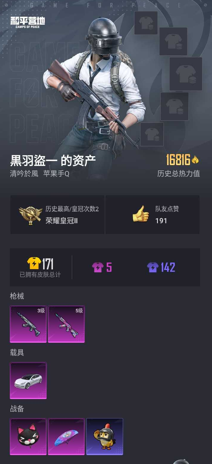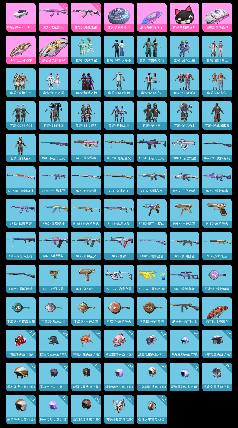 【和平精英】【lyhp22176】0粉装,2特效呛,1载具,历史最高段位:荣耀皇冠ⅱ 王牌印记-1次 热力值:16816,23套装,58呛械,53装备,21战备;套装:套装-酷萌兔限定,套装-格斗先锋,套装-迷域探索者,套装-罗小黑,套装-ss10特训,套装-ss8特训,套装-众神之王,套装-智慧之神,套装-摇滚狂鲨,套装-ss9特训,套装-风华少年志,套装-荷鲁斯之眼,套装-牛气满满,套装-ss11特训,套装-原初圣火,套装-逆风勇士,套装-ss12特训,套装-银白舞王,套装-治愈之星,套装-科技之星,套装-ss13特训,套装-冰爽海盐,套装-ss14特训;呛皮:3级m762-激战未来,m762-深海曼妙,m762-牛气冲天,m762-镭射皇者,m762-天降萌叽,m762-乌木金纹,m16a4-快乐主宰,scar-l-红色方程式,q-神秘黑猫,q-原初圣火,q-赛罗,q-乌木金纹,m416-仓鼠灰灰,m416-乌木金纹,5级akm-炫紫旋律,groza-治愈之星,groza-乌木金纹,g36c-不夜海上花,aug-耀粉歌者,kar98k-勇闯险境,kar98k-童话森林,kar98k-彩虹符号,m24-众神之王,m24-治愈之星,awm-不夜海上花,awm-乌木金纹,mini14-金鼠迎春,mini14-原初圣火,mini14-炫彩节奏,sks-勇闯险境,vss-镭射皇者,vss-乌木金纹,slr-众神之王,qbu-不夜海上花,mk14-治愈之星,vect-治愈之星,vect-香水柠檬,汤姆逊-勇闯险境,汤姆逊-乌木金纹,mp5k-众神之王,mp5k-繁花小夜曲,ump45-生命誓言,uzi-金风玉露,uzi-众神之王,s1897-勇闯险境,s1897-镭射皇者,dp-28-原初圣火,dp-28-乌木金纹,m249-四圣焕新,m249-镭射皇者,m249-乌木金纹,p18c-原初圣火,平底锅-勇闯险境,平底锅-众神之王,平底锅-不夜海上花,平底锅-原初圣火,平底锅-镭射皇者,平底锅-治愈之星;载具:特斯拉model 3珍珠白; 详情看图2特效呛1载具 3级m7621激战未来 5级akm炫紫旋律 特斯拉