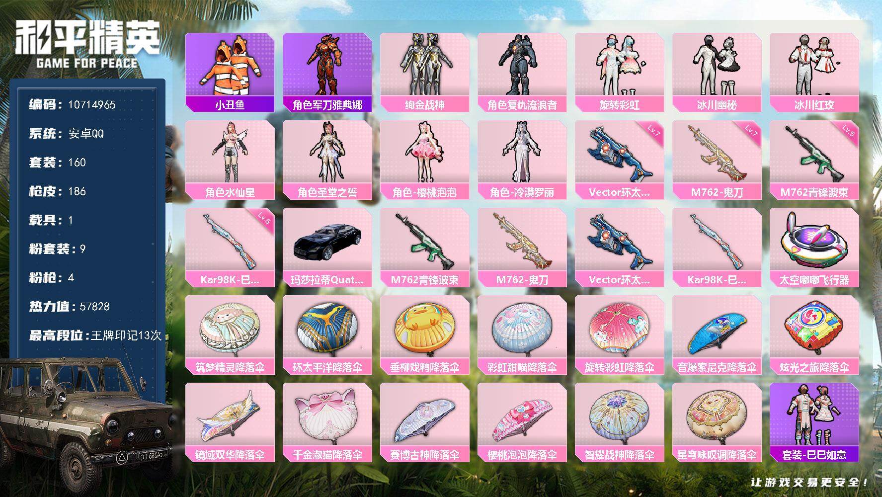 [16747079]【编号71398 可秒换绑】店长推荐特价处理精品号安卓 手q-9粉装-4特效呛-1载具-57828热力值-13印记-160套装-186呛皮 【稀有载具】:玛莎拉蒂quattropte(夜幕蓝) 【特效呛等级】:m762-青锋波束五级,m762-鬼刀七级,vect-环太平洋七级,kar98k-巳巳如意五级 【优质套装】:粉装-绚金战神,角色-复仇流浪者,粉装-旋转彩虹,粉装-冰川幽秘,粉装-冰川红玫,角色-水仙星,角色-圣堂之誓,角色-樱桃泡泡,角色-冷漠罗丽 【稀有套装】:套装-龟仙人,套装-巳巳如意,套装-小鸟芋圆,套装-雏菊兔兔,套装-萝兰蝴蝶,角色-狂花道·雅典娜,套装-糖糖葫芦,套装-青团波波,角色-都市丽猫,套装-燕燕于飞,套装-鱼渊荷华,角色-蜜桃派对,套装-风舞幻音,套装-粉恋花,套装-紫幽梦,套装-蓝冰羽,套装-星影赞美诗,套装-极速光影,套装-云朵鹅,套装-雪绒豹 【优质武器皮肤】:m762-青锋波束,m762-鬼刀,vect-环太平洋,kar98k-巳巳如意 【稀有武器皮肤】:akm-墨染幽兰,akm-环太平洋,akm-筑梦精灵,m16a4-幻世战舞者,m16a4-甜心亚梦,m16a4-莲影清波,scar-l-炫彩节奏,scar-l-玉兔迎春,scar-l-青丘仙客,m416-糯团青竹,m416-红色方程式,m416-蓝色火焰,groza-懵萌河马,groza-田园牧歌,aug-天降萌叽,aug-耀粉歌者,q-彩虹符号,q-洛神天依,q-飞驰魅影,m762-天降萌叽,m762-彩虹符号,m762-云朵鹅,mk47-妙红点点,g36c-懵萌河马,g36c-星穹咏叹调,ac-val-天降萌叽,ac-val-彩虹甜喵,ac-val-甜心亚梦,蜜獾-垂柳戏鸭,蜜獾-天降萌叽,蜜獾-娇憨猪猪,uzi-啾咪啾咪,uzi-墨染幽兰,uzi-天降萌叽,uzi-娇憨猪猪,uzi-幻影飞狐,ump45-涂山之恋,ump45-蓝色火焰,vect-田园牧歌,汤姆逊-天降萌叽,汤姆逊-环太平洋,汤姆逊-耀粉歌者,野牛-天星战神,aks-74u-鬼刀,p90-筑梦精灵,p90-飞驰魅影,p90-巳巳如意,kar98k-彩虹符号,kar98k-王子的夏天,kar98k-飞驰魅影,m24-炫彩节奏,m24-樱桃泡泡,awm-垂柳戏鸭