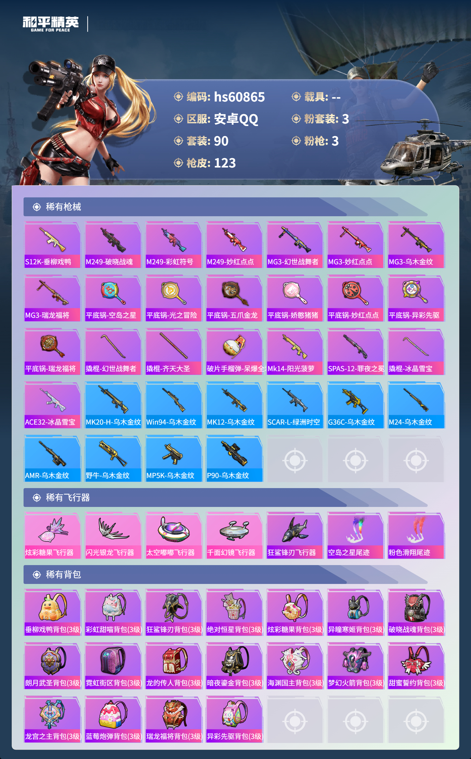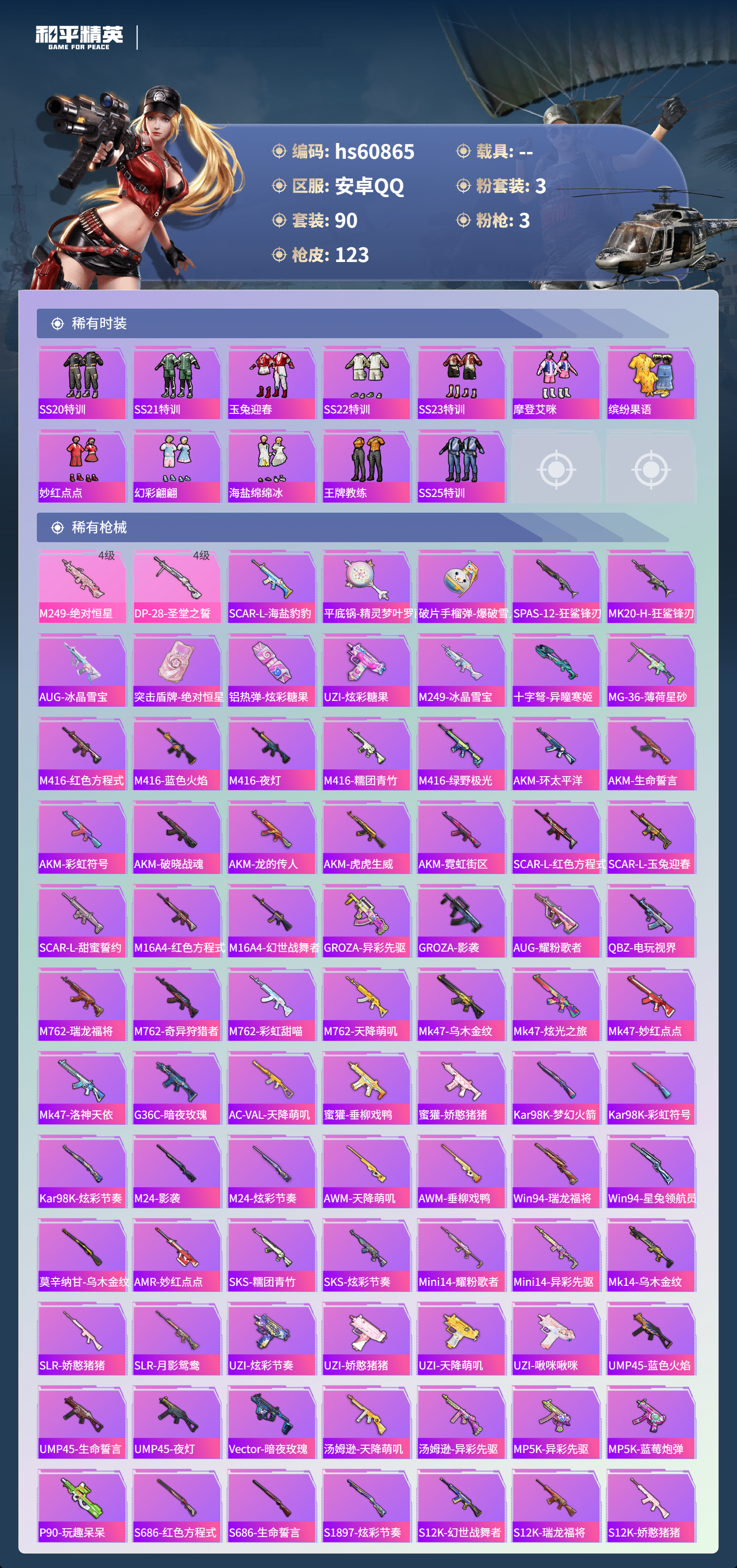 0载具-90套装-123呛皮-hs60865 安卓手q-5王牌印记-3粉装-3特效呛-36717热力值-90套装-123呛皮 【3粉装】套装-星夜魔法师套装-旋转彩虹套装-宝贝奶油派 【3特效呛】m249-绝对恒星/4级dp-28-圣堂之誓/4级mk14-福马献瑞/3级 【4稀有紫装】暗影哥特浪漫天命龟仙人暗夜魅影 【89稀有时装】宝贝奶油派狂鲨锋刃阳光菠萝浪漫天命暗夜魅影龟仙人暗影哥特云魄琉璃炫