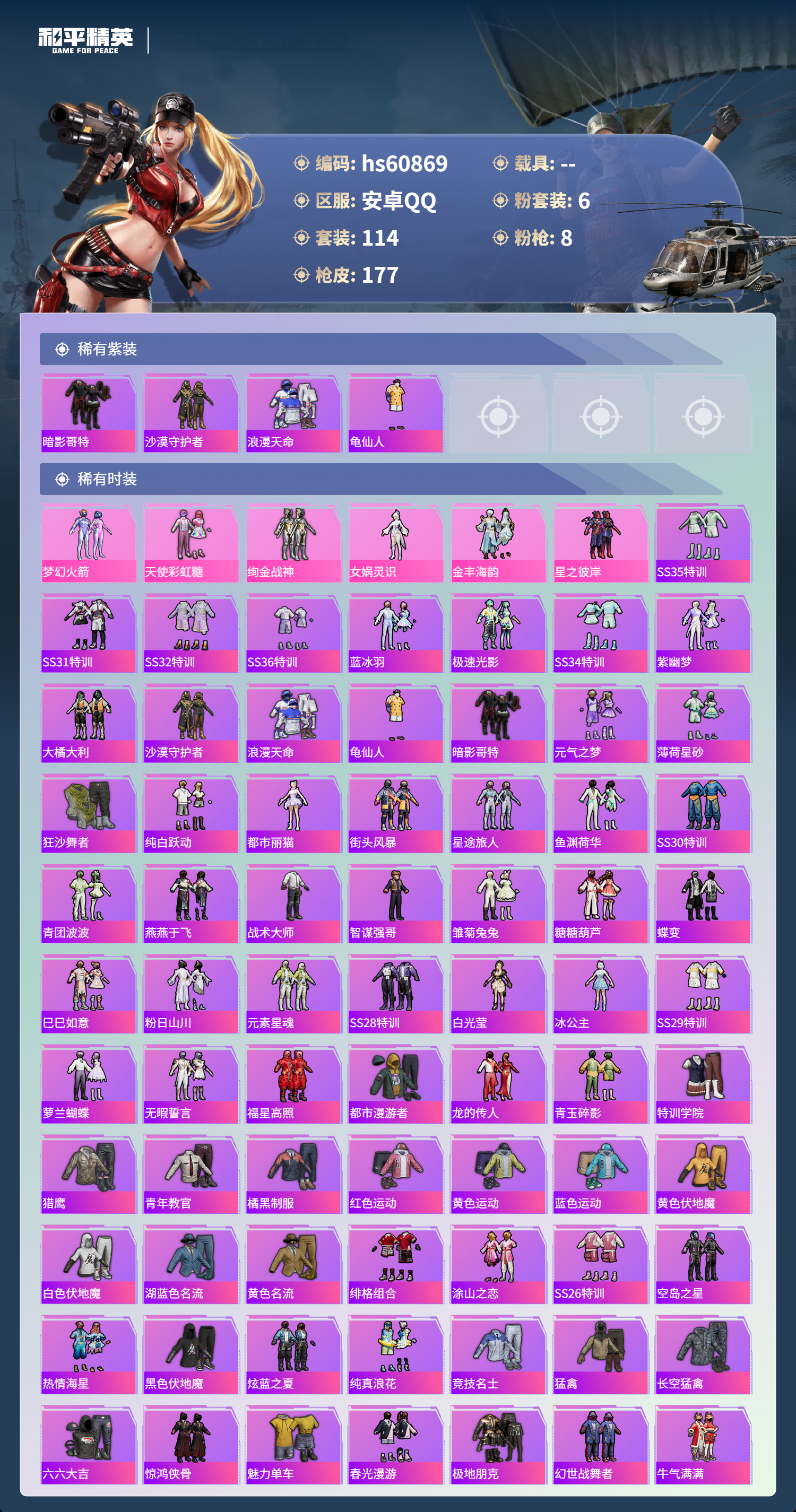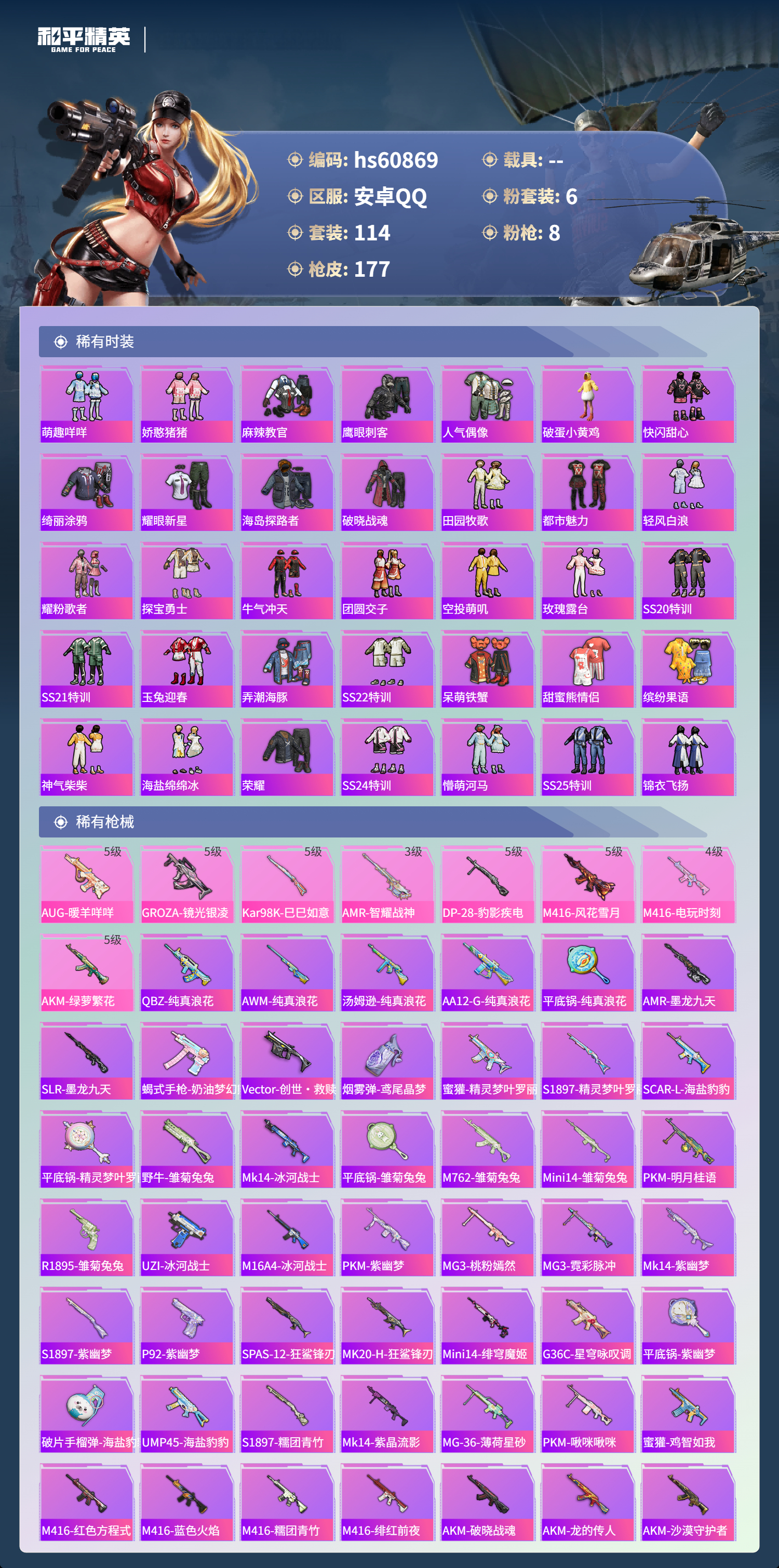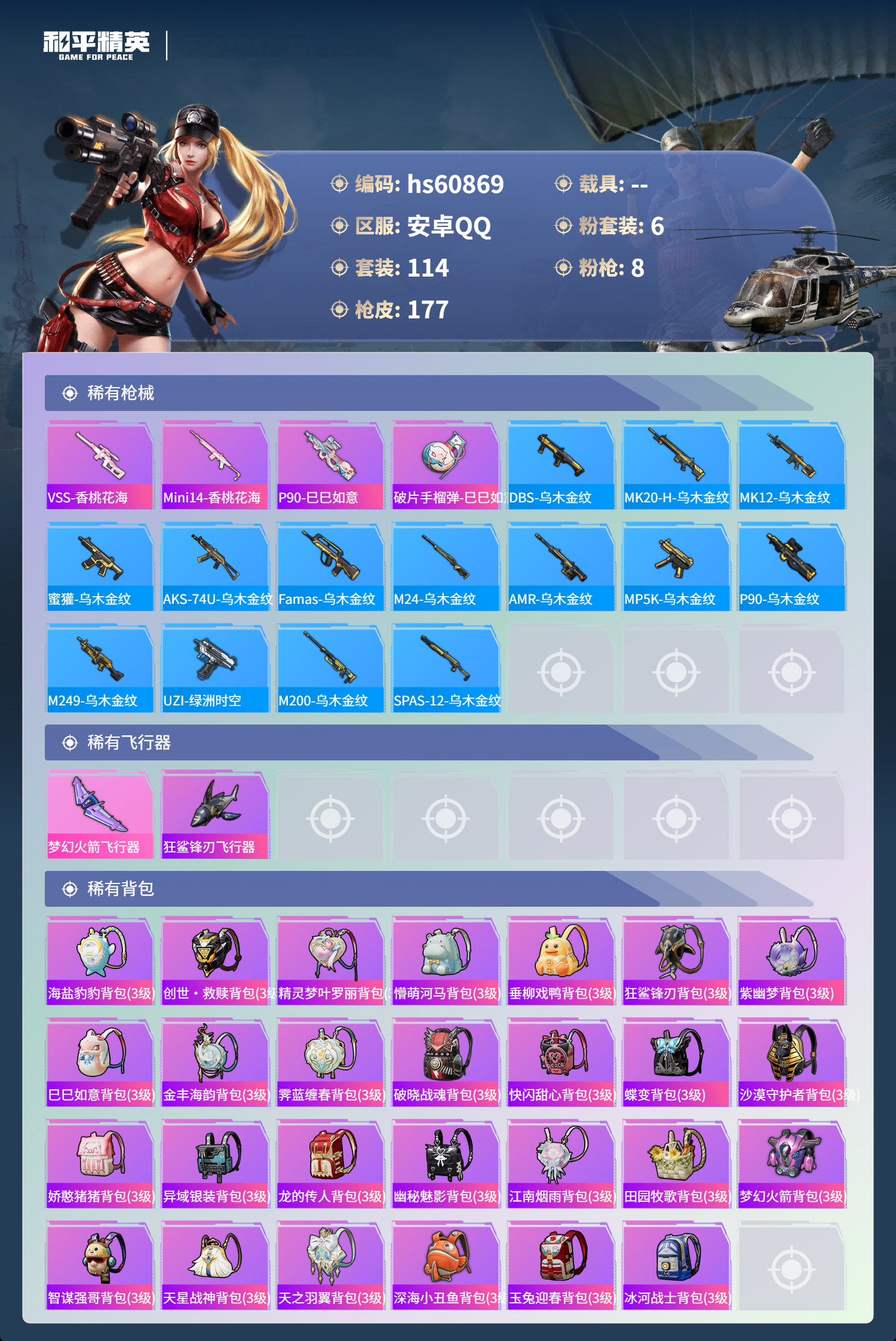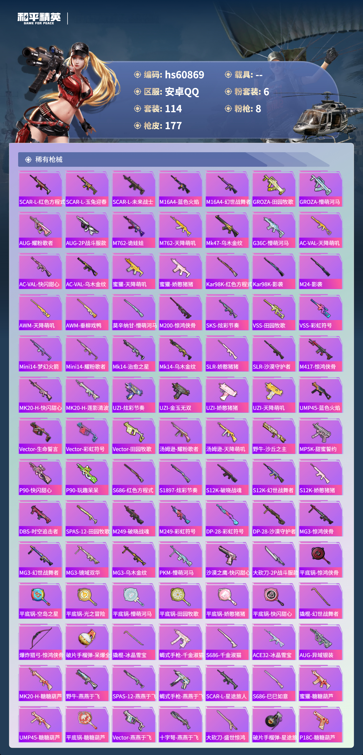 0载具-114套装-177呛皮-hs60869 安卓手q-3王牌印记-6粉装-8特效呛-48415热力值-114套装-177呛皮 【6粉装】套装-金丰海韵套装-绚金战神角色-女娲灵识套装-天使彩虹糖套装-梦幻火箭套装-星之彼岸 【8特效呛】aug-暖羊咩咩/5级dp-28-豹影疾电/5级groza-镜光银凌/5级amr-智耀战神/3级kar98k-巳巳如意/5级akm-绿萝繁花/5级m416-电玩时刻/4级