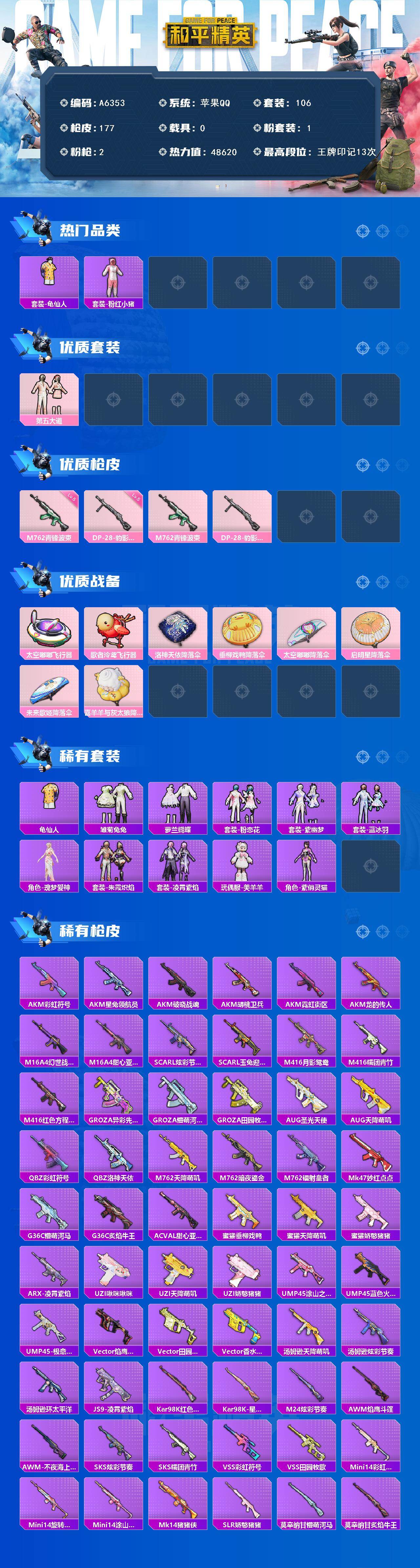 [16748907]苹果 【小号 龟仙人/粉红小猪/m762-青锋波束五级】手q-1粉装-2特效呛-0载具-3粉色飞行器-48620热力值-13王牌印记-106套装-177呛皮 【热门品类】:套装-龟仙人,套装-粉红小猪 【粉色套装】:粉装-第五大道 【粉色呛皮等级】:m762-青锋波束五级,dp-28-豹影疾电五级 【粉色呛皮】:m762-青锋波束,dp-28-豹影疾电 【粉色飞行器】:太空嘟嘟飞行器,歌者泠鸢飞行器 【粉色降落伞】:洛神天依降落伞,垂柳戏鸭降落伞,太空嘟嘟降落伞,启明星降落伞,未来歌姬降落伞,喜羊羊与灰太狼降落伞,炫彩糖果降落伞 【稀有套装】:套装-龟仙人,套装-雪国风尚,套装-炫彩糖果,套装-雏菊兔兔,套装-萝兰蝴蝶,套装-粉恋花,套装-紫幽梦,套装-蓝冰羽,角色-瑰梦爱神,套装-朱霞炽焰,套装-凌霄紫焰,玩偶服-美羊羊,角色-紫俏灵猫 【稀有呛皮】:aug-冰晶雪宝,akm-彩虹符号,akm-星兔领航员,akm-破晓战魂,akm-胡桃卫兵,akm-霓虹街区,akm-龙的传人,m16a4-幻世战舞者,m16a4-甜心亚梦,scar-l-炫彩节奏,scar-l-玉兔迎春,m416-月影鸳鸯,m416-糯团青竹,m416-红色方程式,groza-异彩先驱,groza-懵萌河马,groza-田园牧歌,aug-圣光天使,aug-天降萌叽,q-彩虹符号,q-洛神天依,m762-天降萌叽,m762-暗夜鎏金,m762-镭射皇者,mk47-妙红点点,g36c-懵萌河马,g36c-炙焰牛王,ac-val-甜心亚梦,蜜獾-垂柳戏鸭,蜜獾-天降萌叽,蜜獾-娇憨猪猪,arx-凌霄紫焰,uzi-啾咪啾咪,uzi-天降萌叽,uzi-娇憨猪猪,ump45-涂山之恋,ump45-蓝色火焰,ump45-极意拳锋,vect-焰鹰斗篷,vect-田园牧歌,vect-香水柠檬,汤姆逊-天降萌叽,汤姆逊-炫彩节奏,汤姆逊-环太平洋,js9-凌霄紫焰,kar98k-红色方程式,kar98k-星穹咏叹调,m24-炫彩节奏,awm-焰鹰斗篷,awm-不夜海上花,sks-炫彩节奏,sks-糯团青竹,vss-彩虹符号,vss-田园牧歌,mini14-彩虹嘻嘻猴,mini14-旋转彩虹,mini14-涂山之恋,mk14-猪猪侠,slr-娇憨猪猪,莫辛纳甘-懵萌河马,莫辛纳甘-炙焰牛