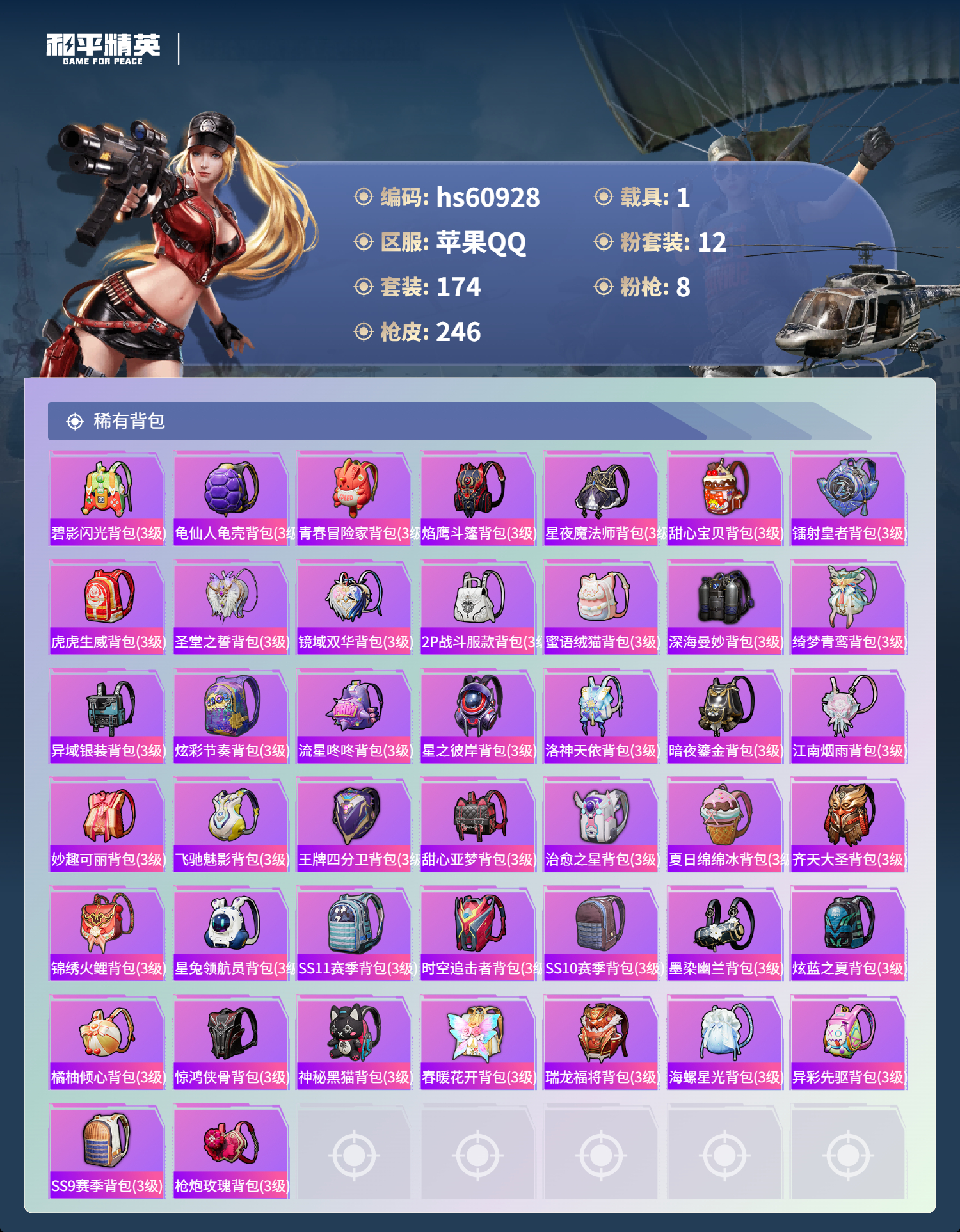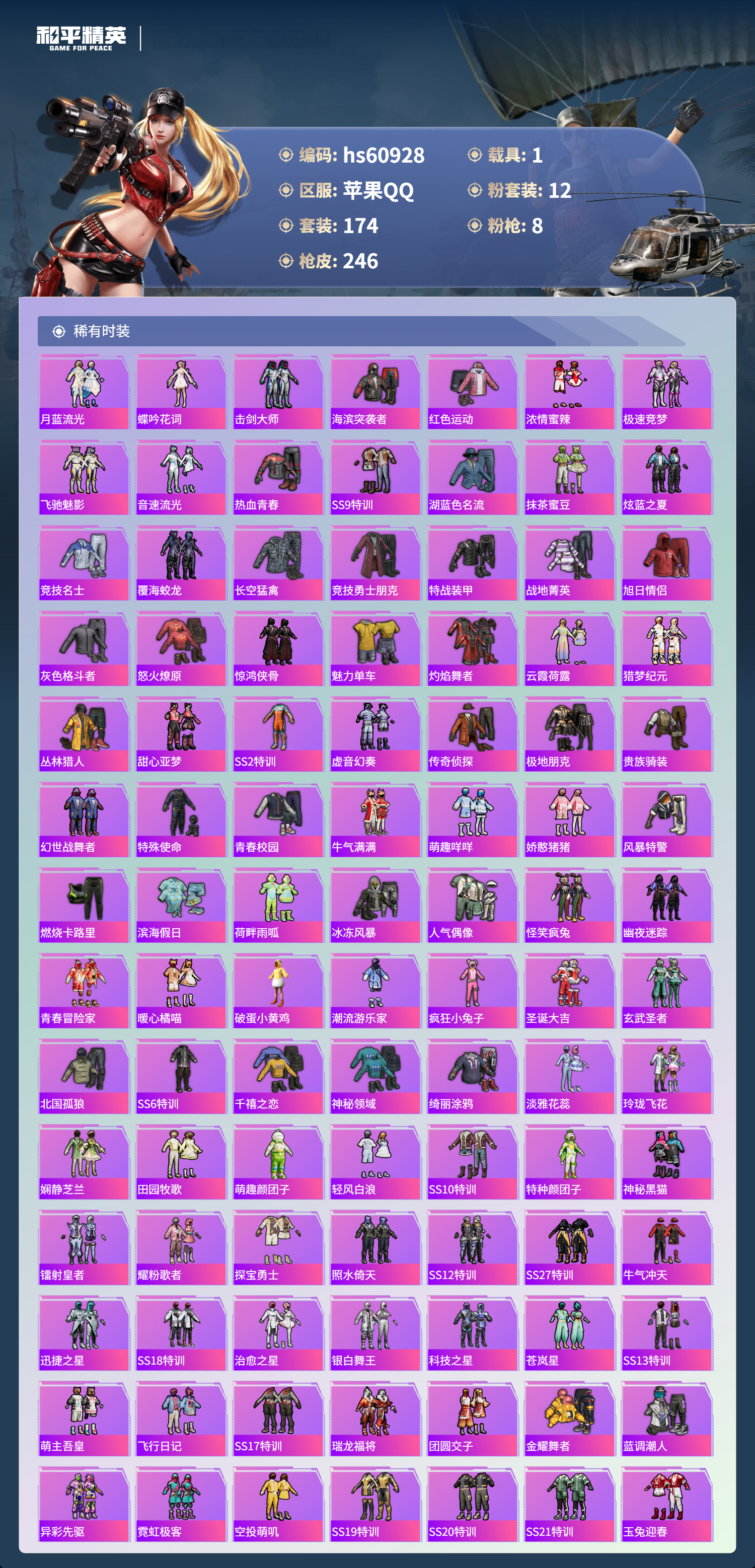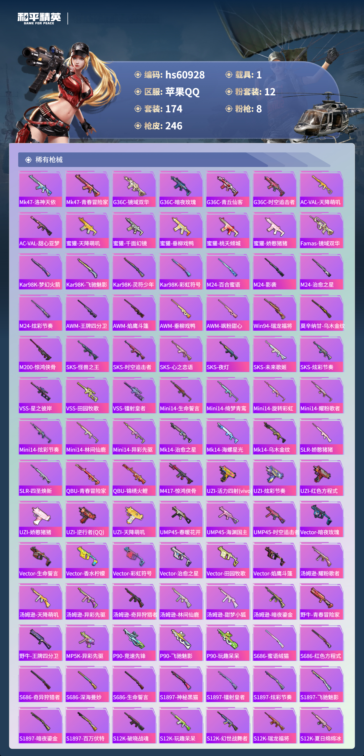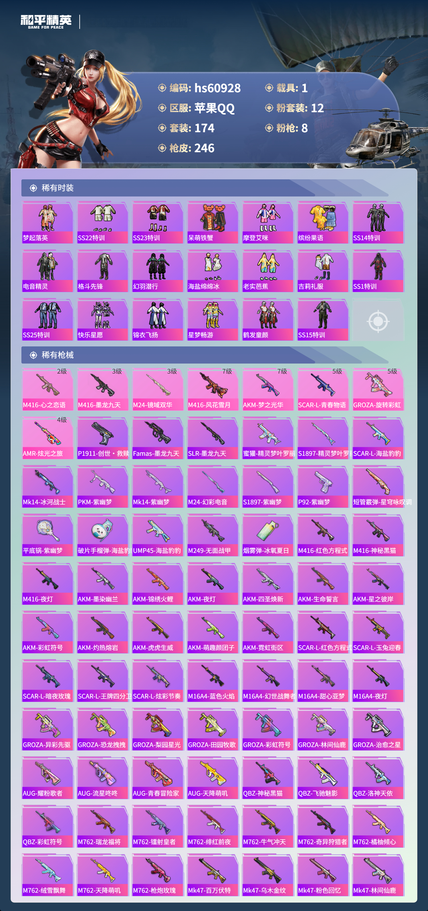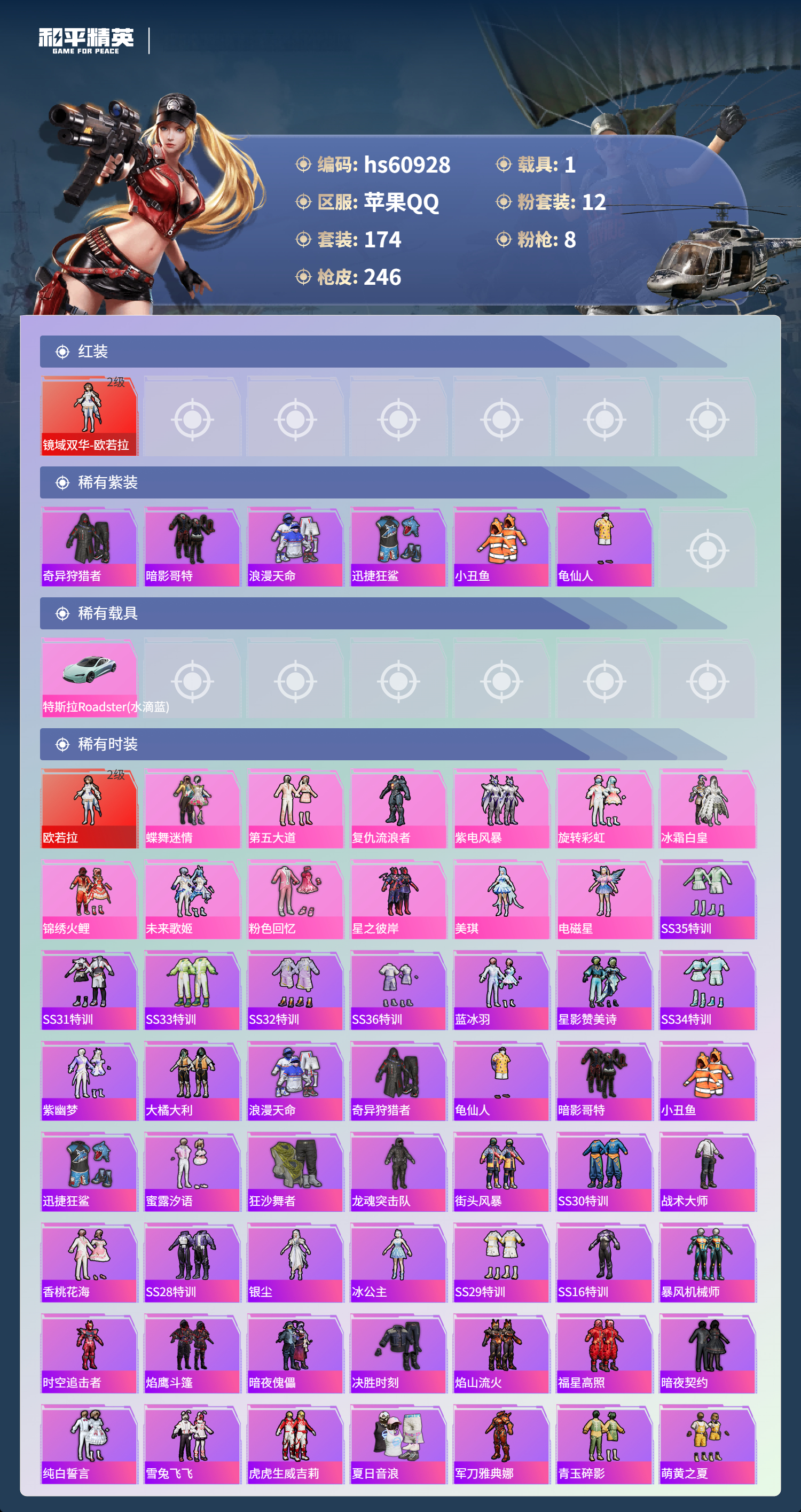 2450957苹果手q-10王牌印记-1红装-12粉装-8特效呛-1载具-89041热力值-174套装-246呛皮 【1红装】镜域双华-欧若拉/2级 【12粉装】套装-紫电风暴套装-粉色回忆角色-美琪套装-第五大道角色-复仇流浪者套装-旋转彩虹角色-电磁星套装-未来歌姬套装-锦绣火鲤套装-蝶舞迷情套装-冰霜白皇套装-星之彼岸 【8特效呛】m24-镜域双华/3级sc