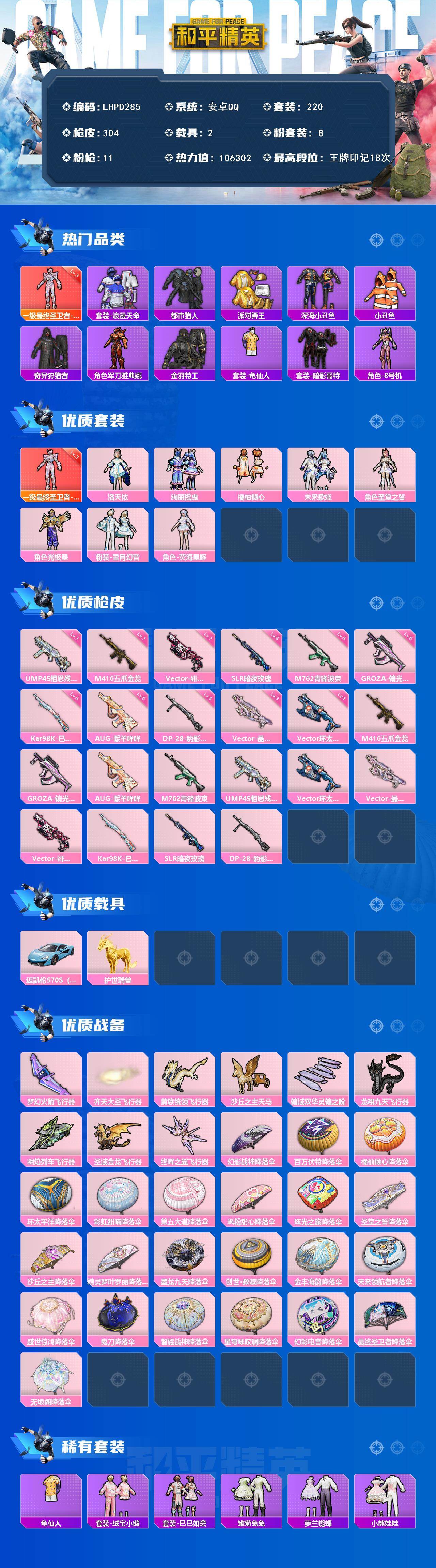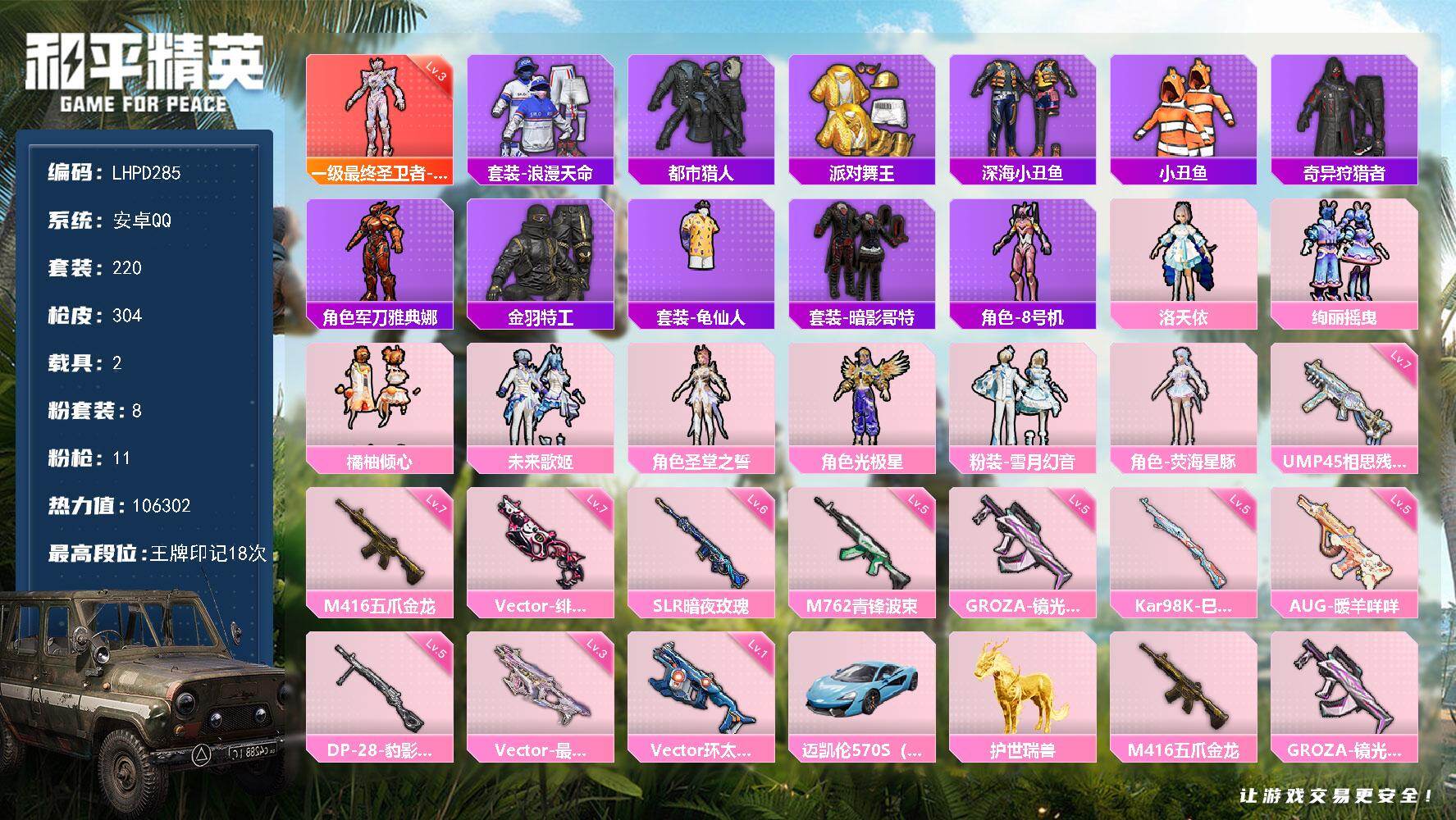 [16636916]【店主推荐捡漏号!可直接换绑】安卓 手q-1神装-8粉装-11特效呛-2载具-10粉色飞行器-106302热力值-18王牌印记-220套装-304呛皮【红色神装等级】:最终圣卫者-帕修斯三级【红色角色神装】:最终圣卫者-帕修斯【热门品类】:套装-浪漫天命,套装-都市猎人,套装-派对舞王,套装-深海小丑鱼,套装-小丑鱼,套装-奇异狩猎者,角色-军刀雅典娜,套装-金羽特工,套装-龟仙人,套装-暗影哥特,角色-8号机【粉色套装】:角色-洛天依,粉装-绚丽摇曳,粉装-橘柚倾心,粉装-未来歌姬,角色-圣堂之誓,角色-光极星,粉装-雪月幻音,角色-荧海星豚【粉色呛皮等级】:m416-五爪金龙七级,groza-镜光银凌五级,aug-暖羊咩咩五级,m762-青锋波束五级,ump45-相思残雪七级,vect-环太平洋一级,vect-最终圣卫者三级,vect-绯穹魔姬七级,kar98k-巳巳如意五级,slr-暗夜玫瑰六级,dp-28-豹影疾电五级【粉色载具】:迈凯伦570s(天际蓝),护世瑞兽【粉色呛皮】:m416-五爪金龙,groza-镜光银凌,aug-暖羊咩咩,m762-青锋波束,ump45-相思残雪,vect-环太平洋,vect-最终圣卫者,vect-绯穹魔姬,kar98k-巳巳如意,slr-暗夜玫瑰,dp-28-豹影疾【粉色飞行器】:梦幻火箭飞行器,齐天大圣飞行器,黄族统领飞行器,沙丘之主天马,镜域双华-灵镜之阶,龙翔九天飞行器,幽焰列车飞行器,圣域金龙飞行器,终晖之翼飞行器