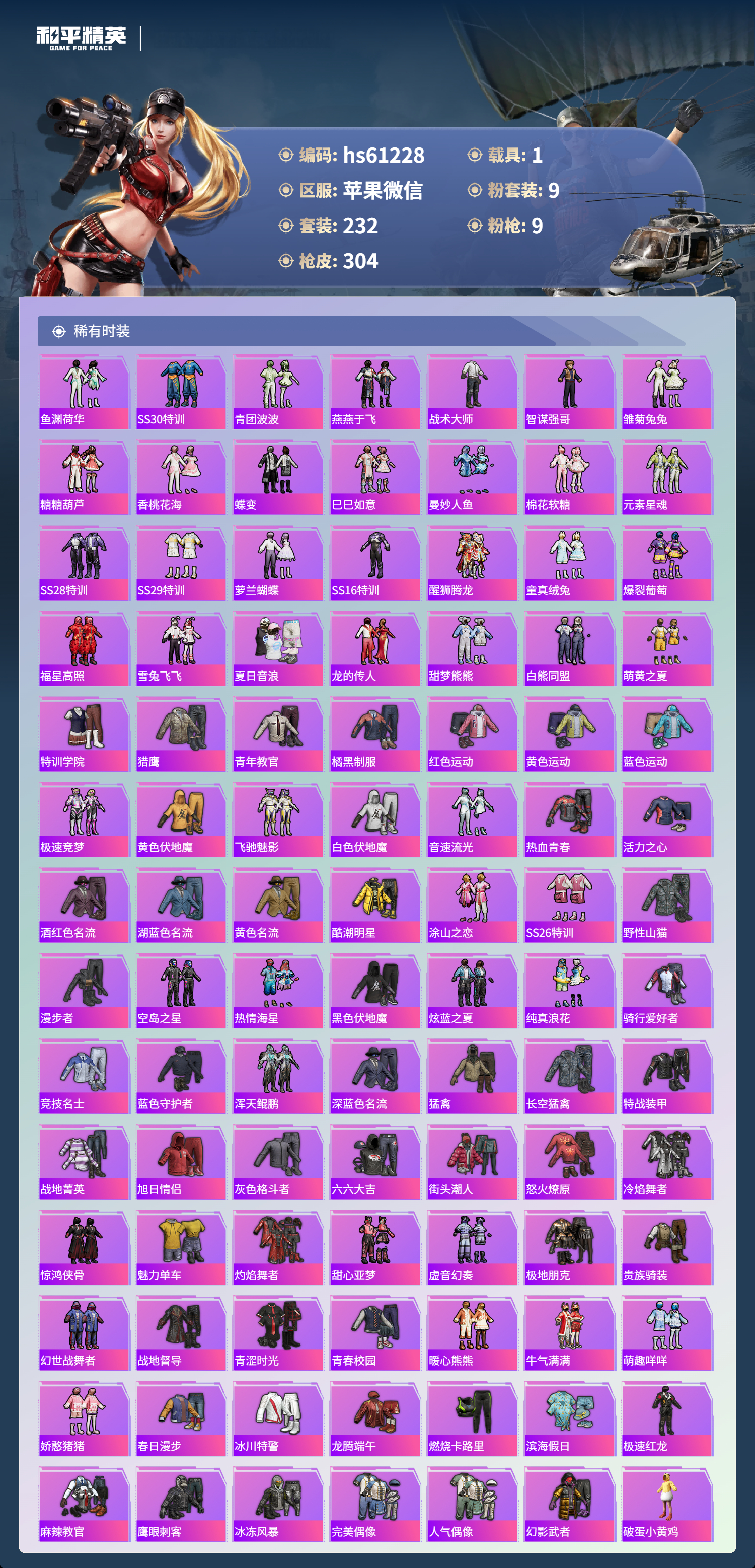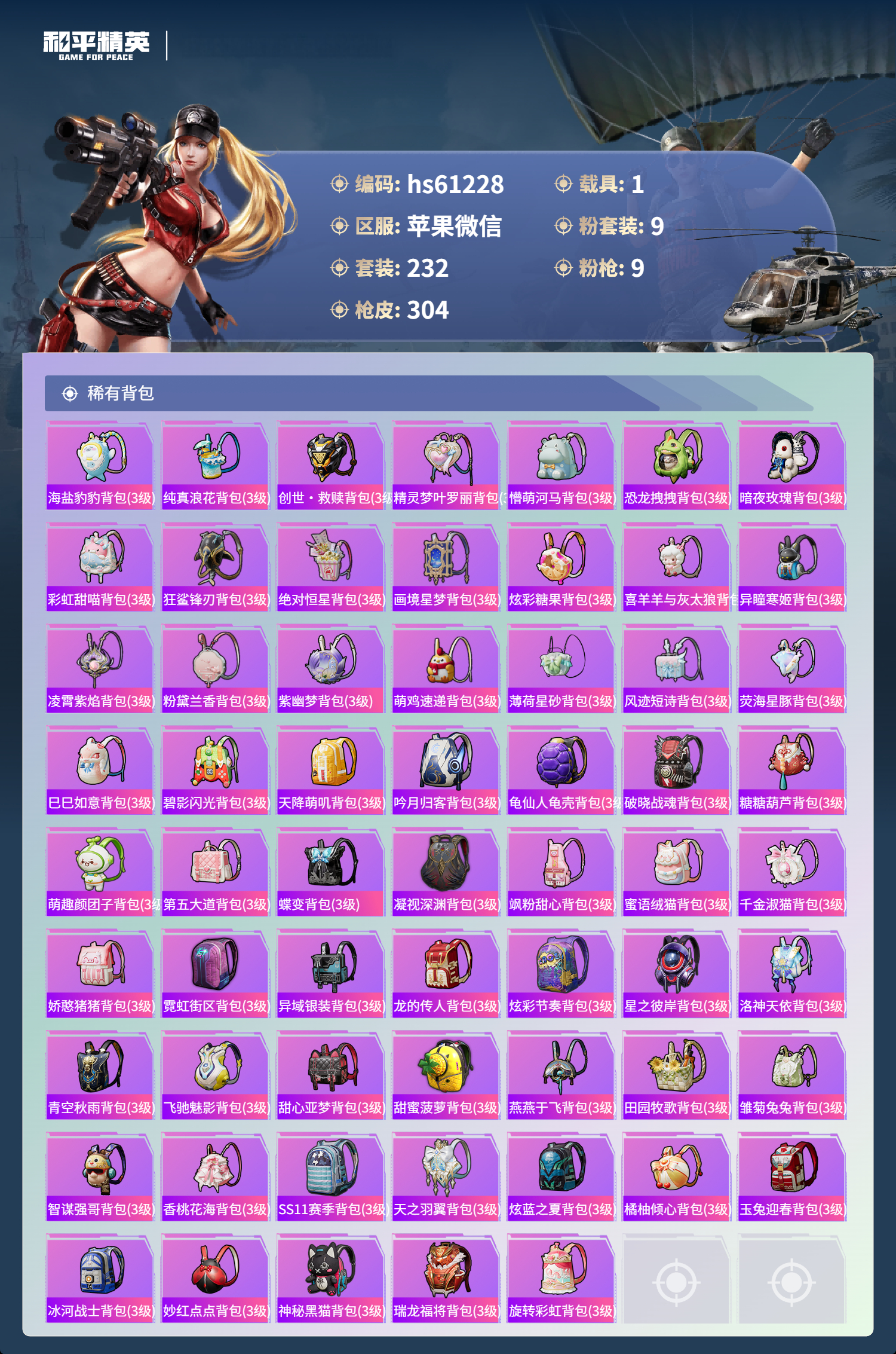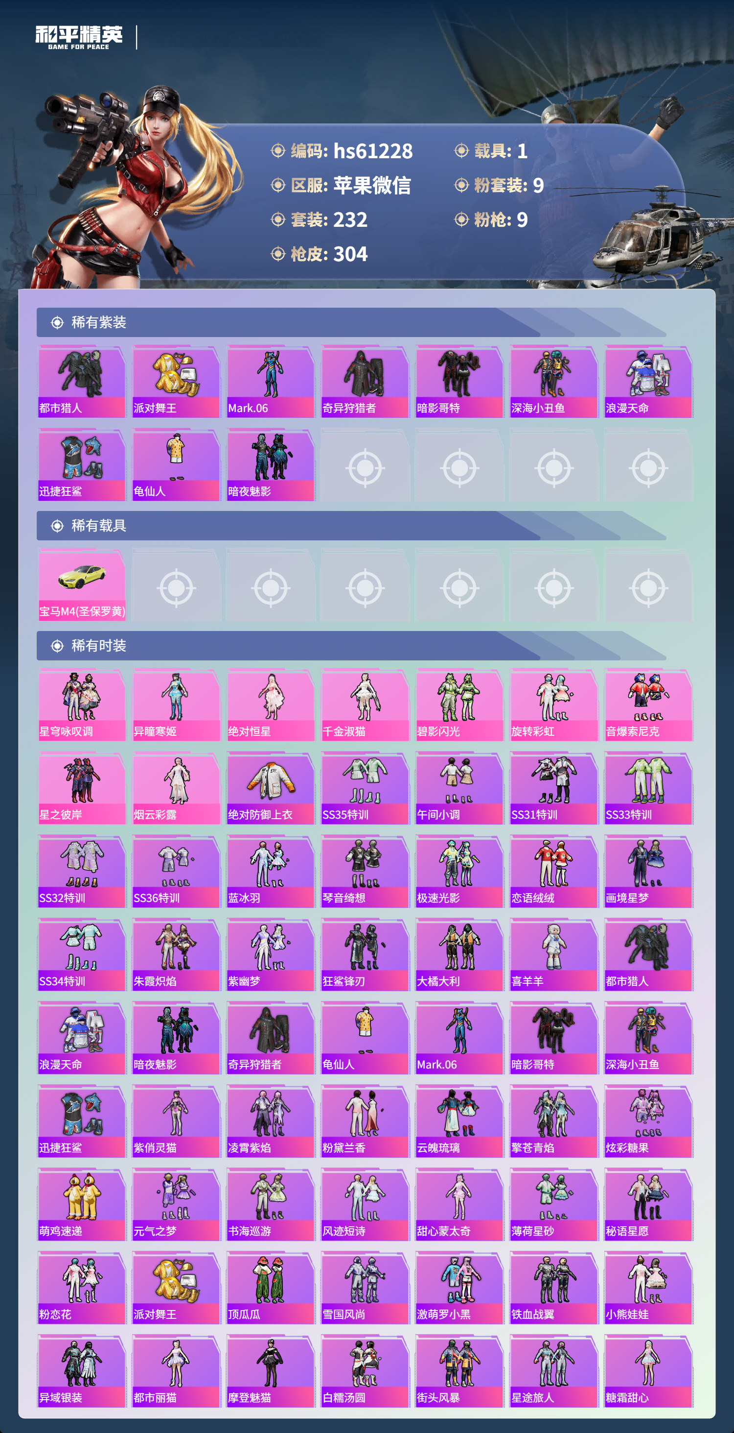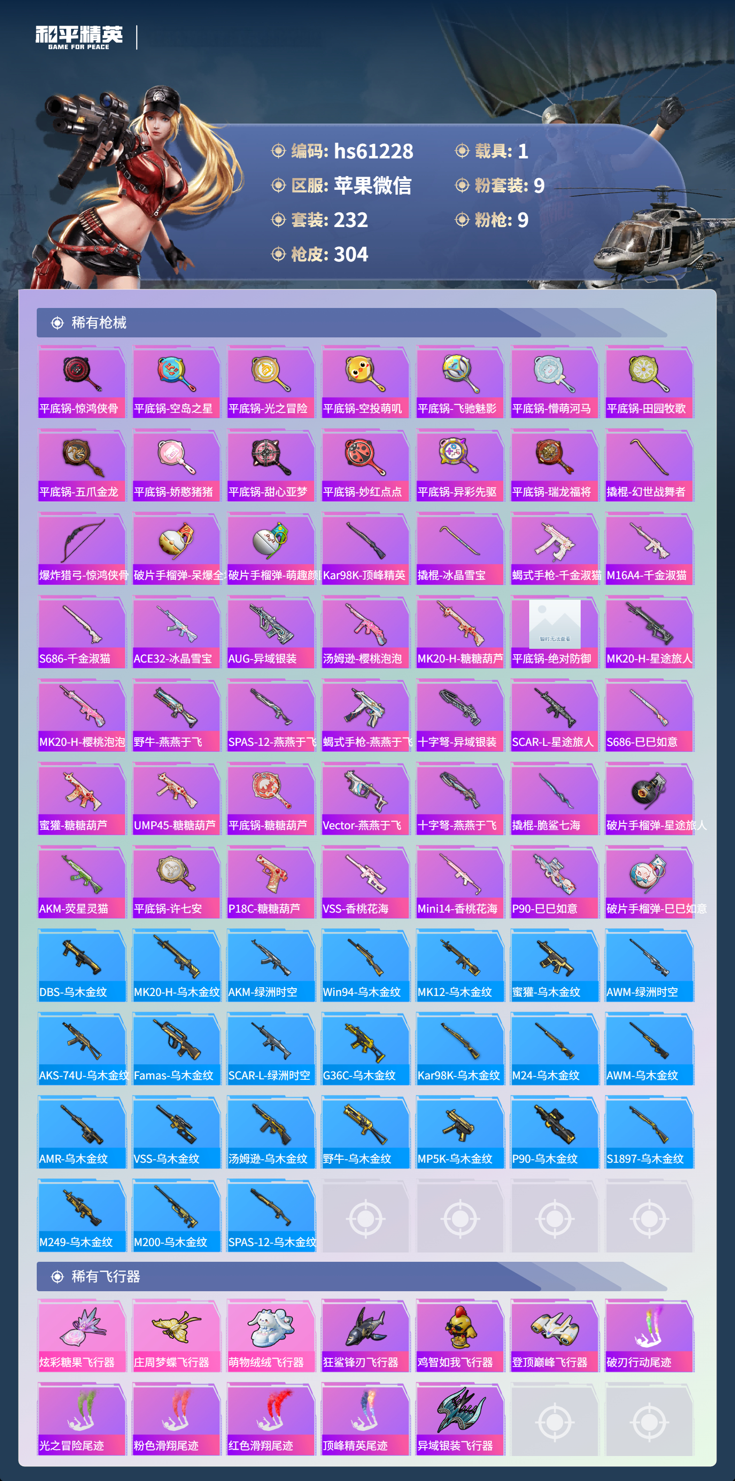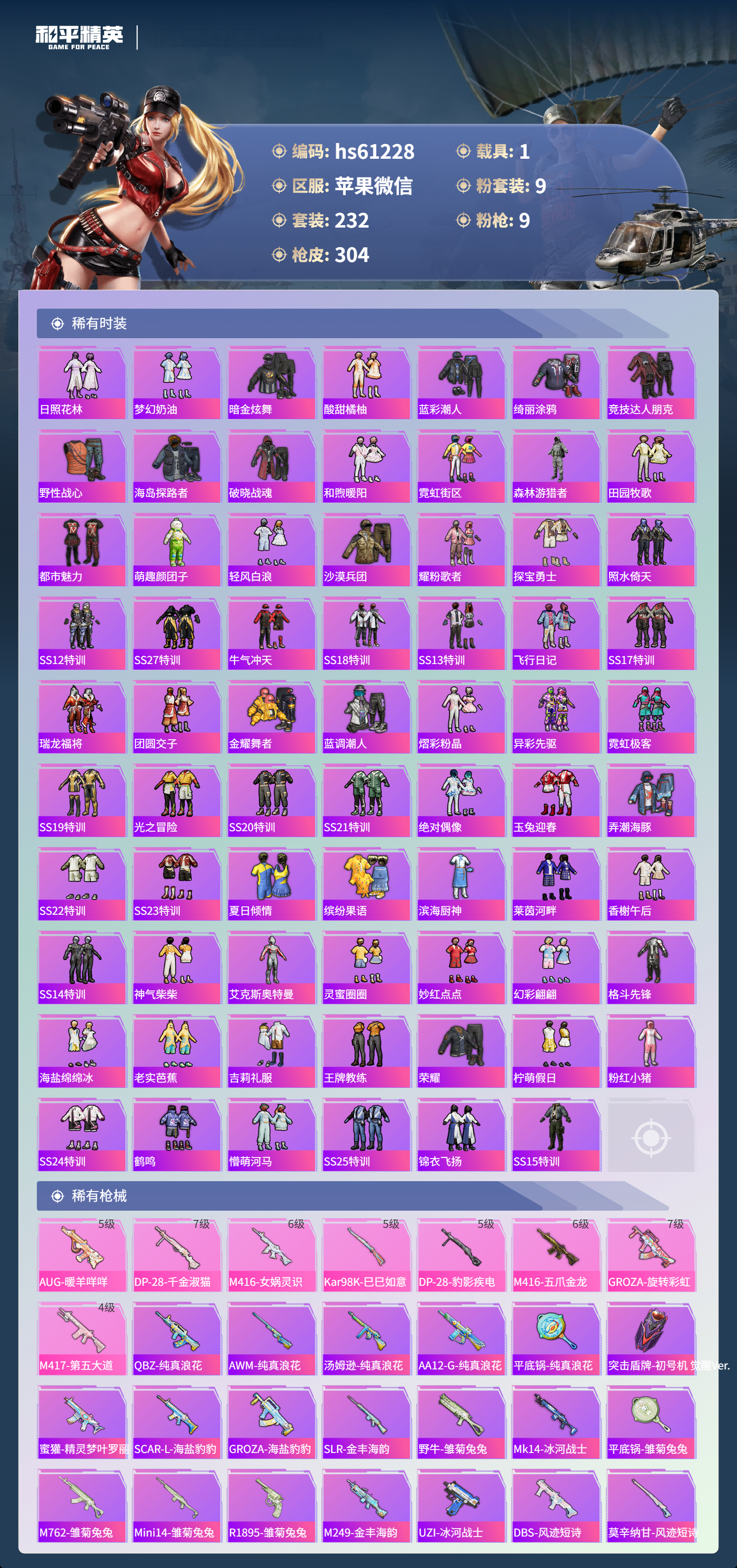 1载具-232套装-304呛皮-hs61228 苹果微信-21王牌印记-9粉装-9特效呛-1载具-热力值-232套装-304呛皮-3卓越印记-2传奇印记 【9粉装】角色-千金淑猫套装-旋转彩虹角色-烟云彩露角色-绝对恒星角色-异瞳寒姬套装-星穹咏叹调套装-音爆索尼克套装-碧影闪光套装-星之彼岸 【9特效呛】dp-28-千金淑猫/7级kar98k-巳巳如意/5级aug-暖羊咩咩/5级mk14-福马