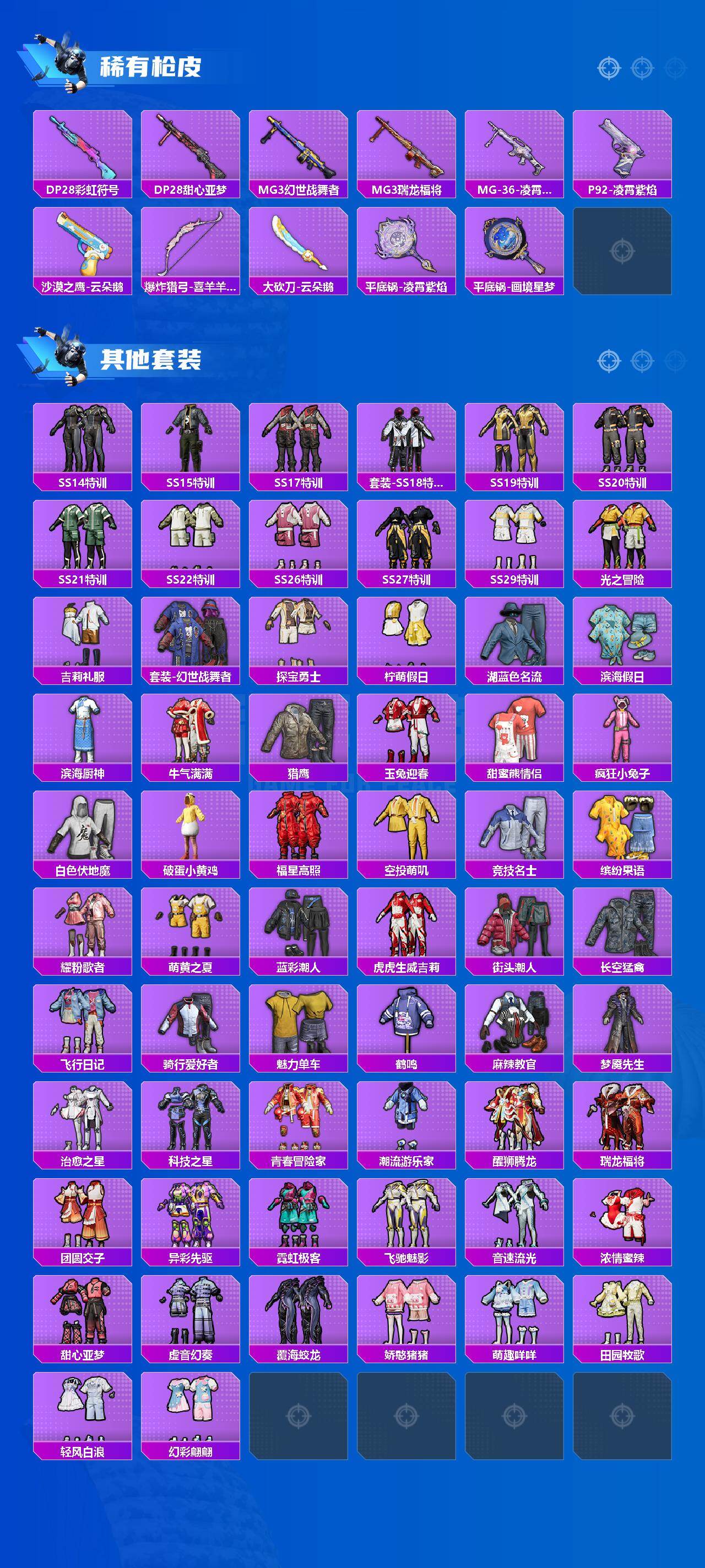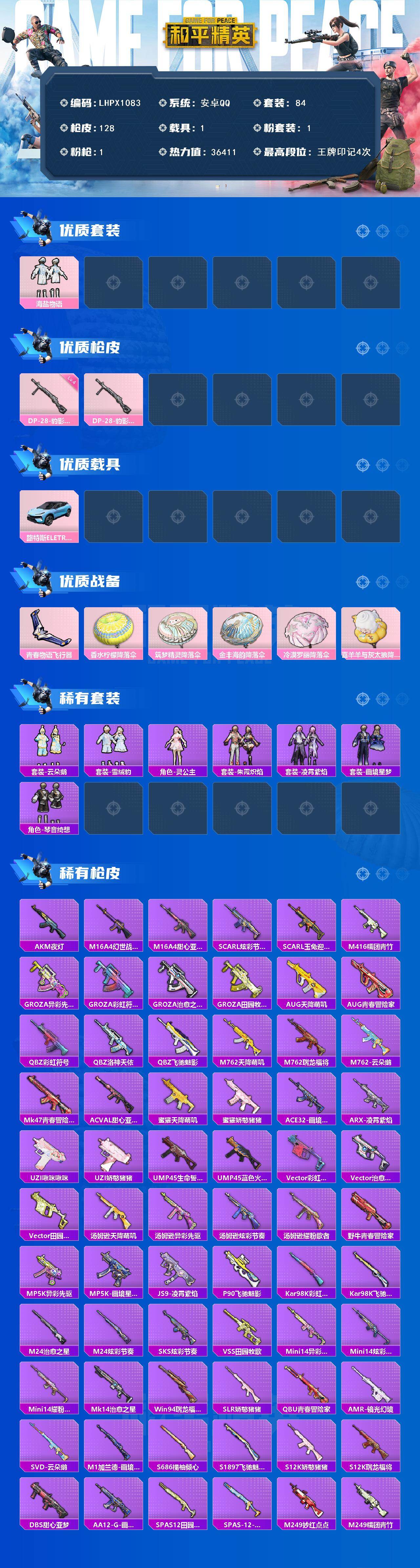 [16754302]【特价出售/店主推荐】安卓 手q-1粉装-1特效呛-1载具-1粉色飞行器-36411热力值-4王牌印记-84套装-128呛皮 【粉色套装】:粉装-海盐物语 【粉色呛皮等级】:dp-28-豹影疾电四级 【粉色载具】:路特斯eletre(冰川蓝) 【粉色呛皮】:dp-28-豹影疾电 【粉色飞行器】:青春物语飞行器 【粉色降落伞】:香水柠檬降落伞,筑梦精灵降落伞,金丰海韵降落伞,冷漠罗丽降落伞,喜羊羊与灰太狼降落伞 【稀有套装】:套装-云朵鹅,套装-雪绒豹,角色-灵公主,套装-朱霞炽焰,套装-凌霄紫焰,套装-画境星梦,套装-琴音绮想 【稀有呛皮】:akm-夜灯,m16a4-幻世战舞者,m16a4-甜心亚梦,scar-l-炫彩节奏,scar-l-玉兔迎春,m416-糯团青竹,groza-异彩先驱,groza-彩虹符号,groza-治愈之星,groza-田园牧歌,aug-天降萌叽,aug-青春冒险家,q-彩虹符号,q-洛神天依,q-飞驰魅影,m762-天降萌叽,m762-瑞龙福将,m762-云朵鹅,mk47-青春冒险家,ac-val-甜心亚梦,蜜獾-天降萌叽,蜜獾-娇憨猪猪,ace32-画境星梦,arx-凌霄紫焰,uzi-啾咪啾咪,uzi-娇憨猪猪,ump45-生命誓言,ump45-蓝色火焰,vect-彩虹符号,vect-治愈之星,vect-田园牧歌,汤姆逊-天降萌叽,汤姆逊-异彩先驱,汤姆逊-炫彩节奏,汤姆逊-耀粉歌者,野牛-青春冒险家,mp5k-异彩先驱,mp5k-画境星梦,js9-凌霄紫焰,p90-飞驰魅影,kar98k-彩虹符号,kar98k-飞驰魅影,m24-治愈之星,m24-炫彩节奏,sks-炫彩节奏,vss-田园牧歌,mini14-异彩先驱,mini14-炫彩节奏,mini14-耀粉歌者,mk14-治愈之星,win94-瑞龙福将,slr-娇憨猪猪,qbu-青春冒险家,amr-镜光幻境,svd-云朵鹅,m1加兰德-画境星梦,s686-橘柚倾心,s1897-飞驰魅影,s12k-瑞龙福将,s12k-娇憨猪猪,dbs-甜心亚梦,aa12-g-画境星梦,spas-12-田园牧歌,spas-12-云朵鹅,m249-妙红点点,m249-糯团青竹,dp-28-彩虹符号,dp-28-甜心亚梦,mg3-幻世战舞者,mg3-瑞龙福将,mg-36-凌霄紫焰
