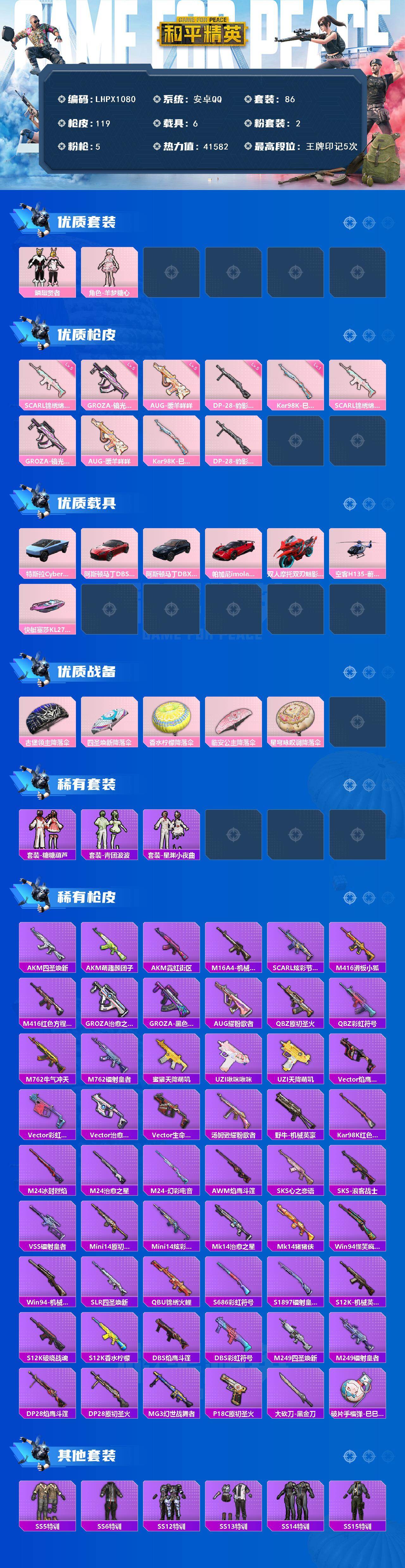 [16754336]安卓 手q-2粉装-5特效呛-6载具-0粉色飞行器-41582热力值-5王牌印记-86套装-119呛皮【粉色套装】:粉装-鳞翅贤者,角色-羊梦糖心【粉色呛皮等级】:scar-l-锦绣绵绵五级,groza-镜光银凌五级,aug-暖羊咩咩五级,kar98k-巳巳如意一级,dp-28-豹影疾电五级【粉色载具】:特斯拉cybertruck(荒芜蓝),阿斯顿马丁dbs(红),阿斯顿马丁dbx(蓝),帕加尼imola(光影红),双人摩托-双刃魅影(红),空客h135-蔚蓝之翼,快艇-塞莎kl27(霓虹粉)【粉色呛皮】:scar-l-锦绣绵绵,groza-镜光银凌,aug-暖羊咩咩,kar98k-巳巳如意,dp-28-豹影疾电