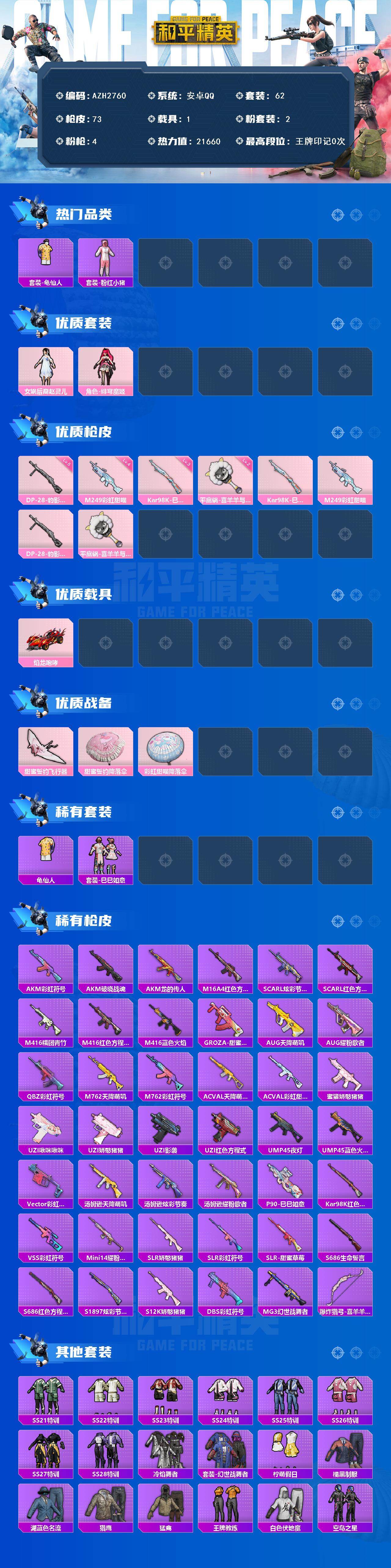 1载具-62套装-73呛皮-安卓 手q【赵灵儿 绯穹魔姬 1载具】2粉装-4特效呛-1载具-1粉色飞行器-21660热力值-1王牌印记-62套装-73呛皮 【热门品类】:套装-龟仙人,套装-粉红小猪 【粉色套装】:女娲后裔-赵灵儿,角色-绯穹魔姬 【粉色呛皮等级】:kar98k-巳巳如意三级,m249-彩虹甜喵四级,dp-28-豹影疾电五级,平底锅-喜羊羊与灰太狼二级 【粉色载具】:焰龙咆哮 【粉色呛皮】