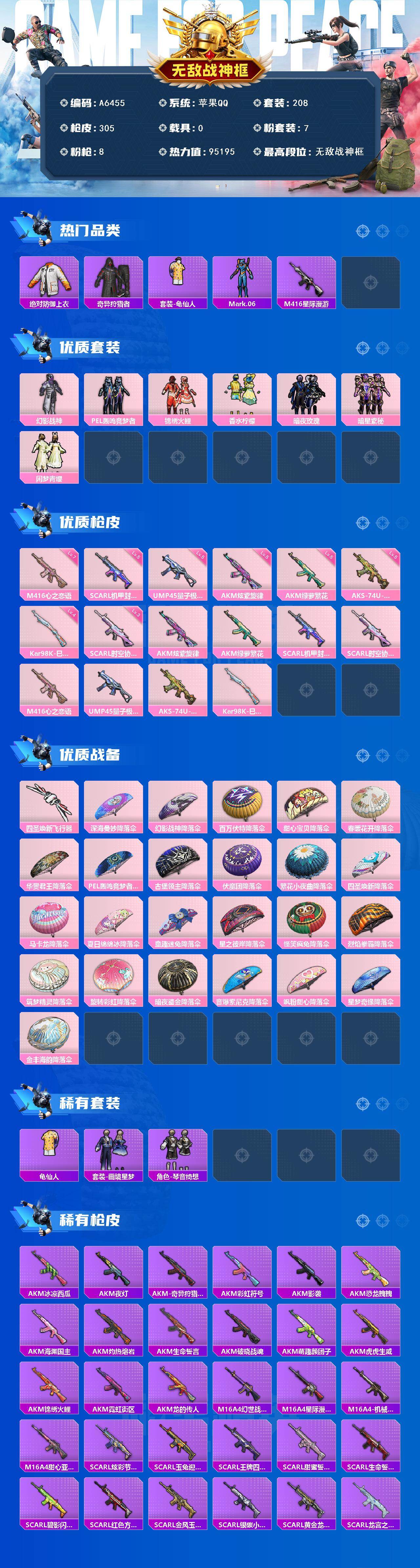 [16761401]苹果 【男神号 绝对防御上衣/奇异狩猎者/龟仙人/mark.06/m416-星际漫游/akm-炫紫旋律五级/m416-心之恋语七级】手q-无敌战神框-7粉装-8特效呛-0载具-1粉色飞行器-95195热力值-19王牌印记-208套装-305呛皮 【热门品类】:绝对防御上衣,套装-奇异狩猎者,套装-龟仙人,角色-mark.06,m416-星际漫游 【粉色套装】:粉装-幻影战神,粉装-pel轰鸣竞梦者,粉装-锦绣火鲤,粉装-香水柠檬,粉装-暗夜玫瑰,粉装-暗星紫秘,粉装-闲梦青缨 【粉色呛皮等级】:akm-炫紫旋律五级,akm-绿萝繁花五级,scar-l-机甲封神五级,scar-l-时空协奏三级,m416-心之恋语七级,ump45-量子极限五级,aks-74u-森灵之息五级,kar98k-巳巳如意四级 【粉色呛皮】:akm-炫紫旋律,akm-绿萝繁花,scar-l-机甲封神,scar-l-时空协奏,m416-心之恋语,ump45-量子极限,aks-74u-森灵之息,kar98k-巳巳如意 【粉色飞行器】:四圣焕新飞行器 【粉色降落伞】:深海曼妙降落伞,幻影战神降落伞,百万伏特降落伞,甜心宝贝降落伞,春暖花开降落伞,华贵君王降落伞,pel轰鸣竞梦者降落伞,古堡领主降落伞,伏魔团降落伞,繁花小夜曲降落伞,四圣焕新降落伞,马卡龙降落伞,夏日绵绵冰降落伞,童趣迷兔降落伞,星之彼岸降落伞,怪笑疯兔降落伞,烈焰拳霸降落伞,筑梦精灵降落伞,旋转彩虹降落伞,暗夜鎏金降落伞,音爆索尼克降落伞,飒粉甜心降落伞,星梦奇缘降落伞,金丰海韵降落伞 【稀有套装】:套装-龟仙人,套装-画境星梦,套装-琴音绮想 【稀有呛皮】:akm-冰凉西瓜,akm-夜灯,akm-奇异狩猎者,akm-彩虹符号,akm-影袭,akm-恐龙拽拽,akm-海渊国主,akm-灼热熔岩,akm-生命誓言,akm-破晓战魂,akm-萌趣颜团子,akm-虎虎生威,akm-锦绣火鲤,akm-霓虹街区,akm-龙的传人,m16a4-幻世战舞者,m16a4-星际漫游,m16a4-机械英豪,m16a4-甜心亚梦,scar-l-炫彩节奏,scar-l-玉兔迎春,scar-l-王牌四分卫,scar-l-甜蜜誓约,scar-l-生命誓言,scar-l-碧影闪光,scar-l-红色方程式,scar-l-金