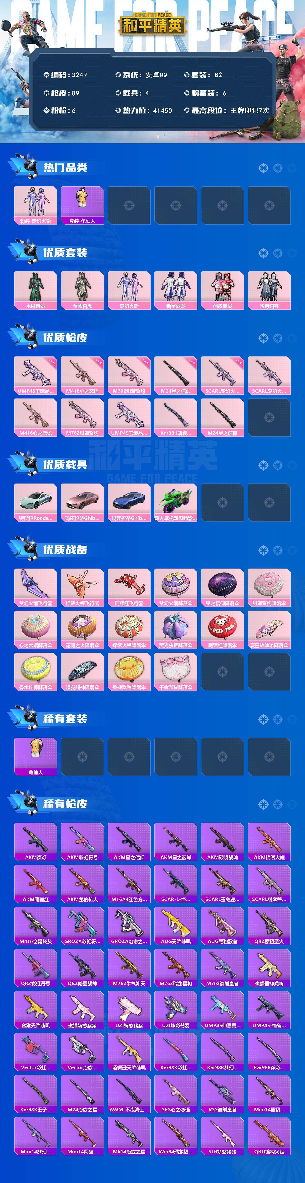 4载具-82套装-89呛皮-82套装/呛械6/装备108/载具4/战备69/王牌印记7/热力值41450/四级scar-l-梦幻火箭/四级m416-心之恋语/四级m762-甜蜜誓约/六级ump45-玉魂晶魄/四级m24-星之信仰/粉装-梦幻火箭/套装-龟仙人/木曜青龙/金曜白虎/梦幻火箭/新星烈龙/俏皮狐尾/粉装-吟月归客/特斯拉roadster水滴蓝/玛莎拉蒂ghibli粉/玛莎拉蒂ghibli蓝/双人摩托