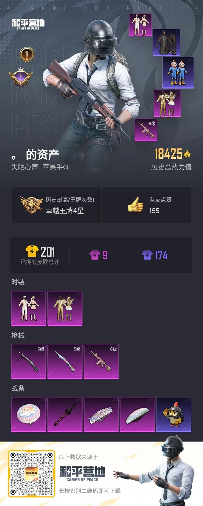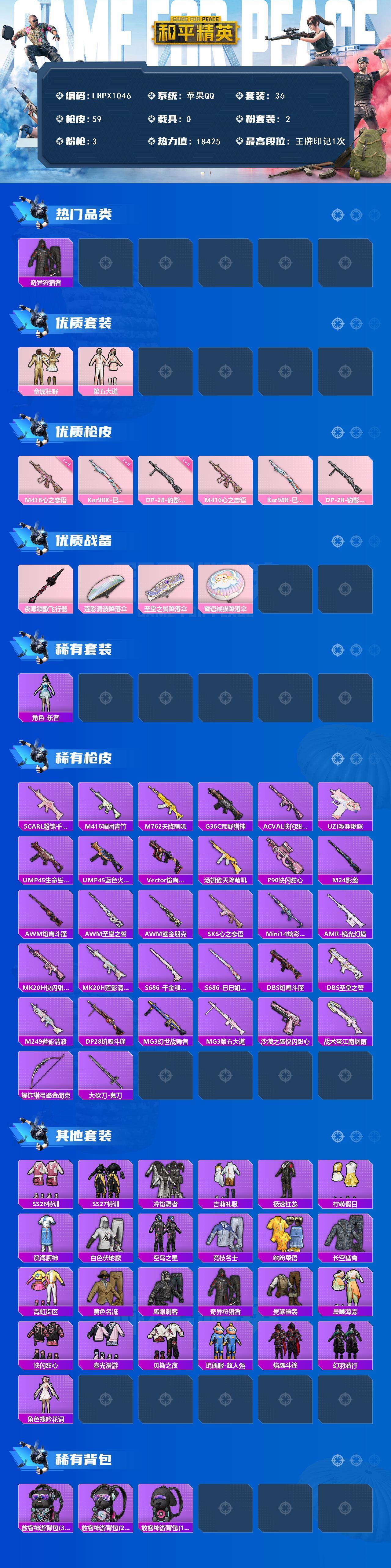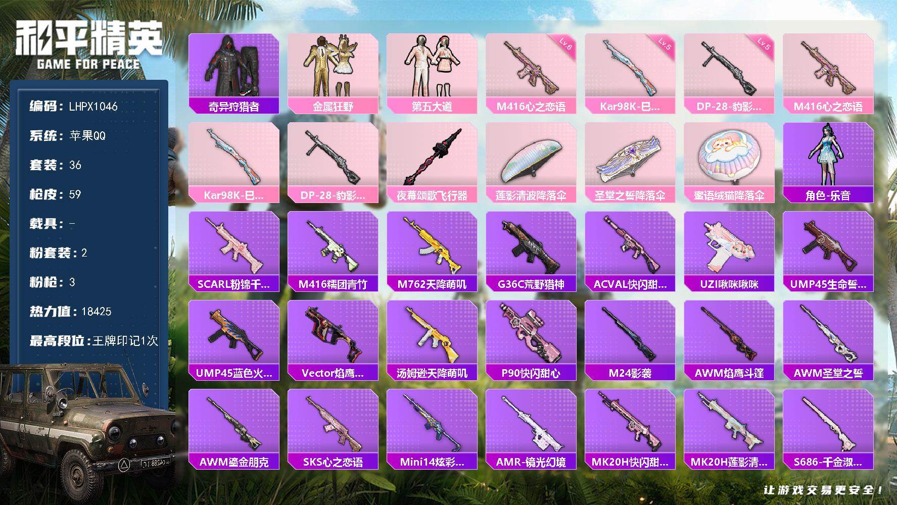 [16763819]【店主推荐捡漏号!可直接换绑】苹果 手q-2粉装-3特效呛-0载具-1粉色飞行器-18425热力值-1王牌印记-36套装-59呛皮【热门品类】:套装-奇异狩猎者【粉色套装】:粉装-金属狂野,粉装-第五大道【粉色呛皮等级】:m416-心之恋语六级,kar98k-巳巳如意五级,dp-28-豹影疾电五级【粉色呛皮】:m416-心之恋语,kar98k-巳巳如意,dp-28-豹影疾电【粉色飞行器】:夜幕颂歌飞行器