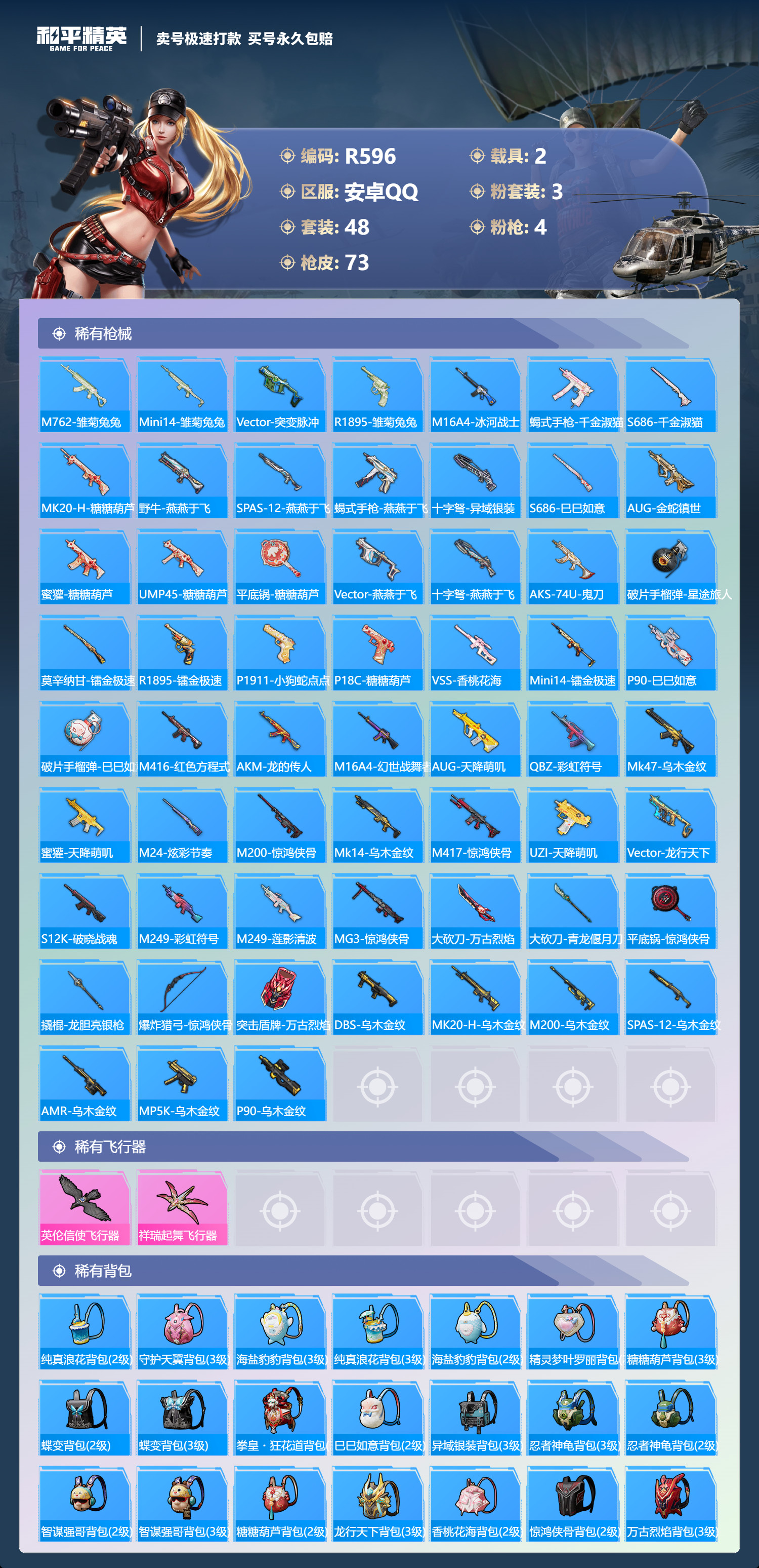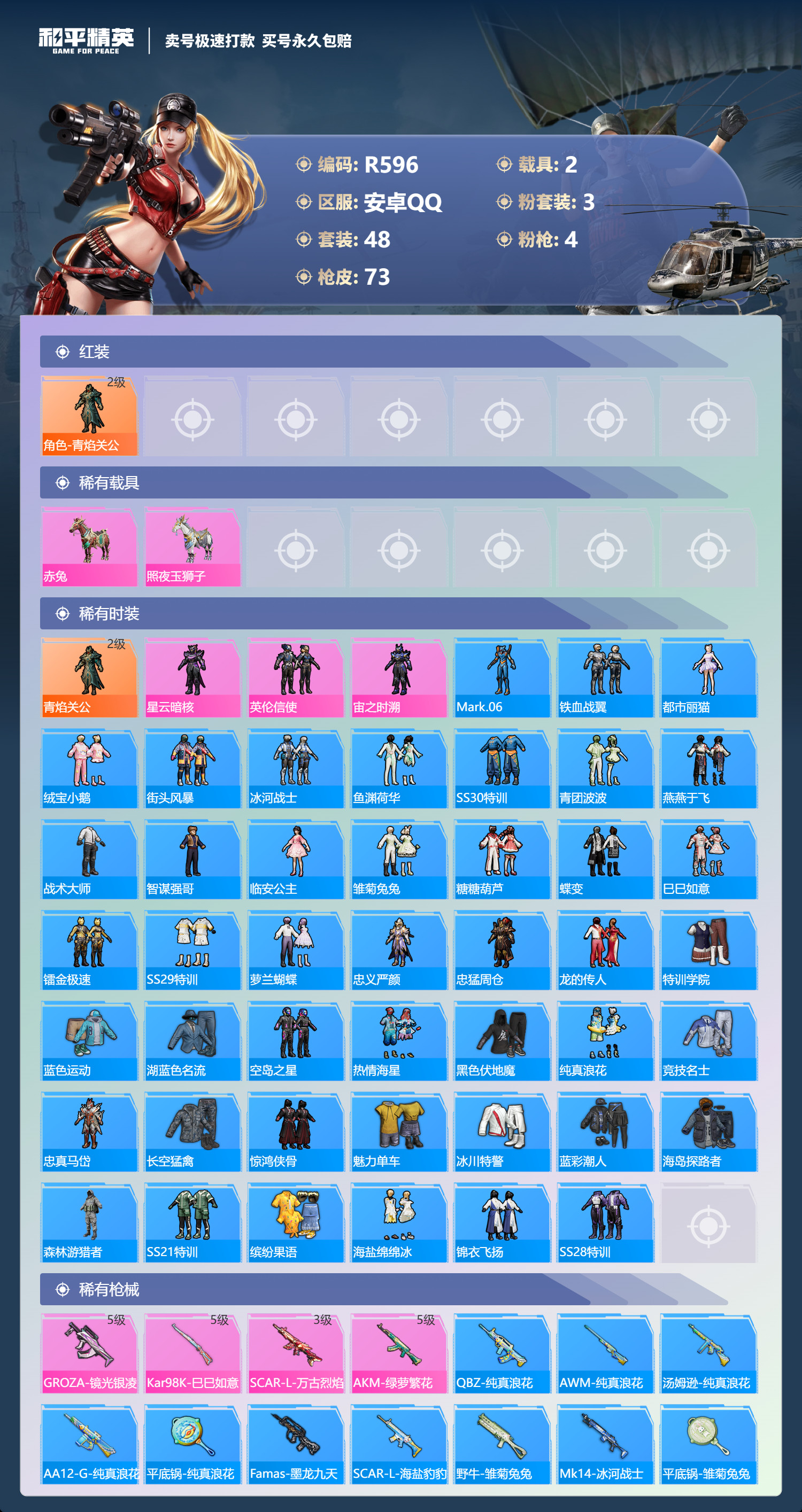 [5909137]r596 成长可修改 安卓手q-1王牌印记-3粉装-4特效呛-2载具-25194热力值-48套装-73呛皮-1卓越印记-0传奇印记 【3粉装】星云暗核英伦信使宙之时溯 【4特效呛】akm-绿萝繁花-5级 scar-l-万古烈焰-3级 groza-镜光银凌-5级 kar98k-巳巳如意-5级 【1红装】角色-青焰关公 【2稀有载具】赤兔照夜玉狮子 【48稀有时装】mark.06青焰关公铁血战翼都市丽猫绒宝小鹅街头风暴冰河战士鱼渊荷华ss30特训青团波波燕燕于飞战术大师智谋强哥临安公主雏菊兔兔糖糖葫芦蝶变巳巳如意镭金极速ss29特训萝兰蝴蝶忠义严颜忠猛周仓龙的传人特训学院蓝色运动湖蓝色名流空岛之星热情海星黑色伏地魔纯真浪花竞技名士忠真马岱长空猛禽惊鸿侠骨魅力单车冰川特警蓝彩潮人海岛探路者森林游猎者ss21特训缤纷果语海盐绵绵冰锦衣飞扬ss28特训
