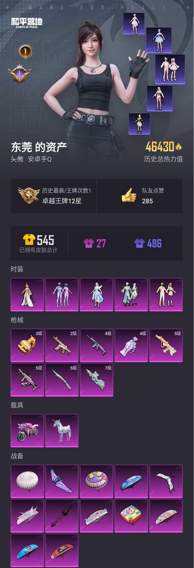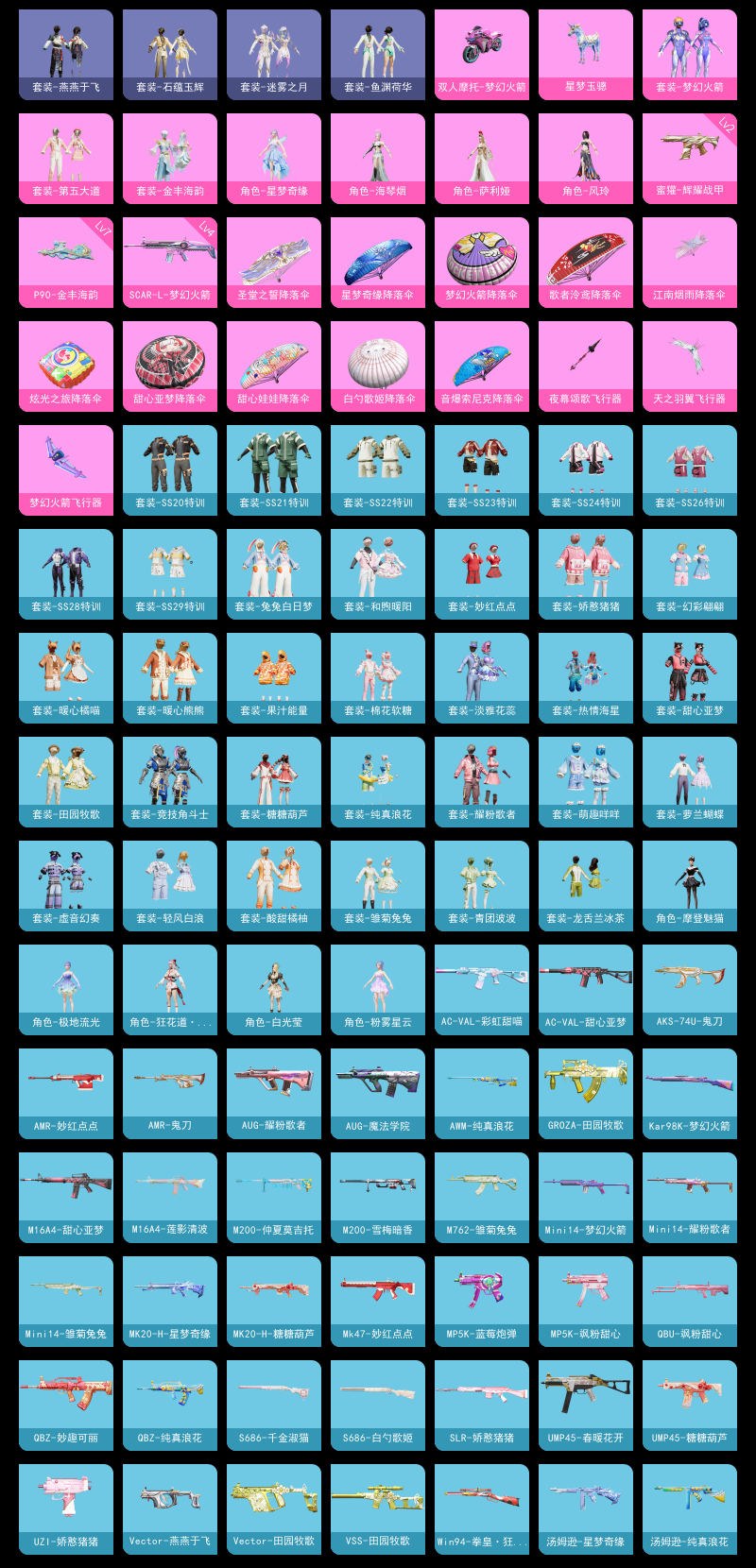 【和平精英】【hp03032】5粉装,8特效呛,2载具,历史最高段位:卓越王牌12星 王牌印记1次 热力值:46430,103套装,136呛械,190装备,90战备;套装:套装-梦幻火箭,套装-第五大道,角色-星梦奇缘,套装-金丰海韵,角色-萨利娅,套装-特训学院,套装-青年教官,套装-橘黑制服,套装-黑色伏地魔,套装-竞技名士,套装-湖蓝色名流,套装-黄色名流,套装-猛禽,套装-长空猛禽,套装-冷焰舞者,套装-甜蜜告白,套装-人气偶像,套装-幻影武者,套装-蓝彩潮人,套装-怒火燎原,套装-魅力单车,套装-绮丽涂鸦,套装-耀眼新星,套装-竞技达人朋克,套装-都市漫游者,套装-幻世战舞者,套装-甜蜜熊情侣,套装-缤纷果语,套装-龙魂突击队,套装-元素星魂,套装-破蛋小黄鸡,套装-军械专家,套装-淡雅花蕊,套装-鹤鸣,套装-霓虹街区,套装-白熊同盟,套装-萌黄之夏,套装-夏日音浪,套装-牛气满满,套装-战术大师,套装-牛气冲天,套装-耀粉歌者,套装-飞行日记,套装-竞技角斗士,套装-热情海星,套装-纯真浪花,套装-暗夜魅影,套装-福星高照,套装-兔兔白日梦,套装-ss20特训,套装-甜心亚梦,套装-虚音幻奏,套装-ss21特训,套装-暖心熊熊,套装-萌趣咩咩,套装-娇憨猪猪,套装-暖心橘喵,套装-酸甜橘柚,套装-玉兔迎春,套装-ss22特训,套装-和煦暖阳,套装-田园牧歌,套装-轻风白浪,套装-绯格组合,套装-ss23特训,套装-龙舌兰冰茶,套装-妙红点点,套装-幻彩翩翩,套装-王牌教练,套装-柠萌假日,套装-ss24特训,套装-龟仙人,套装-ss25特训,套装-香桃花海,套装-果汁能量,套装-冰河战士,套装-ss26特训,套装-空岛之星,套装-恋语绒绒,套装-ss28特训,角色-极地流光,角色-粉雾星云,角色-白光莹,套装-海盐绵绵冰,套装-蝶变,套装-ss29特训,套装-雏菊兔兔,角色-狂花道·娜可露露,套装-萝兰蝴蝶,角色-摩登魅猫,套装-星途旅人,套装-ss30特训,套装-青团波波,套装-棉花软糖,套装-糖糖葫芦,套装-鱼渊荷华,套装-石蕴玉辉,套装-燕燕于飞,角色-风玲,角色-海琴烟,套装-荒漠狂战,套装-迷雾之月,套装-巳巳如意;呛皮:akm-生命誓言,akm-彩虹符号,akm-龙的传人,m16a4-蓝色火焰,m16a4-甜心亚梦,m16a4-幻世战舞者,m16a4-莲影清波,m16a4-冰河战士,4级scar-l-梦幻火箭,scar-l-玉兔迎春,scar-l-星途旅人,scar-l-海盐豹豹,m416-蓝色火焰,m416-红色方程式,m416-糯团青竹,5级groza-镜光银凌,groza-田园牧歌,groza-海盐豹豹,5级aug-暖羊咩咩,aug-魔法学院,aug-耀粉歌者,q-妙趣可丽,q-纯真浪花,m762-雏菊兔兔,mk47-乌木金纹,mk47-妙红点点,g36c-乌木金纹,ac-val-甜心亚梦,ac-val-乌木金纹,ac-val-彩虹甜喵,ac-val-天降萌叽,2级蜜獾-辉耀战甲,蜜獾-娇憨猪猪,蜜獾-垂柳戏鸭,蜜獾-天降萌叽,蜜獾-精灵梦叶罗丽,蜜獾-糖糖葫芦,蜜獾-幻梦之森,ace32-蓝晶绮麟,5级kar98k-巳巳如意,kar98k-红色方程式,kar98k-梦幻火箭,kar98k-顶峰精英,awm-纯真浪花,win94-拳皇·狂花道,莫辛纳甘-乌木金纹,amr-妙红点点,amr-鬼刀,amr-乌木金纹,m200-雪梅暗香,m200-仲夏莫吉托,m200-乌木金纹,vss-田园牧歌,vss-香桃花海,mini14-梦幻火箭,mini14-耀粉歌者,mini14-香桃花海,mini14-雏菊兔兔,mk14-乌木金纹,mk14-冰河战士,slr-娇憨猪猪,qbu-飒粉甜心,mk20-h-星梦奇缘,mk20-h-星途旅人,mk20-h-糖糖葫芦,mk20-h-乌木金纹,uzi-娇憨猪猪,uzi-天降萌叽,uzi-冰河战士,uzi-啾咪啾咪,ump45-春暖花开,ump45-糖糖葫芦,vect-彩虹符号,vect-田园牧歌,vect-燕燕于飞,汤姆逊-耀粉歌者,汤姆逊-星梦奇缘,汤姆逊-纯真浪花,野牛-雏菊兔兔,野牛-燕燕于飞,mp5k-蓝莓炮弹,mp5k-飒粉甜心,mp5k-乌木金纹,aks-74u-鬼刀,7级p90-金丰海韵,p90-巳巳如意,p90-乌木金纹,s686-生命誓言,s686-白勺歌姬,s686-千金淑猫,s686-巳巳如意,s1897-炫彩节奏,s1897-精灵梦叶罗丽,s12k-娇憨猪猪,s12k-垂柳戏鸭,s12k-幻世战舞者,s12k-音爆索尼克,dbs-甜心亚梦,dbs-彩虹符号,dbs-乌木金纹,aa12-g-纯真浪花,spas-12-田园牧歌,spas-12-燕燕于飞,spas-12-乌木金纹,m249-破晓战魂,m249-妙红点点,dp-28-甜心亚梦,dp-28-甜蜜旋律,mg3-幻世战舞者,mg3-乌木金纹,mg3-妙红点点,pkm-小鹦鹉bebe,pkm-啾咪啾咪,r1895-雏菊兔兔,p18c-糖糖葫芦,蝎式手呛-金丰海韵,蝎式手呛-千金淑猫,蝎式手呛-燕燕于飞,大砍刀-鬼刀,撬棍-幻世战舞者,平底锅-甜心亚梦,平底锅-娇憨猪猪,平底锅-田园牧歌,平底锅-光之冒险,平底锅-妙红点点,平底锅-空岛之星,平底锅-纯真浪花,平底锅-雏菊兔兔,平底锅-糖糖葫芦,十子怒-燕燕于飞,战术弩-江南烟雨,4级盐雾蛋-丁香清露,3级破片手留单-热量炸弹,破片手留单-呆爆全场,破片手留单-星途旅人,破片手留单-巳巳如意;载具:双人摩托-梦幻火箭,星梦玉骢;降落伞:梦幻火箭降落伞,甜心娃娃降落伞,歌者泠鸢降落伞,音爆索尼克降落伞,白勺歌姬降落伞,炫光之旅降落伞,圣堂之誓降落伞,江南烟雨降落伞,星梦奇缘降落伞,白昼之火降落伞,寂夜之火降落伞,化学天才降落伞,钢铁雄心降落伞,元宵华灯降落伞,飞行日记降落伞,虎虎生威降落伞,甜心亚梦降落伞,娇憨猪猪降落伞,绿草茵茵降落伞,幻世战舞者降落伞,田园牧歌降落伞,妙红点点降落伞,电竞之星降落伞,亚洲精英降落伞,香桃花海降落伞,冰河战士降落伞,纯真浪花降落伞,海盐豹豹降落伞,雏菊兔兔降落伞,星途旅人降落伞,干得pel亮降落伞,糖糖葫芦降落伞,燕燕于飞降落伞,ss31王牌降落伞,镭金极速降落伞,巳巳如意降落伞,紫菱降落伞,青羽降落伞,迷雾突击降落伞,普通降落伞;滑翔尾迹:梦幻火箭飞行器,天之羽翼飞行器,夜幕颂歌飞行器,光之冒险尾迹,顶峰精英尾迹; 详情看