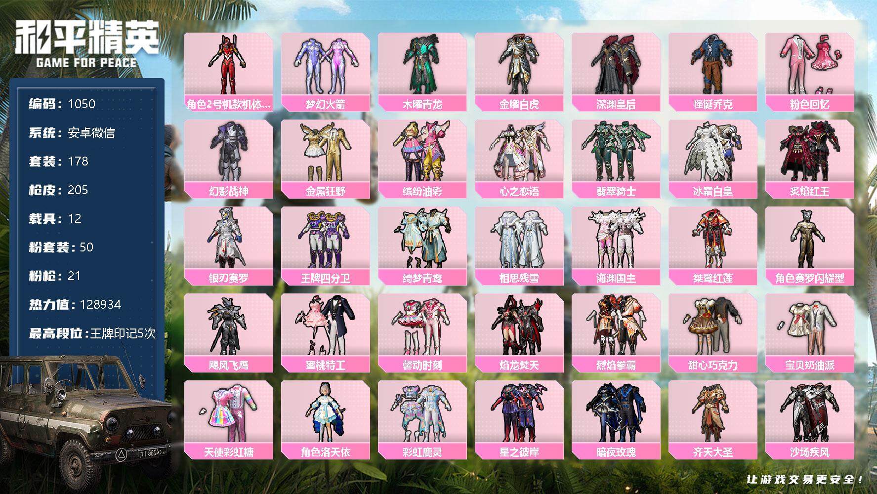 [6482104]【因赛季更新游戏段位以上号为准!】可二次-cj7440 安卓v-128934热力值 5王牌印记 历史传奇王牌12星 178套装 205呛皮 【12载具】 玛莎拉蒂金色 兰博svj金色 玛莎拉蒂m白色 宾利欧陆gt火焰橘 特斯拉r尊享铂 合金龙骨红色 特斯拉x紫色 特斯拉r沁心粉 灵鼠银迹 双人摩托梦幻火箭 鬼马风驰 空客蔚蓝之翼僚机 【5稀有】 木乃伊 akm-缤纷海域 akm-百万伏特 scar-l-粉色回忆 派对舞王(金靴子) 【50粉装】 红螳螂 梦幻火箭 宝贝奶油派 天使彩虹糖 甜心巧克力 洛天依 木曜青龙 金曜白虎 怪诞乔克 深渊皇后 幻影战神 闲梦青缨 金属狂野 酣梦娃娃 缤纷油彩 粉色回忆 心之恋语 翡翠骑士 童趣迷兔 冰霜白皇 炙焰红王 银刃赛罗 王牌四分卫 绮梦青鸾 星之彼岸 相思残雪 绿野柔风 馨动时刻 烈焰拳霸 虎啸骄阳 炙焰赤龙 飓风飞鹰 赛罗闪耀型 闪耀迪迦型 呛炮玫瑰 蜜桃特工 蝶舞蔷薇 焦糖拿铁 葫芦兄弟 桀骜红莲 铁血龙王 显圣真君 焰龙焚天 骨龙祭渊 银龙傲海 暗夜玫瑰 彩虹鹿灵 沙场疾风 齐天大圣 海渊国主 【21特效呛】 m416-五爪金龙 m416-心之恋语 akm-甜心宝贝 akm-炫紫旋律 p90-能量风暴 awm-花间之火 m762-激战未来 scar-l-童趣迷兔 uzi-绮梦青鸾 aug-星之彼岸 ump45-相思残雪 m416-暖熊萌萌 汤姆逊-怪笑疯兔 vss-烈焰拳霸 dp-28-呛炮玫瑰 m249-古战神甲 m16a4-葫芦兄弟 awm-焰龙焚天 mg3-洛神天依 s12k-海渊国主 groza-焦糖拿铁 【12飞行器】 梦幻火箭飞行器 星之彼岸飞行器 呛炮玫瑰飞行器 绮梦青鸾飞行器 古战神甲飞行器 相思残雪飞行器 终极赛罗飞行器 齐天大圣飞行器 林间仙鹿飞行器 王牌四分卫飞行器 梦之光华飞行器 焰龙焚天飞行器 【29热门】【12头盔】【12背包】