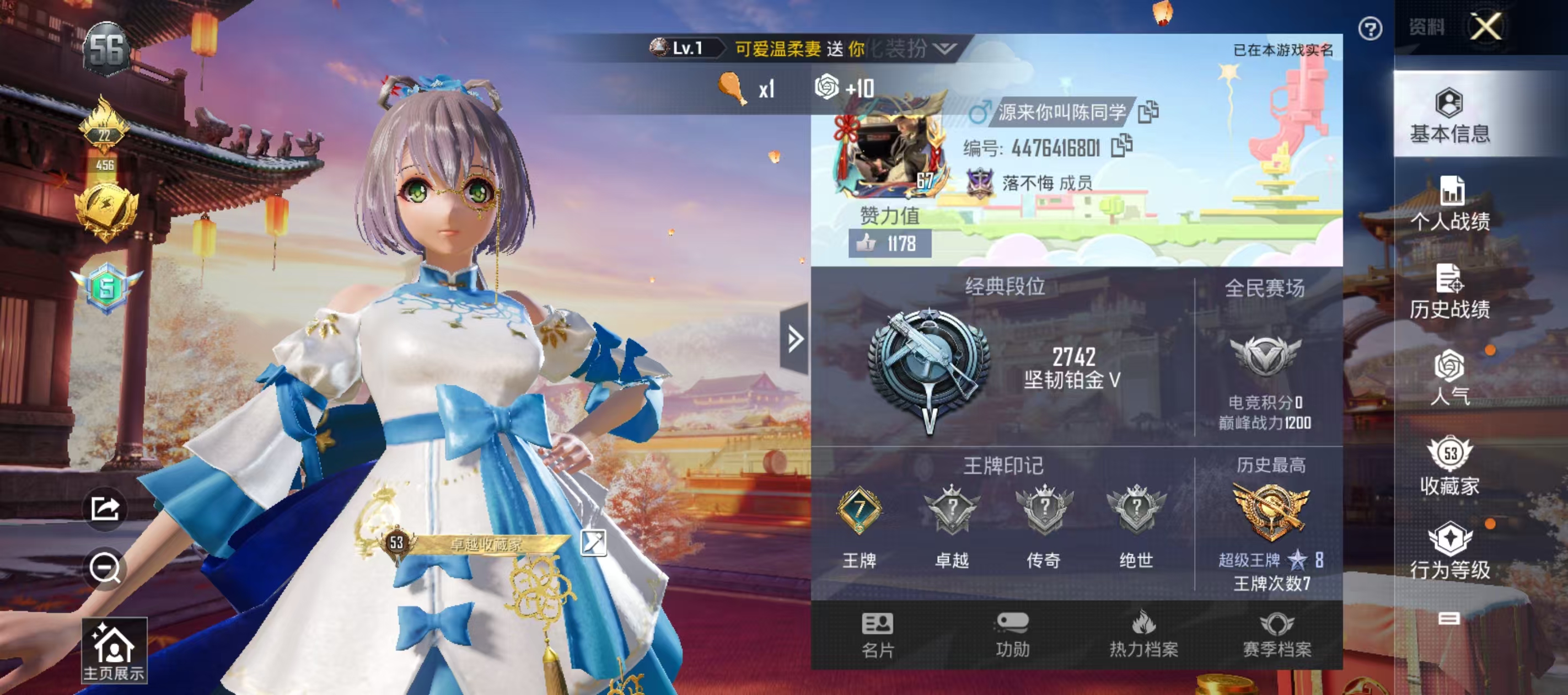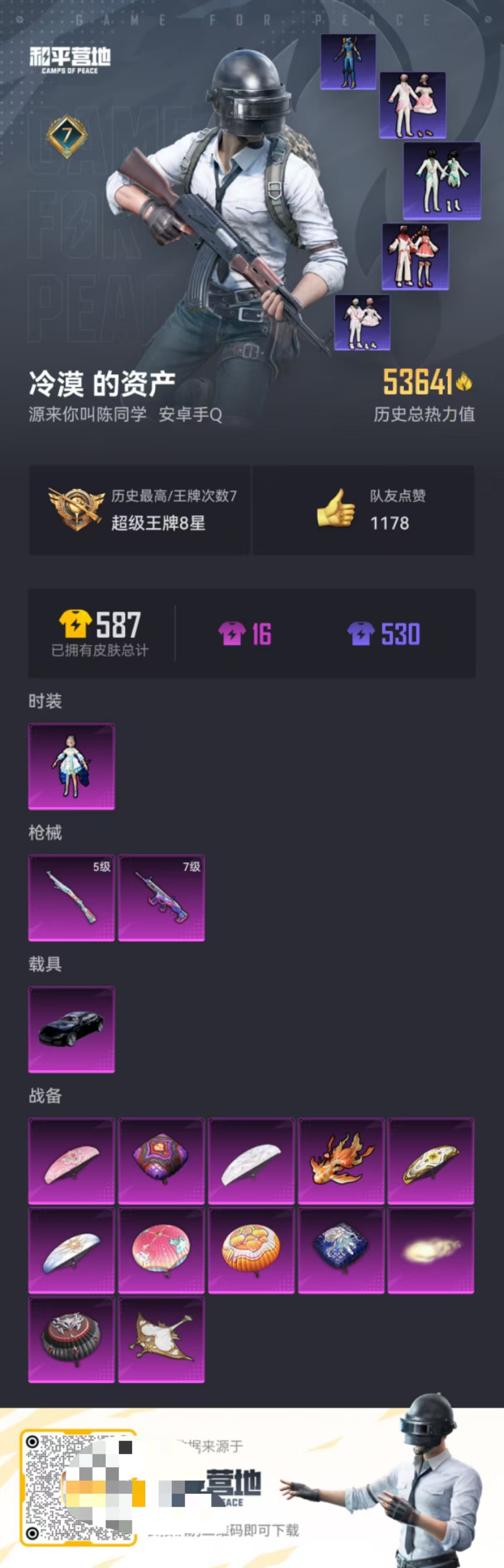 [6688373]h3294实名: 可修改 时装数: 439 载具数: 1 呛械数: 181 战备数: 105 热门装扮: 洛天依暗夜魅影 载具: 玛莎拉蒂quattropte夜幕蓝 稀有呛皮: scar-l机甲封神kar98k-巳巳如意 亮点: 1粉2特1载具洛天依螳螂7级激战未来夜幕蓝玛莎