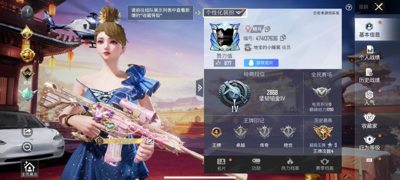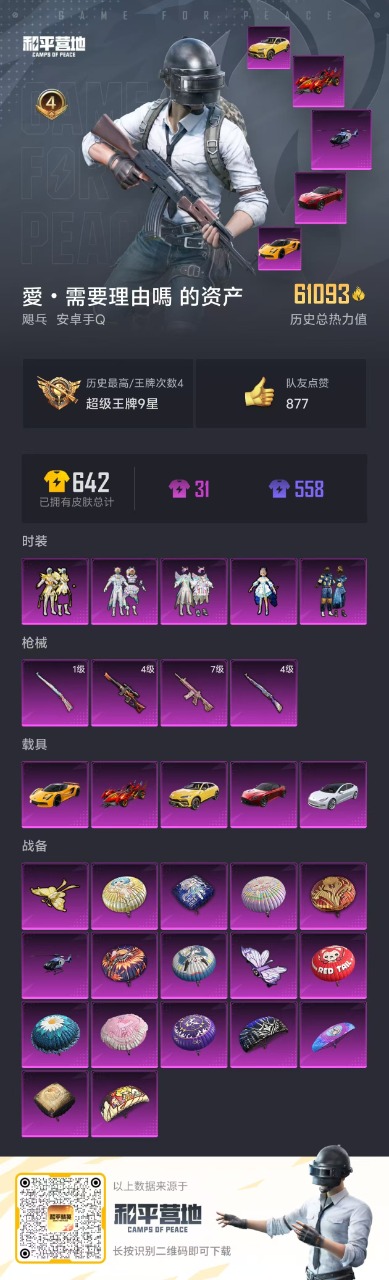 [7158208]5粉装 4特效呛 5载具 4印记 可二次 时装数:562 呛械数:151 战备数:5 热门装扮:洛天依彩虹鹿灵山涧鹿灵庄周梦蝶罗小黑大橘为重恒星战甲万圣娃娃梦魇先生好奇恐龙 载具:路特斯evija星际黄特斯拉model 3珍珠白阿斯顿·马丁dbs红焰龙咆哮兰博基尼urus明艳黄空客h135-蔚蓝之翼 稀有呛皮:kar98k-巳巳如意m416心之恋语kar98k伏魔团vss烈焰拳霸 七级特效呛:七级m416-心之恋语 四级特效呛:四级kar98k-伏魔团四级vss-烈焰拳霸 一级特效呛:一级kar98k-巳巳如意 紫色装扮:竞技名士春日漫步ss25特训 优质战备:飞行器-庄周梦蝶金风玉露降落伞庄周梦蝶降落伞甜心宝贝降落伞深海曼妙降落伞古堡领主降落伞伏魔团降落伞繁花小夜曲降落伞甜蜜誓约降落伞飞行器-荧光虫舞阿狸红降落伞银刃赛罗降落伞林间仙鹿降落伞风花雪月降落伞齐天大圣降落伞洛神天依降落伞