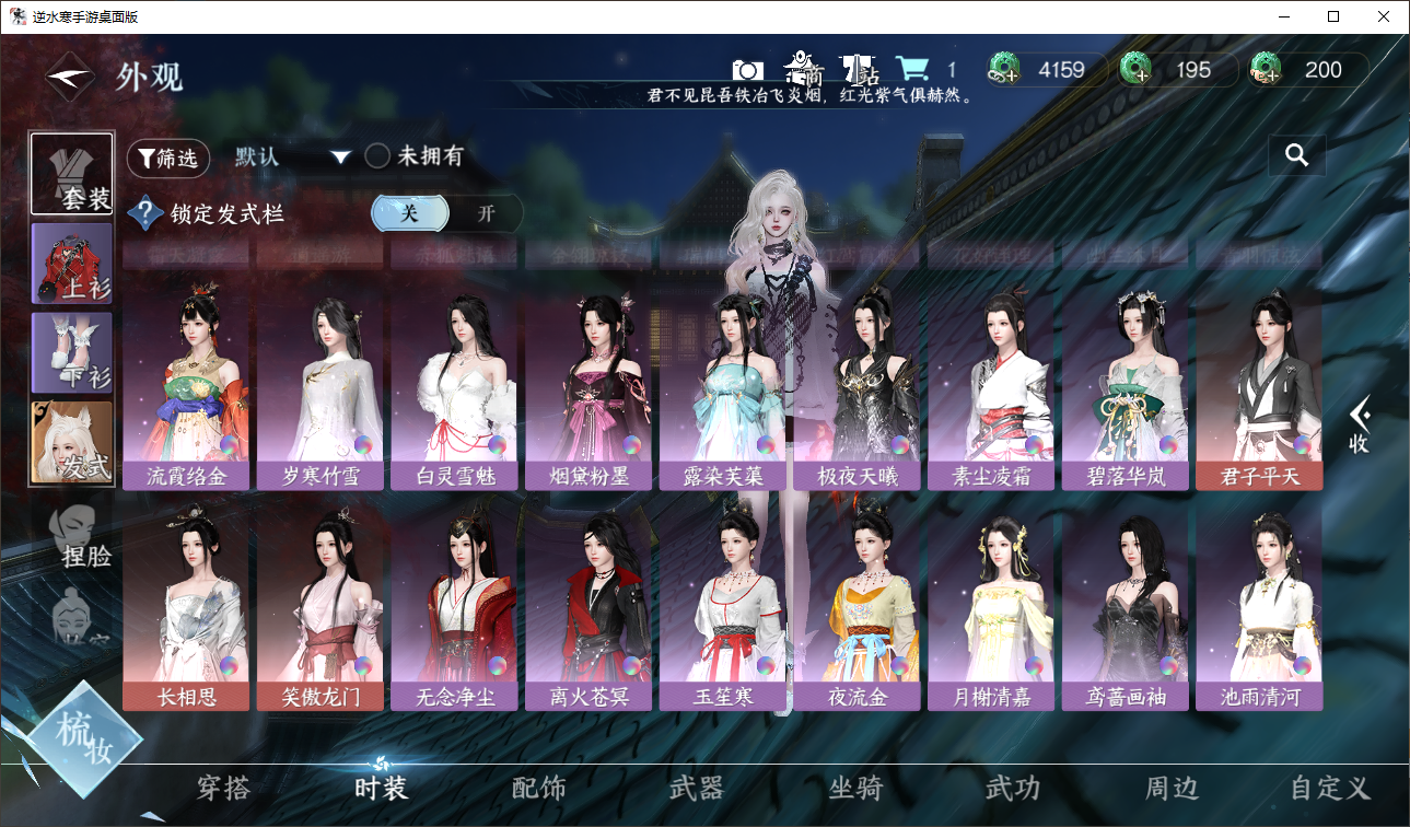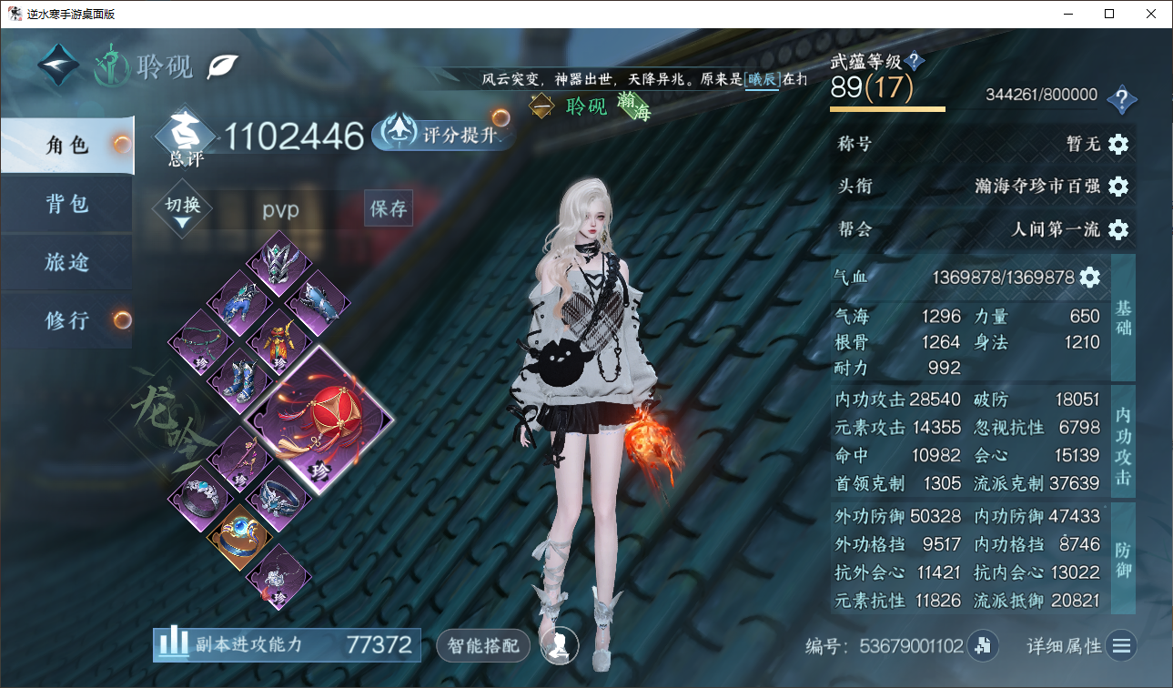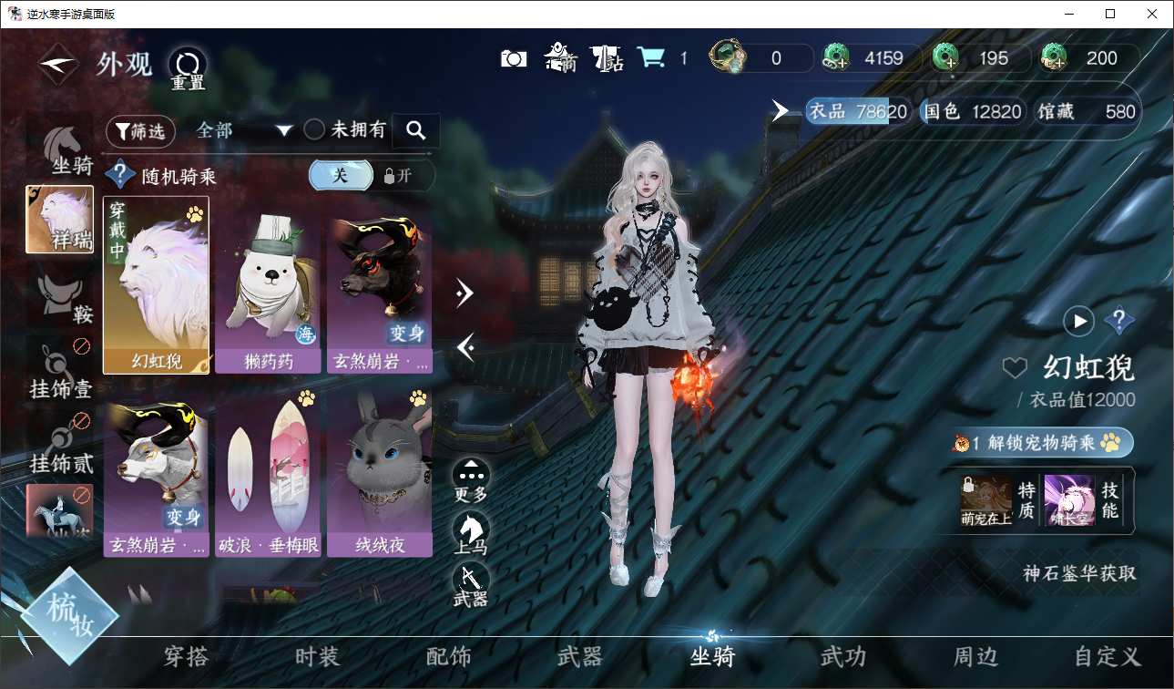[15570324]龙吟【凭栏听雨】【已用天赏石6】 1国色 78620衣品 12820国色值 95套时装 宠物图鉴1级 庄园10级 详情见图