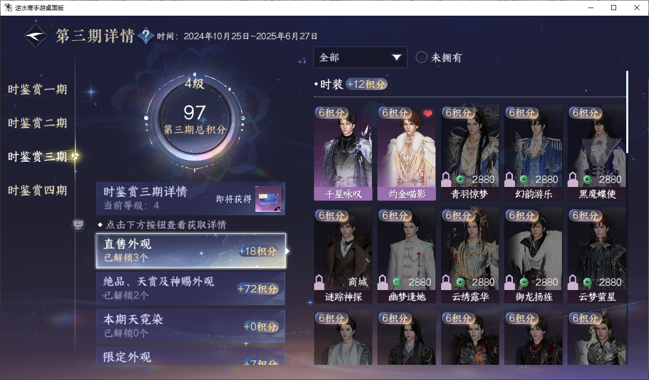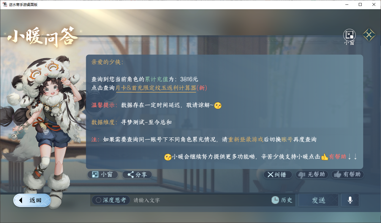 [16408900]【区服】 天下无双 【战力值】 89.35 【职业】 玄机 【馆藏】 4级 【衣品值】 117935 【国色值】 27530 【已用天赏石】 4 【充值称号】 凭栏听雨 【累计充值】 3816元 【剩余赠礼额度】 7321纹玉 【灵韵内功】 荡剑扬波 断金戈 【副本外观】 白夜拂雪1 星剑分野 【天赏外观】 樱海 狂欢 琢雪 龙荒 【祥瑞坐骑】 呆宝 布丁 风行·江湖景 风行·世间情 云螭·金玉纳福 风行·万灯明 云螭·封冰怀雪 云螭·烹鲜炊黍 龙衔瑞焰 纵风甲车·玄 纵风甲车·赤 粉黛娇 幻琉晶 沉木行马 星河转·银昼 骋风叱焰 抟乌镇妖 贺岁喜狮 伯力 咩郎 瓜皮 墨流云·玄色 墨流云·靛青 彩虹小马 木小马 玉霄飞练 花花团子 梅香团子 绒绒夜 牛奶酥 隐云涧 游 空山闲 【商城外观】 灼金喵影 晴岸涛吟 玄喵夜行 烹椒听雀 天离渊青 真嗣款战斗服 纯白月光 千星咏叹 跃动心芒 灵语星彩 凤亭骁野 不负卿愿 星宫遐音 青林雀舞 开阳执戈 衣香鬓影 混天焚莲 瀚渊龙炎 金粉绮梦 烽火浮生 白灵幻尘 御宇临渊 陨曜明晖 【配饰】 星羽缥纱 夜阑玄翼 【武器环身】 剑渡东海