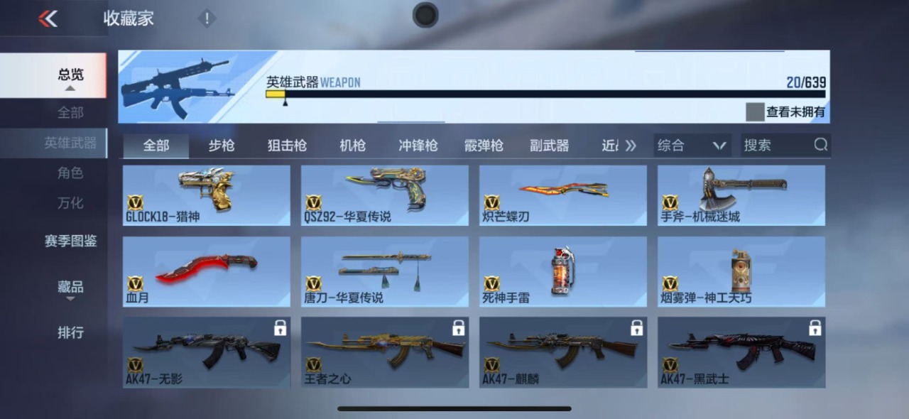 可二次 v1 20英雄武器 35万化 精英 武器:芭蕾特-毁灭ak47-木兰ak47-火麒麟m4a1-死神m4a1-龙血q03-呛娘m4a1-夏清hk416-极光qsz92-华夏传说手斧-机械迷城唐刀-华夏传说血月死神手蕾glock18-猎神盐雾蛋-神工天巧炽芒蝶