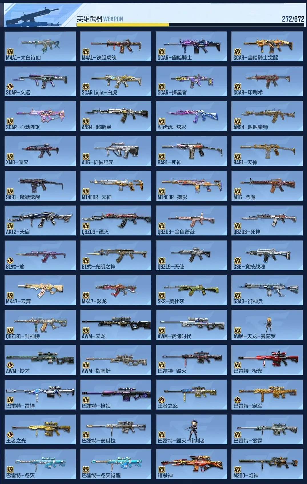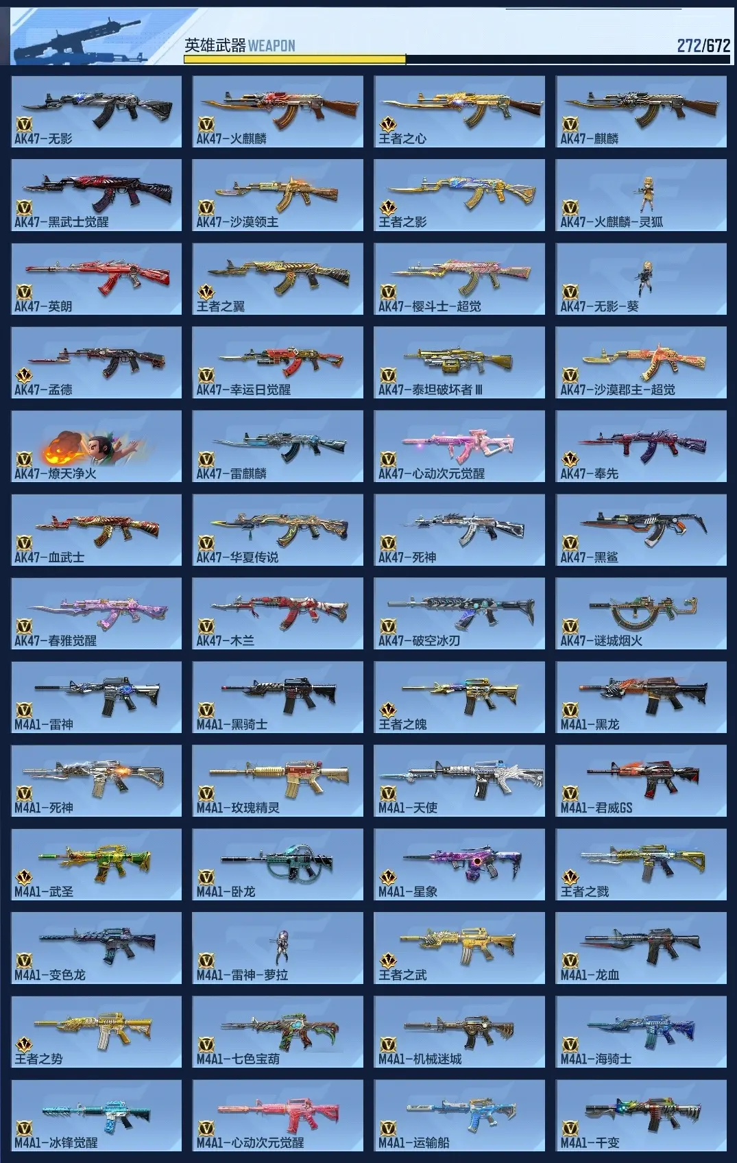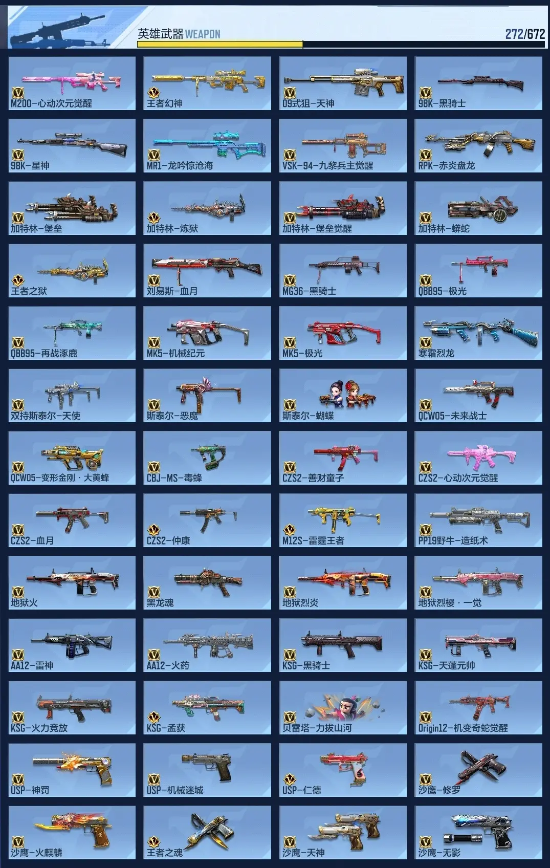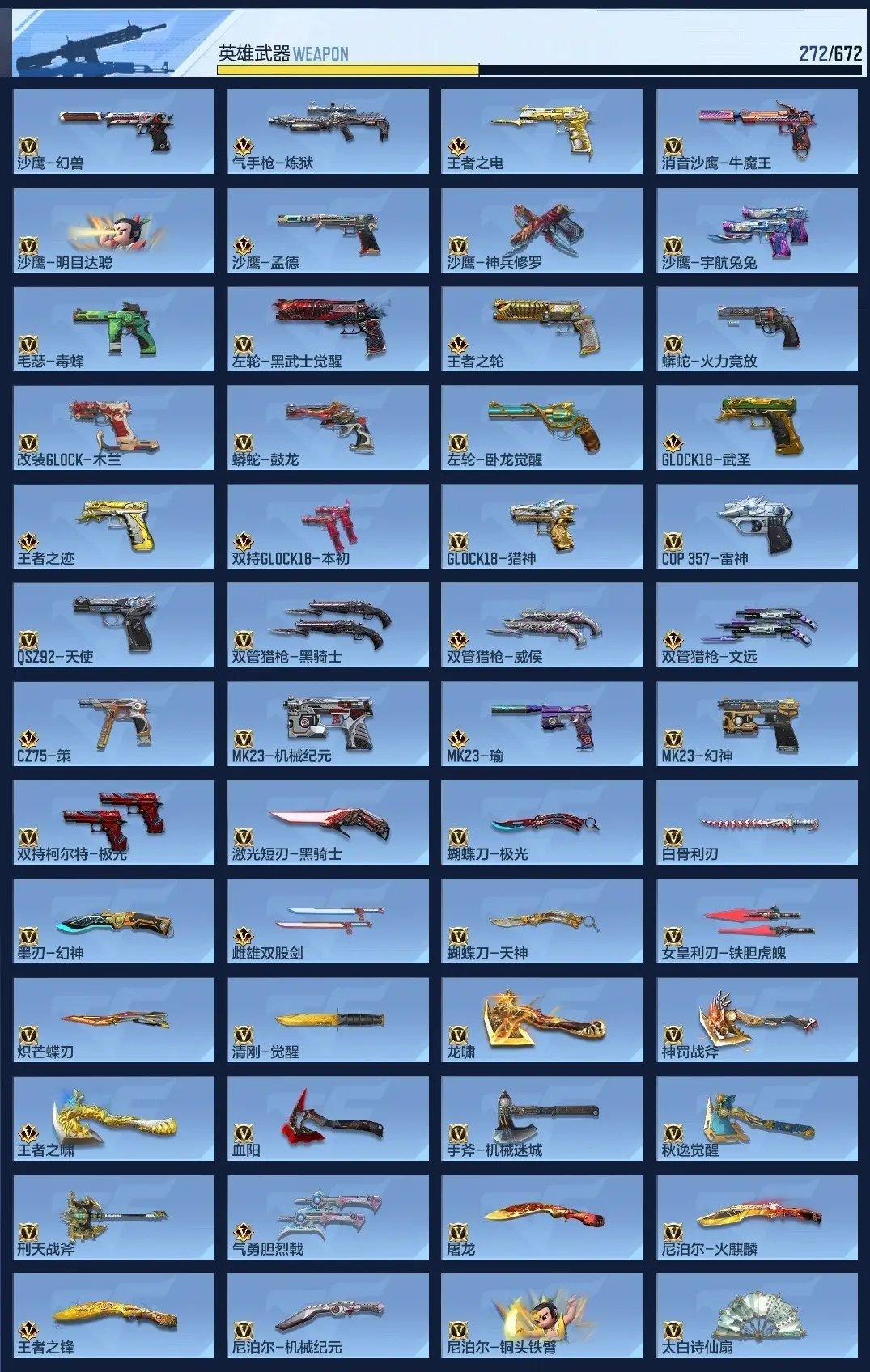 wqy603626 【氪金5.2丨7至尊3同框丨热门三国武器丨王幻丨81瑜丨孟德套丨顶配生化爆破狙神号】 v武器数272 王者v武器数量33 英雄武器数量272 音效卡数量16 万化数量434 v总数量272 角色数量47