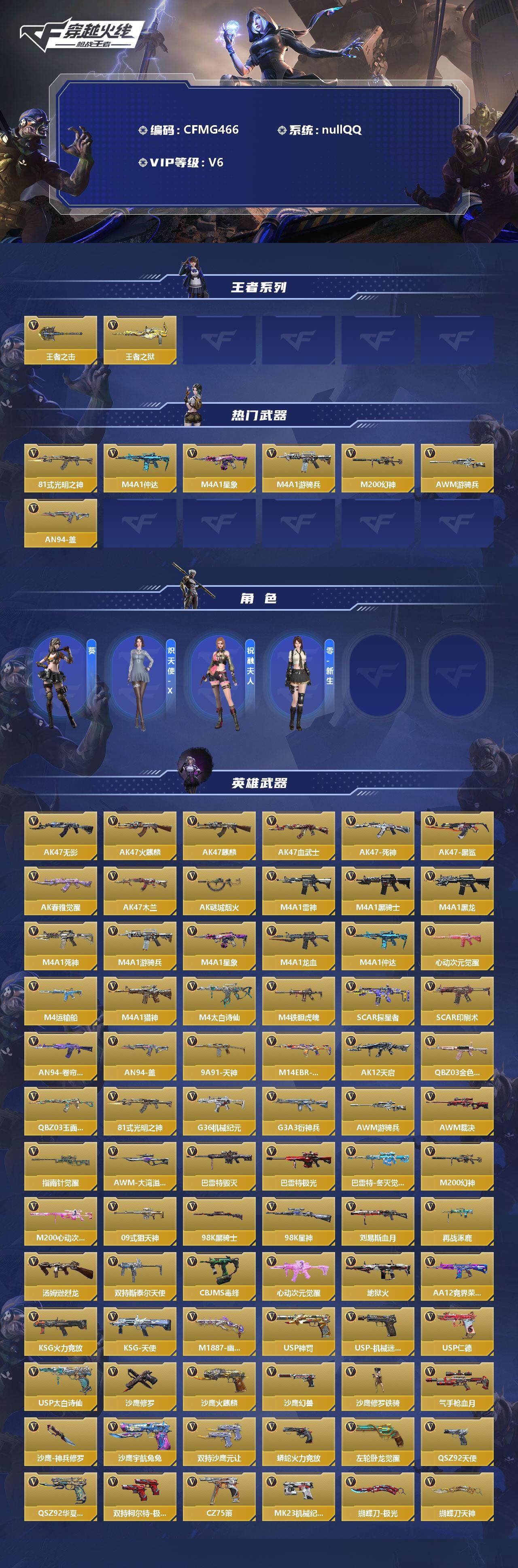 【cfmg466】vip6/189v/2王者/王者之击/王者之狱/81式-光明之神/m4a1-仲达/m4a1-星象/m4a1-游骑兵/m200-幻神/awm-游骑兵/an94-盖/葵/炽天使-x/祝融夫人/零-新生/ak47-无影/ak47-火麒麟/ak47-麒麟/ak47-血武士/ak47-死神/ak47-黑鲨/ak47-春雅觉醒/ak47-木兰/ak47-谜城烟火/m4a1-雷神/m4a1