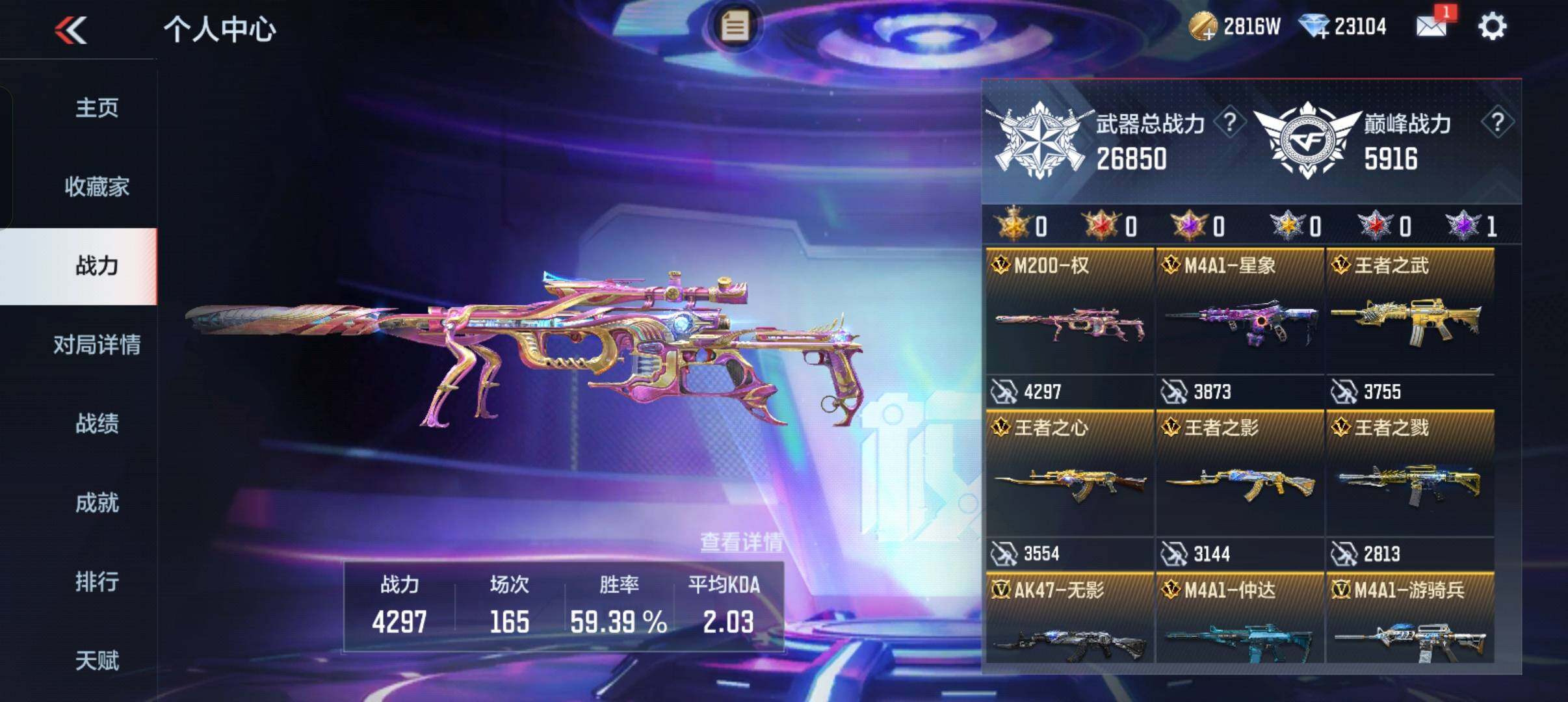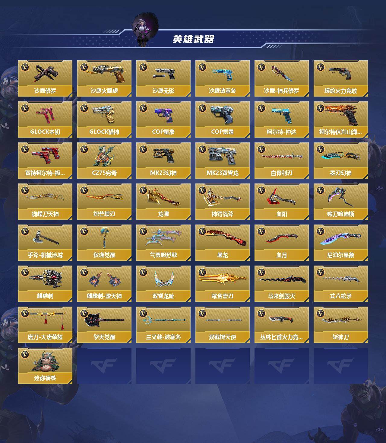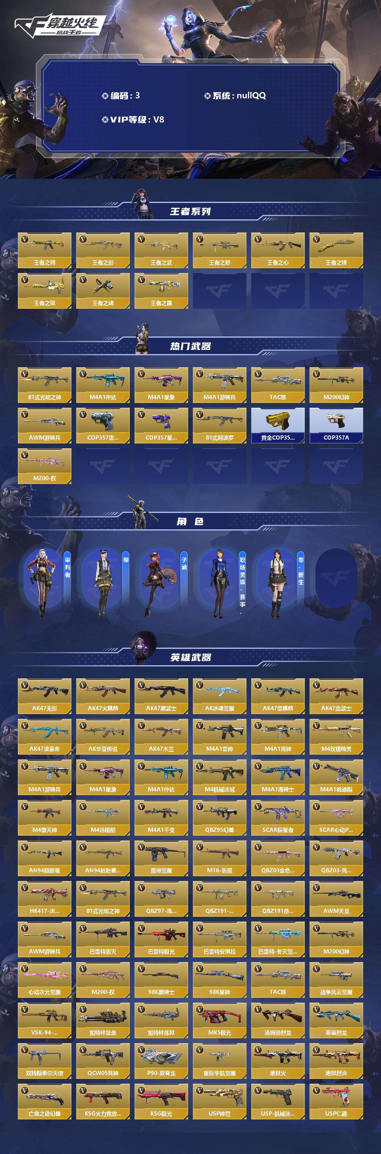 6英雄角色数-217英雄武器数 【王者系列】:王者之戮,王者之影,王者之武,王者之怒,王者之心,王者之锋,王者之狱,王者之魂,王者之霆 【热门武器】:81式-光明之神,m4a1-仲达,m4a1-星象,m4a1-游骑兵,tac-慈,m200-幻神,awm-游骑兵,cop 357-雷霆,cop 357-星象,81式-阿波罗,黄金cop 357,cop 357-a,m200-权 【角色】:审判者,樱2,子涵,职场灵狐-赛事经理,零-新生 【英雄武器】:ak47-无影,ak47-火麒麟,ak47-黑武士,ak47-冰魂觉醒,ak47-雷麒麟,ak47-血武士,ak47-波塞冬,ak47-华夏传说,ak47-木兰,m4a1-雷神2,m4a1-死神2,m4a1-玫瑰精灵,m4a1-游骑兵,m4a1-星象,m4a1-仲达,m4a1-机械迷城,m4a1-海骑士,m4a1-哈迪斯,m4a1-堕天神,m4a1-运输船,m4a1-千变,q95-幻兽,scar-探星者,scar-心动pick,an94-超新星,an94-赳赳秦师,9a91-魔蜥觉醒,m16-恶魔,q03-金色蔷薇,q03-死神,hk417-炎龙铠甲,81式-光明之神,q97-浩瀚征途,q191-封神榜,q191-帝皇铠甲,awm-天龙,awm-游骑兵,芭蕾特-毁灭3,芭蕾特-极光6,芭蕾特-安琪拉,芭蕾特-冬灭觉醒,m200-幻神,m200-心动次元觉醒,m200-权,98k-黑骑士,98k-星神,tac-慈,gm6-战争风云觉醒,vsk-94-金蚀,加特林-堡垒,加特林-炼狱,mk5-极光,汤姆逊-烈龙,寒霜烈龙,双持斯泰尔-天使2,qcw05-死神,p90-双脊龙,ddm4-pdw-星际宇航觉醒,地狱火,地狱烈炎,亡命之徒-幻兽,ksg-火力竞放觉醒,ksg-极光,usp-神罚,usp-机械迷城,usp-仁德,沙鹰-修罗3,沙鹰-火麒麟,沙鹰-无影,沙鹰-波塞冬2,沙鹰-神兵修罗,蟒蛇-火力竞放,双持glock18-本初,glock18-猎神,cop 357-星象,cop 357-雷霆,柯尔特-仲达,柯尔特-伏刹山海觉醒,双持柯尔特-极光,cz75-穷奇,mk23-幻神,mk23-双脊龙,白骨利刃,墨刃-幻神2,蝴蝶刀-天神,炽芒蝶刃2,龙啸2,神罚战斧,血阳,镰刀-哈迪斯,手斧-机械迷城2,秋逸觉醒,气勇胆烈戟,屠龙4,血月,尼泊尔-星象,龙鳞-觉醒,麒麟刺2,麒麟刺-堕天神,双脊龙趾,耀金雷刃,马来剑-毁灭3,丈八蛇矛,唐刀-华夏传说,唐刀-大唐荣耀2,擎天觉醒,三叉戟-波塞冬,双截棍-天使,丛林匕首-火力竞放,斩神刀,迷你饕餮