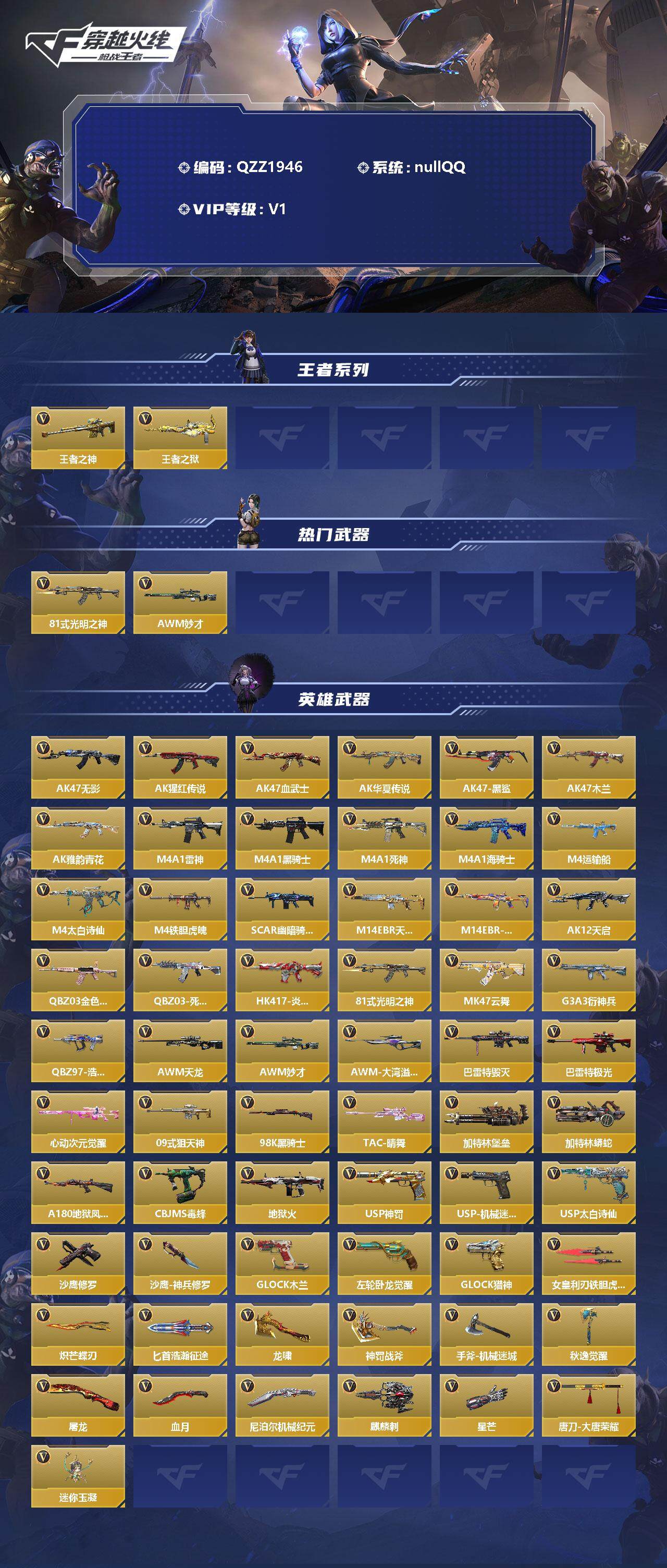 【qzz1946】vip1/115v/王者之神/王者之狱/81式-光明之神/awm-妙才/ak47-无影/ak47-猩红传说/ak47-血武士/ak47-华夏传说/ak47-黑鲨/ak47-木兰/ak47-雅韵青花/m4a1-雷神/m4a1-黑骑士/m4a1-死神/m4a1-海骑士/m4a1-运输船/m4a1-太白诗仙/m4a1-铁胆虎魄/scar-幽暗骑士/m14ebr-天神/m14ebr-拂影/ak12-天启/q03-金色蔷薇/q03-死神/hk417-炎龙铠甲/mk47-云舞/g3a3-衍神兵/q97-浩瀚征途/awm-天龙/awm-大湾溢彩/芭蕾特-毁灭/芭蕾特-极光/m200-心动次元觉醒/09式狙-天神/98k-黑骑士/tac-晴舞/加特林-堡垒/加特林-蟒蛇/a180-地狱凤凰/cbj-ms-毒蜂/地狱火/usp-神罚/usp-机械迷城/usp-太白诗仙/沙鹰-修罗/沙鹰-神兵修罗/改装glock-木兰/左轮-卧龙觉醒/glock18-猎神/女皇利刃-铁胆虎魄/炽芒蝶刃/匕首-浩瀚征途/龙啸/神罚战斧/手斧-机械迷城/秋逸觉醒/屠龙/血月/尼泊尔-机械纪元/麒麟刺/星芒/唐刀-大唐荣耀/迷你玉凝