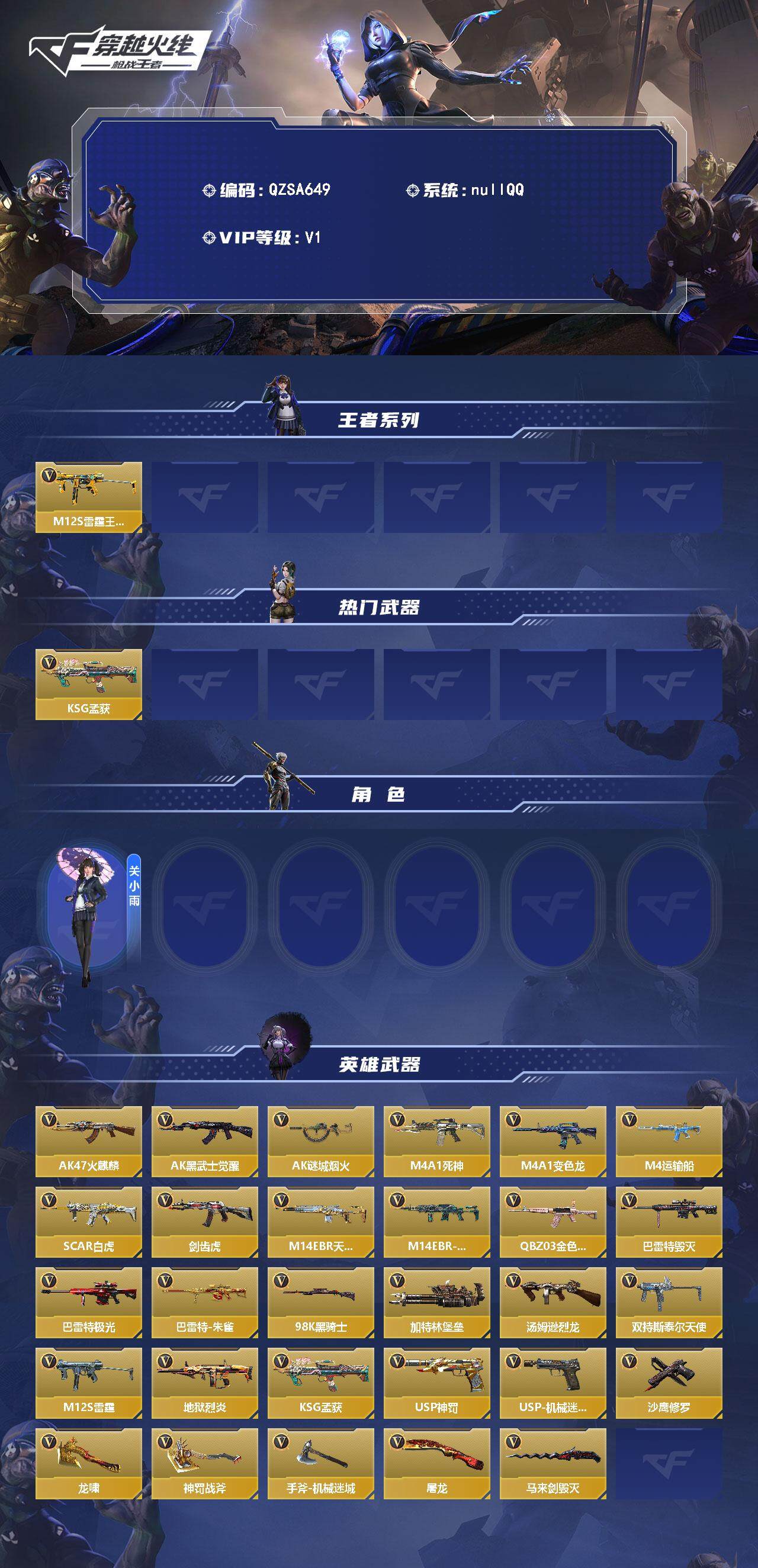 【qzsa649】vip1/62v/1王者/m12s-雷霆王者/ksg-孟获/关小雨/ak47-火麒麟/ak47-黑武士觉醒/ak47-谜城烟火/m4a1-死神/m4a1-变色龙/m4a1-运输船/scar light-白虎/剑齿虎/m14ebr-天神/m14ebr-玄武/q03-金色蔷薇/芭蕾特-毁灭/芭蕾特-极光/芭蕾特-朱雀/98k-黑骑士/加特林-堡垒/汤姆逊-烈龙/双持斯泰尔-天使/m12s-雷霆/地狱烈炎/usp-神罚/usp-机械迷城/沙鹰-修罗/龙啸/神罚战斧/手斧-机械迷城/屠龙/马来剑-毁灭