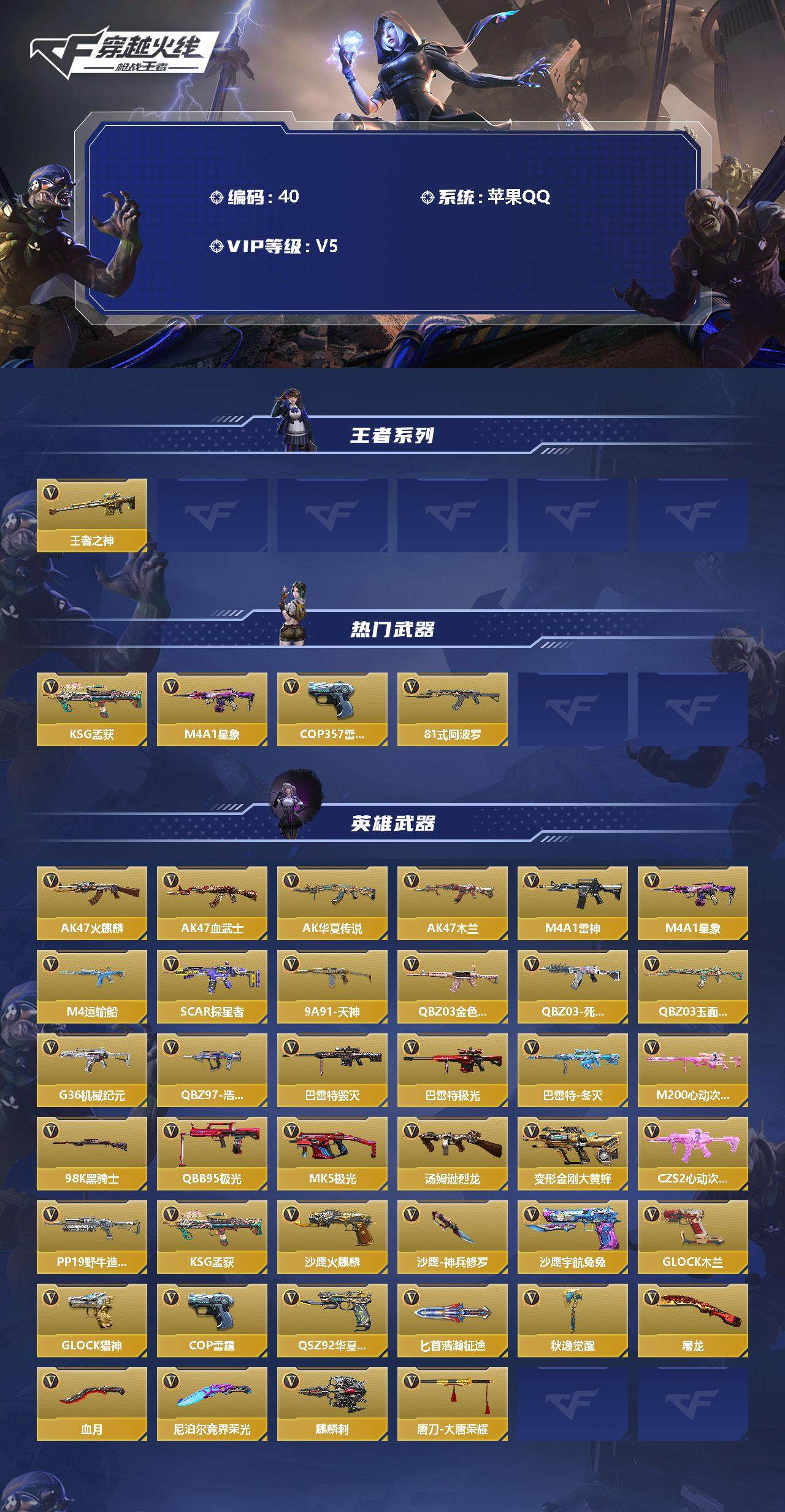 [14149986]81英雄武器数 tt1147 【王者系列】:王者之神 【热门武器】:ksg-孟获,m4a1-星象,cop 357-雷霆,81式-阿波罗 【英雄武器】:ak47-火麒麟,ak47-血武士,ak47-华夏传说,ak47-木兰,m4a1-雷神,m4a1-星象,m4a1-运输船,scar-探星者,9a91-天神,q03-金色蔷薇,q03-死神,q03-玉面羞花,g36-机械纪元,q97-浩瀚征途,芭蕾特-毁灭,芭蕾特-极光,芭蕾特-冬灭,m200-心动次元,98k-黑骑士,qbb95-极光,mk5-极光,汤姆逊-烈龙,qcw05-变形金刚·大黄蜂,czs2-心动次元,pp19野牛-造纸术,ksg-孟获,沙鹰-火麒麟,沙鹰-神兵修罗,沙鹰-宇航兔兔,改装glock-木兰,glock18-猎神,cop 357-雷霆,qsz92-华夏传说,匕首-浩瀚征途,秋逸觉醒,屠龙2,血月2,尼泊尔-竞界荣光,龙鳞-觉醒,麒麟刺,唐刀-华夏传说,唐刀-大唐荣耀2