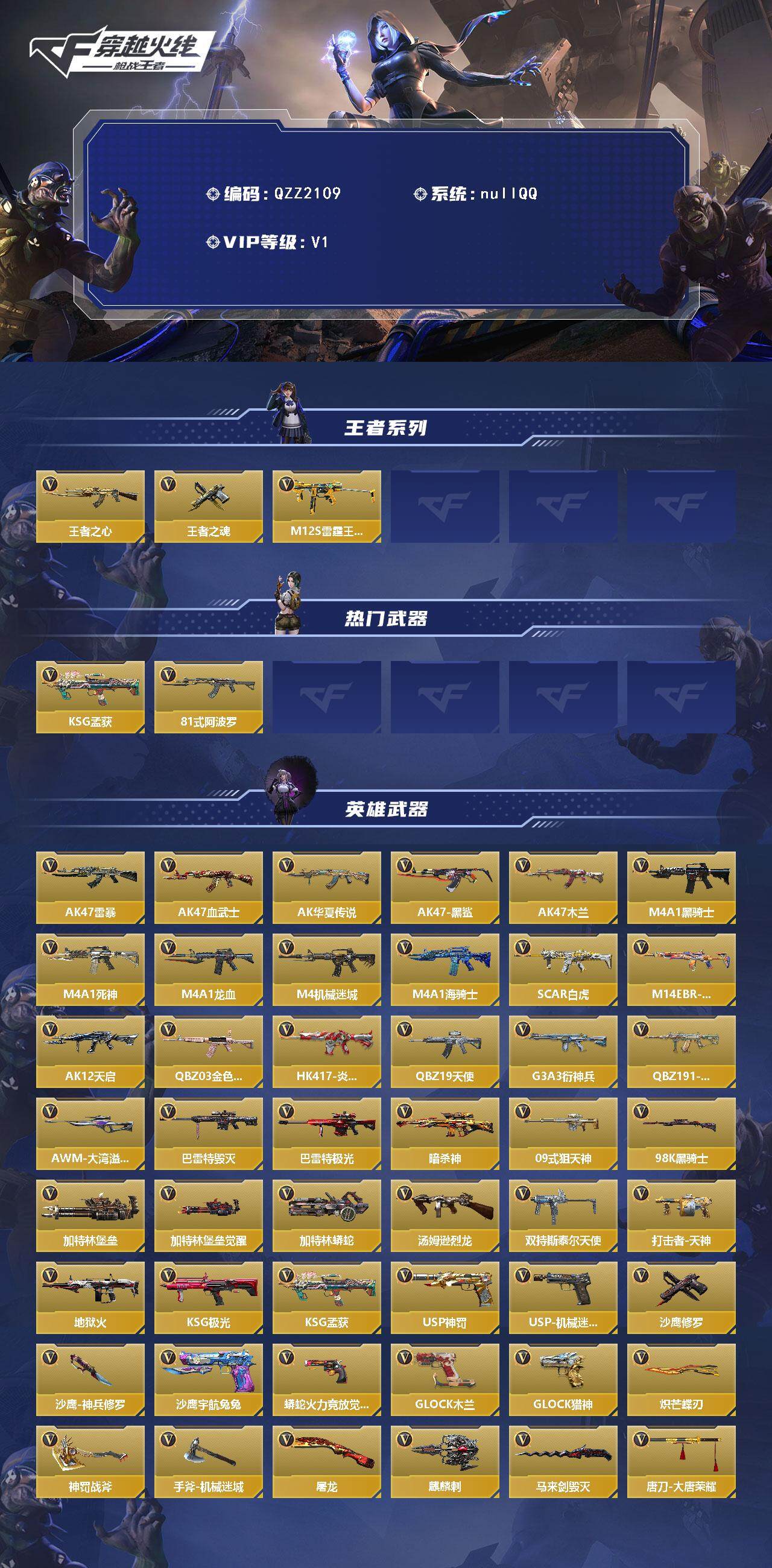 【qzz2109】vip1/106v/王者之心/王者之魂/m12s-雷霆王者/ksg-孟获/81式-阿波罗/ak47-雷暴/ak47-血武士/ak47-华夏传说/ak47-黑鲨/ak47-木兰/m4a1-黑骑士/m4a1-死神/m4a1-龙血/m4a1-机械迷城/m4a1-海骑士/scar light-白虎/m14ebr-拂影/ak12-天启/q03-金色蔷薇/hk417-炎龙铠甲/q19-天使/g3a3-衍神兵/q191-封神榜/awm-大湾溢彩/芭蕾特-毁灭/芭蕾特-极光/暗杀神/09式狙-天神/98k-黑骑士/加特林-堡垒/加特林-堡垒觉醒/加特林-蟒蛇/汤姆逊-烈龙/双持斯泰尔-天使/打击者-天神/地狱火/ksg-极光/usp-神罚/usp-机械迷城/沙鹰-修罗/沙鹰-神兵修罗/沙鹰-宇航兔兔/蟒蛇-火力竞放觉醒/改装glock-木兰/glock18-猎神/双刃-昼伏夜影觉醒/炽芒蝶刃/神罚战斧/手斧-机械迷城/屠龙/麒麟刺/马来剑-毁灭/唐刀-大唐荣耀