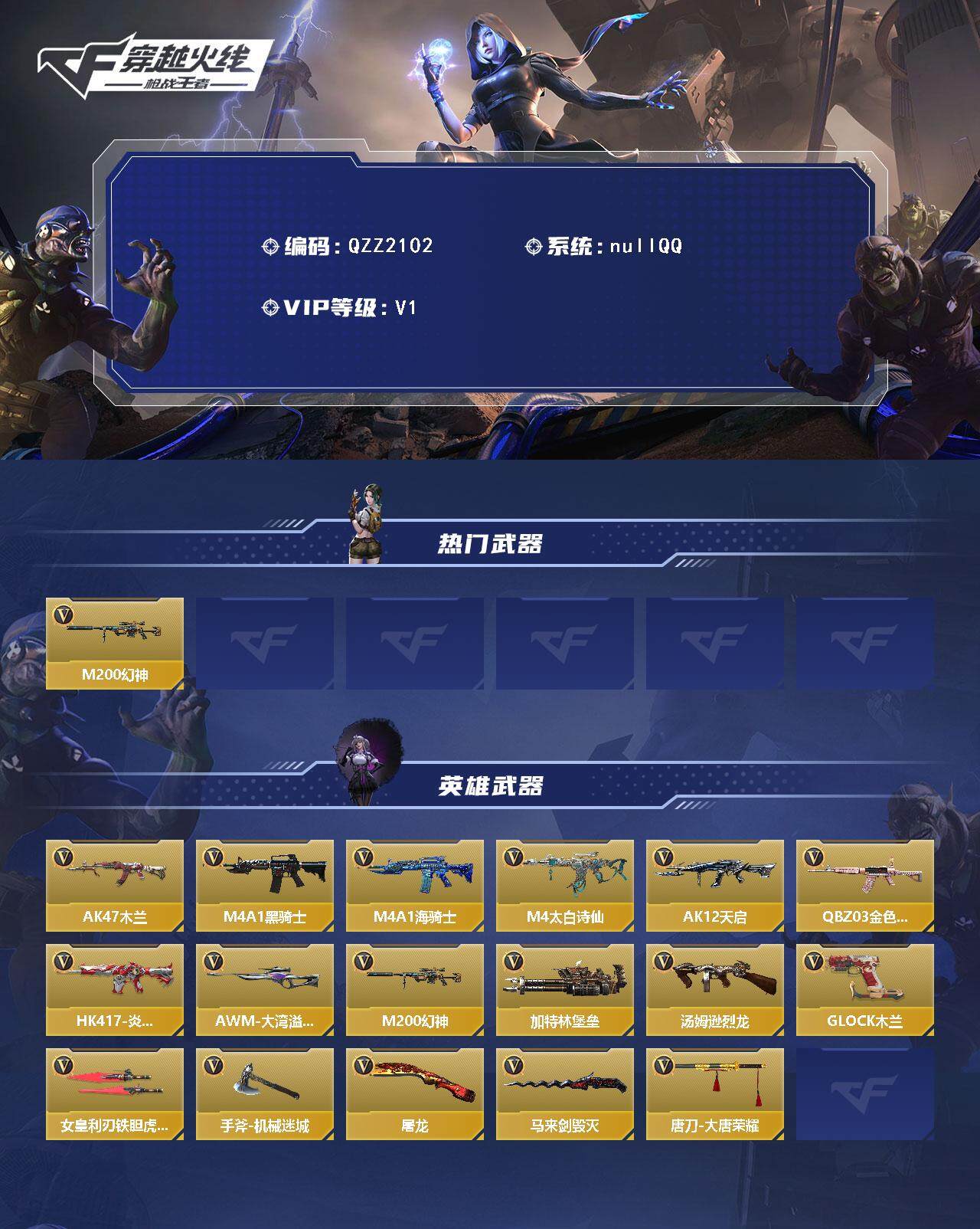 【qzz2102】vip1/33v/m200-幻神/ak47-木兰/m4a1-黑骑士/m4a1-海骑士/m4a1-太白诗仙/ak12-天启/q03-金色蔷薇/hk417-炎龙铠甲/awm-大湾溢彩/加特林-堡垒/汤姆逊-烈龙/改装glock-木兰/女皇利刃-铁胆虎魄/手斧-机械迷城/屠龙/马来剑-毁灭/唐刀-大唐荣耀