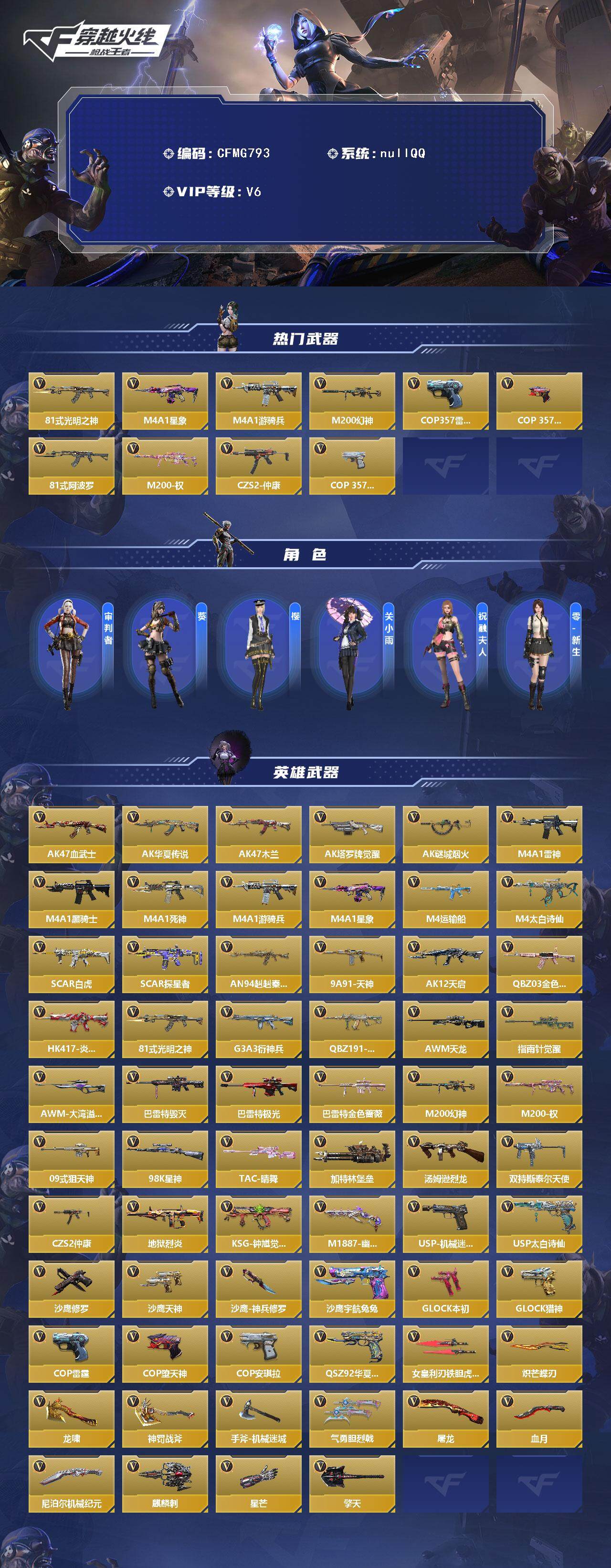 【cfmg793】vip6/164v/81式-光明之神/m4a1-星象/m4a1-游骑兵/m200-幻神/cop357-雷霆/cop 357-堕天神/81式-阿波罗/m200-权/czs2-仲康/cop-357-安琪拉/审判者/葵/樱/关小雨/祝融夫人/零-新生/ak47-血武士/ak47-华夏传说/ak47-木兰/ak47-塔罗牌觉醒/ak47-谜城烟火/m4a1-雷神/m4a1-黑骑士/m