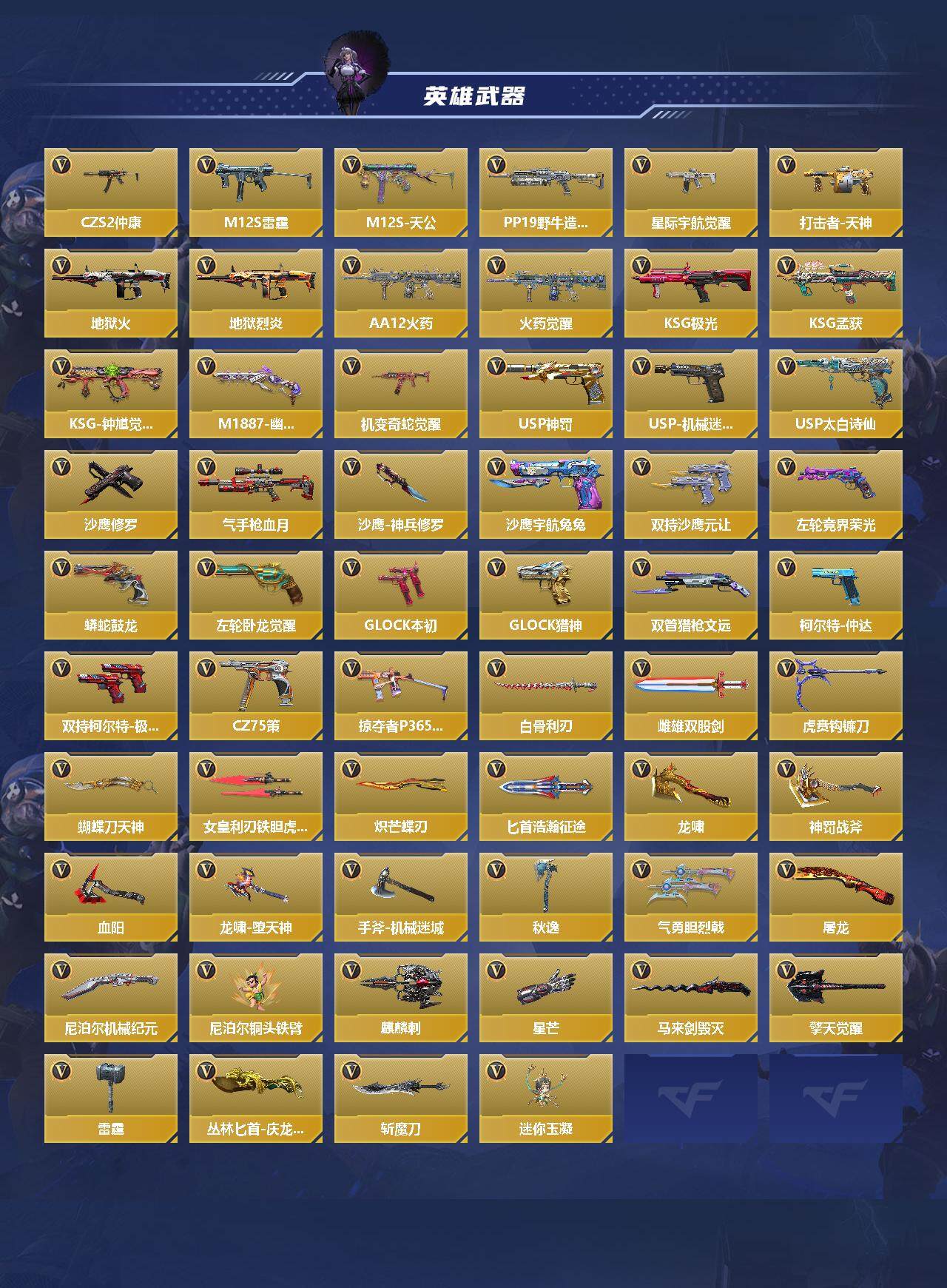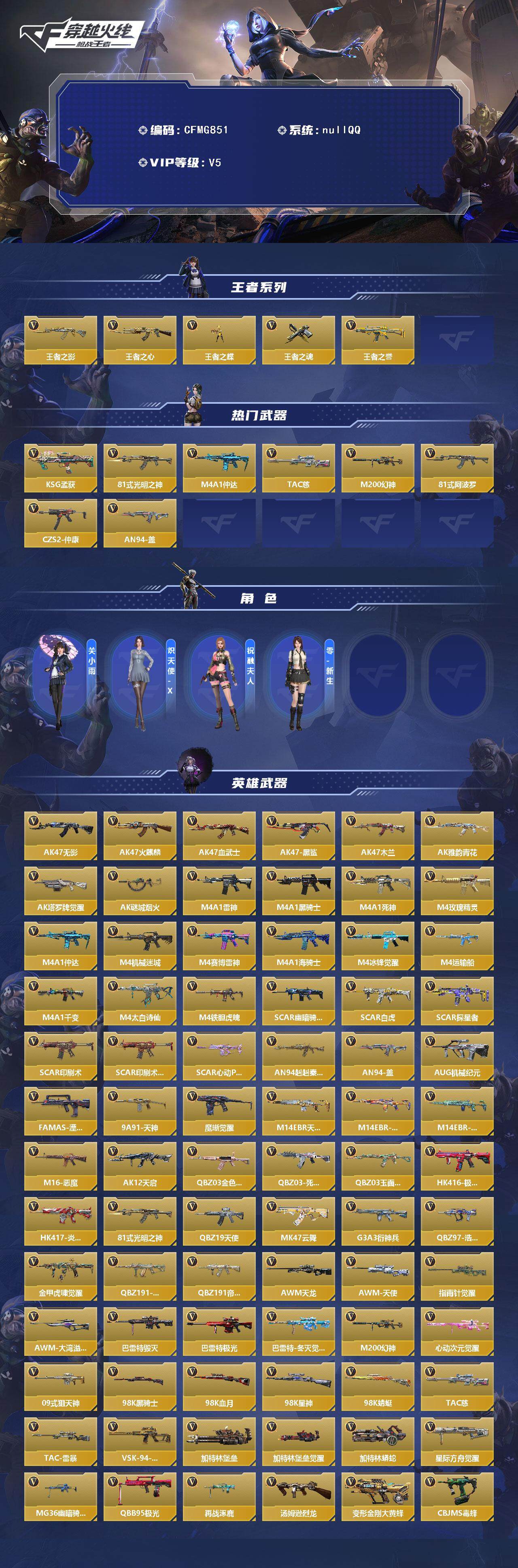 【cfmg851】vip5/304v/5王者/王者之影/王者之心/王者之蝶/王者之魂/王者之誉/ksg-孟获/81式-光明之神/m4a1-仲达/tac-慈/m200-幻神/81式-阿波罗/czs2-仲康/an94-盖/关小雨/炽天使-x/祝融夫人/零-新生/ak47-无影/ak47-火麒麟/ak47-血武士/ak47-黑鲨/ak47-木兰/ak47-雅韵青花/ak47-塔罗牌觉醒/ak47-谜城烟火/m4a1-雷神/m4a1-黑骑士/m4a1-死神/m4a1-玫瑰精灵/m4a1-机械迷城/m4a1-赛博雷神/m4a1-海骑士/m4a1-冰锋觉醒/m4a1-运输船/m4a1-千变/m4a1-太白诗仙/m4a1-铁胆虎魄/scar-幽暗骑士/scar light-白虎/scar-探星者/scar-印刷术/scar-印刷术觉醒/scar-心动pick/an94-赳赳秦师/aug-机械纪元/famas-湮灭/9a91-天神/9a91-魔蜥觉醒/m14ebr-天神/m14ebr-拂影/m14ebr-葫芦山庄/m16-恶魔/ak12-天启/q03-金色蔷薇/q03-死神/q03-玉面羞花/hk416-极光/hk417-炎龙铠甲/q19-天使/mk47-云舞/g3a3-衍神兵/q97-浩瀚征途/q191-金甲虎啸觉醒/q191-封神榜/q191-帝皇铠甲/awm-天龙/awm-天使/awm-指南针觉醒/awm-大湾溢彩/芭蕾特-毁灭/芭蕾特-极光/芭蕾特-冬灭觉醒/m200-心动次元觉醒/09式狙-天神/98k-黑骑士/98k-血月/98k-星神/98k-蜻蜓/tac-雷暴/vsk-94-金蚀/加特林-堡垒/加特林-堡垒觉醒/加特林-蟒蛇/刘易斯-星际方舟觉醒/mg36-幽暗骑士/qbb95-极光/qbb95-再战涿鹿/汤姆逊-烈龙/qcw05-变形金刚·大黄蜂/cbj-ms-毒蜂/m12s-雷霆/m12s-天公/pp19野牛-造纸术/ddm4-pdw-星际宇航觉醒/打击者-天神/地狱火/地狱烈炎/aa12-火药/aa12-火药觉醒/ksg-极光/ksg-钟馗觉醒/m1887-幽冥玄喵觉醒/igin12-机变奇蛇觉醒/usp-神罚/usp-机械迷城/usp-太白诗仙/沙鹰-修罗/气手呛-血月/沙鹰-神兵修罗/沙鹰-宇航兔兔/双持沙鹰-元让/蚩尤战弓觉醒/左轮-竞界荣光/蟒蛇-鼓龙/左轮-卧龙觉醒/双持glock18-本初/glock18-猎神/双管猎呛-文远/柯尔特-仲达/双持柯尔特-极光/cz75-策/掠夺者p365-虹舞/白骨利刃/雌雄双股剑/虎贲钩镰刀/蝴蝶刀-天神/女皇利刃-铁胆虎魄/炽芒蝶刃/匕首-浩瀚征途/龙啸/神罚战斧/血阳/龙啸-堕天神/手斧-机械迷城/秋逸/气勇胆烈戟/屠龙/尼泊尔-机械纪元/尼泊尔-铜头铁臂/龙鳞-觉醒/太白诗仙扇/麒麟刺/星芒/马来剑-毁灭/擎天觉醒/雷霆/丛林匕首-庆龙觉醒/斩魔刀/迷你玉凝