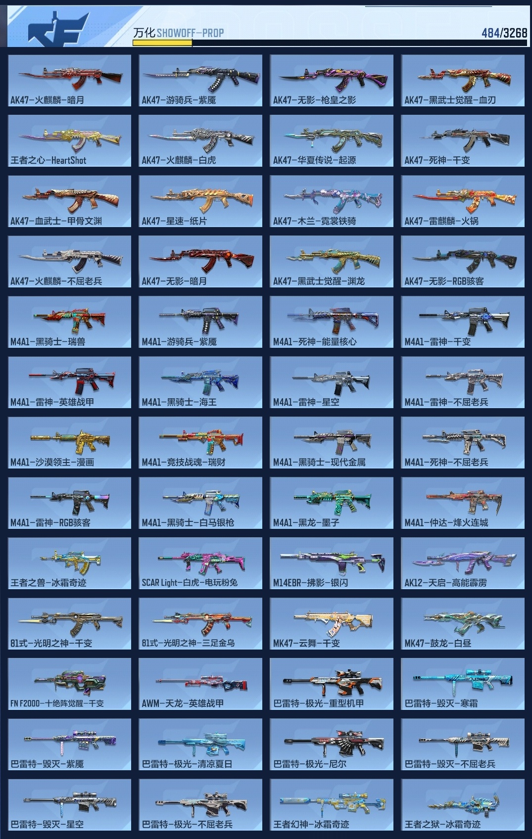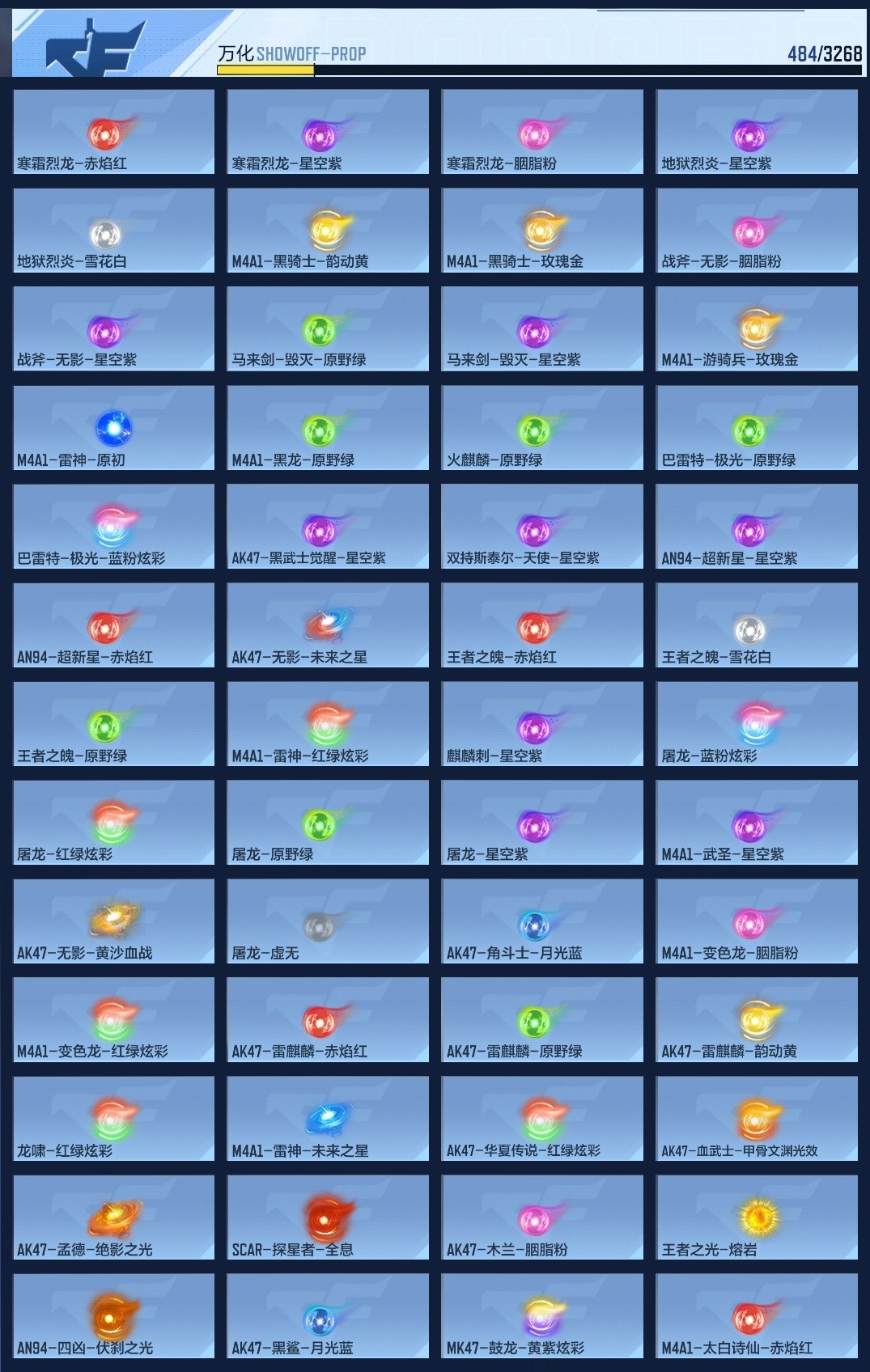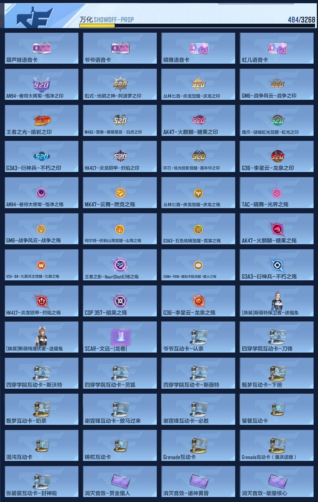 lc624932 【8王者-冰霜王幻-拉丝王心-王光-王狱-星象-七色宝葫-幻神-宙斯-女团虹儿】 万化数量484 音效卡7 狙击呛线1 消灭音效4 语音卡4 抛物线6 音效卡:王者之影-现代战场,王者之心-现代战场,王者之光-现代战场,芭蕾特-毁灭-现代战场,mk47-鼓龙-嘴炮,ak47-无影-现代战场,ak47-火麒麟-电音; 狙击呛线:狙击呛线-诸神黄昏; 消灭音效:消灭音效-赏金猎人,消灭音效-诸神黄昏,消灭音效-能量核心,消灭音效-葫芦娃; 语音卡:晴雅语音卡,爷爷语音卡,葫芦娃语音卡,美女策划语音卡; 抛物线:抛物线-字,抛物线-绿,抛物线-蓝,抛物线-黄,抛物线-粉,抛物线-诸神黄昏;