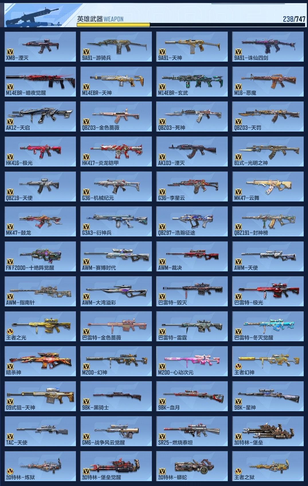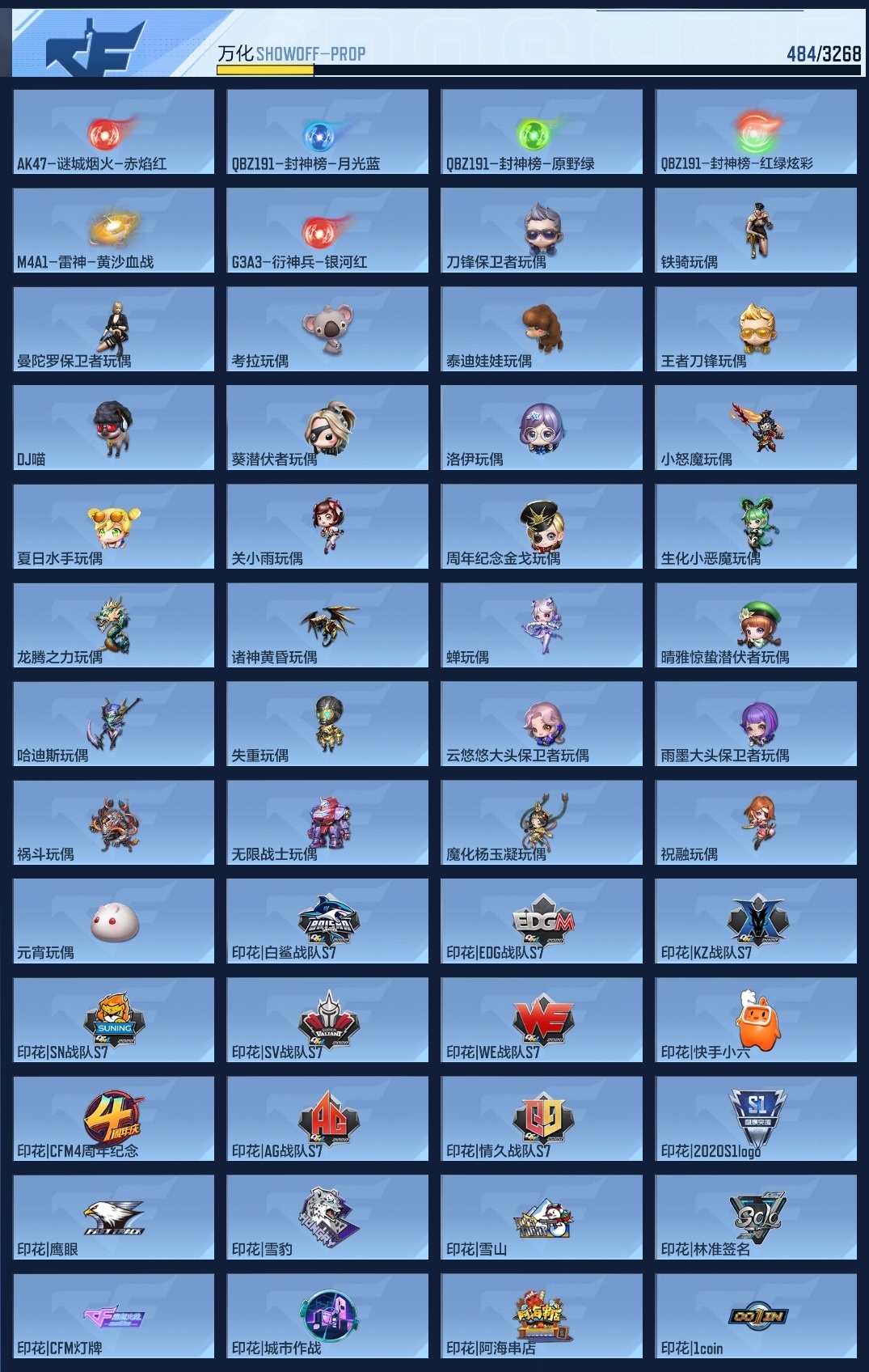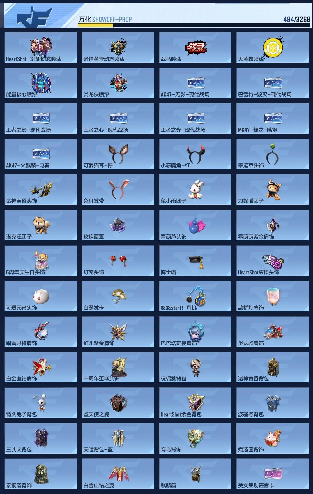 lc624932 【8王者-冰霜王幻-拉丝王心-王光-王狱-星象-七色宝葫-幻神-宙斯-女团虹儿】 万化数量484 音效卡7 狙击呛线1 消灭音效4 语音卡4 抛物线6 音效卡:王者之影-现代战场,王者之心-现代战场,王者之光-现代战场,芭蕾特-毁灭-现代战场,mk47-鼓龙-嘴炮,ak47-无影-现代战场,ak47-火麒麟-电音; 狙击呛线:狙击呛线-诸神黄昏; 消灭音效:消灭音效-赏金猎人,消灭音效-诸神黄昏,消灭音效-能量核心,消灭音效-葫芦娃; 语音卡:晴雅语音卡,爷爷语音卡,葫芦娃语音卡,美女策划语音卡; 抛物线:抛物线-字,抛物线-绿,抛物线-蓝,抛物线-黄,抛物线-粉,抛物线-诸神黄昏;