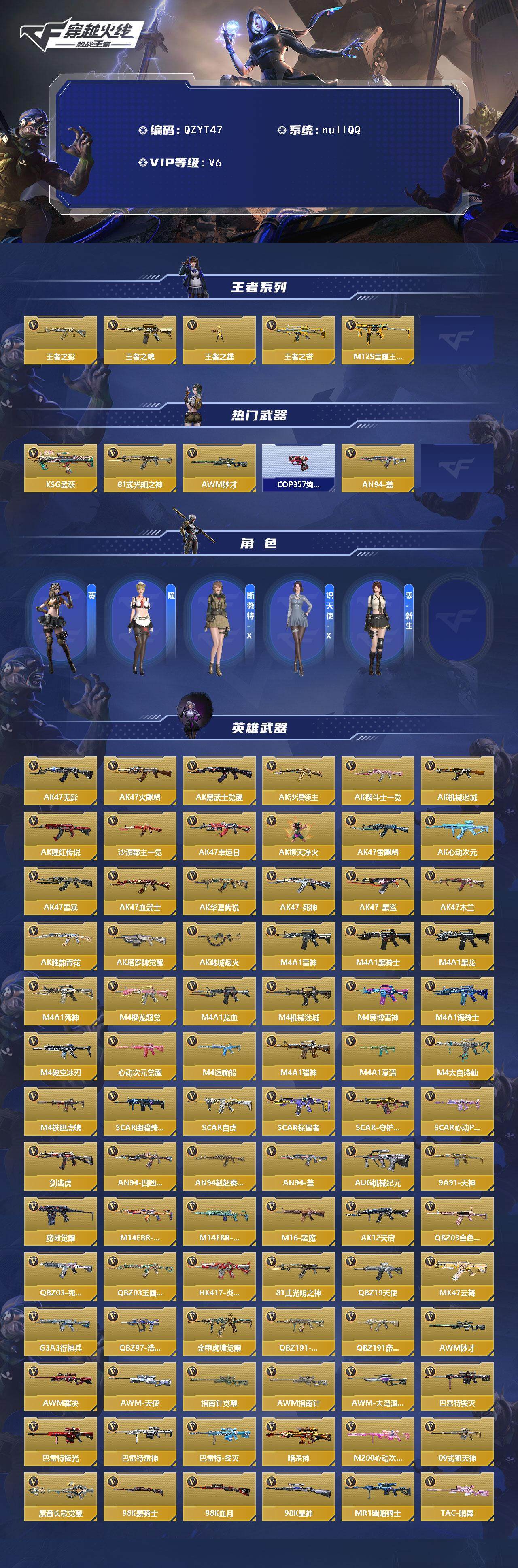 【qzyt47】vip6/303v/王者之影/王者之魄/王者之蝶/王者之誉/m12s-雷霆王者/ksg-孟获/81式-光明之神/awm-妙才/cop 357-绚樱/an94-盖/葵/瞳/斯薇特-x/炽天使-x/零-新生/ak47-无影/ak47-火麒麟/ak47-黑武士觉醒/ak47-沙漠领主/ak47-樱斗士-一觉/ak47-机械迷城/ak47-猩红传说/ak47-沙漠郡主-一觉/ak47-