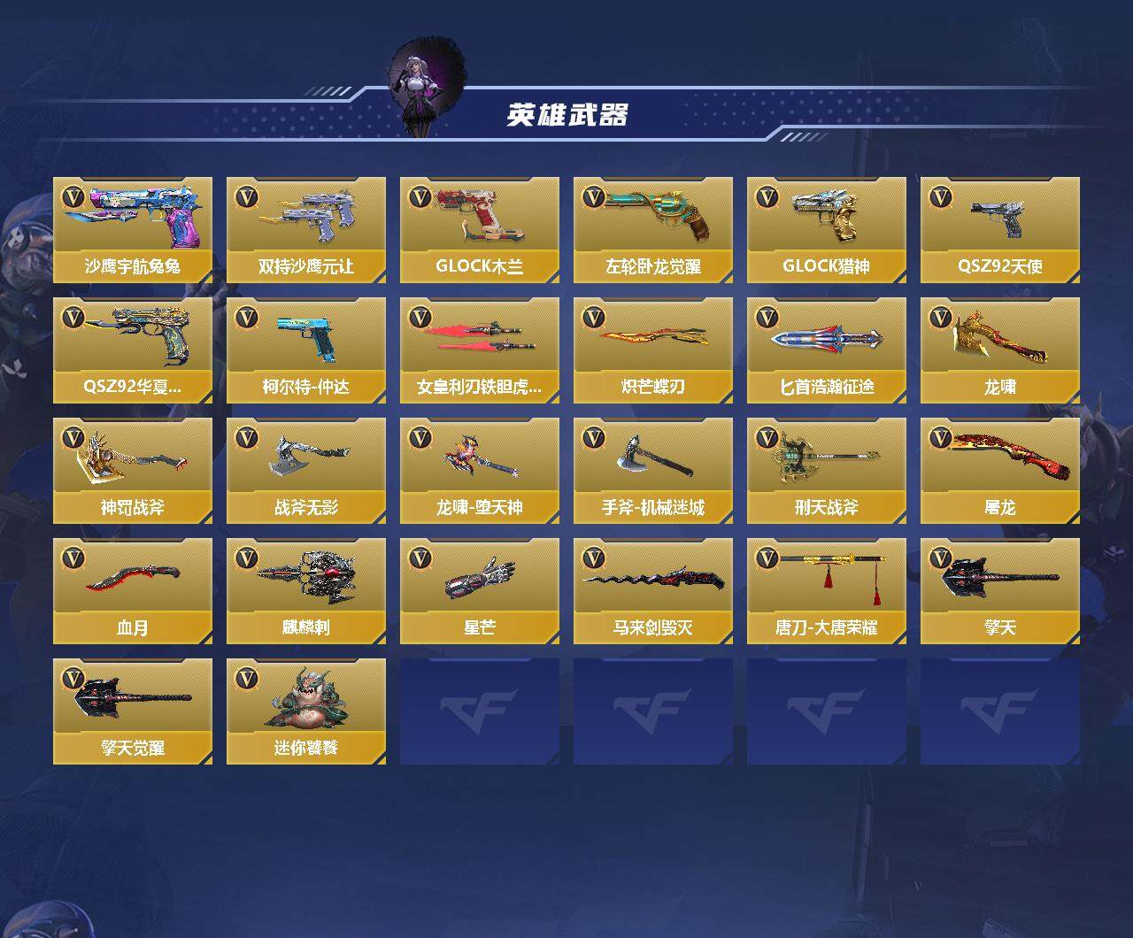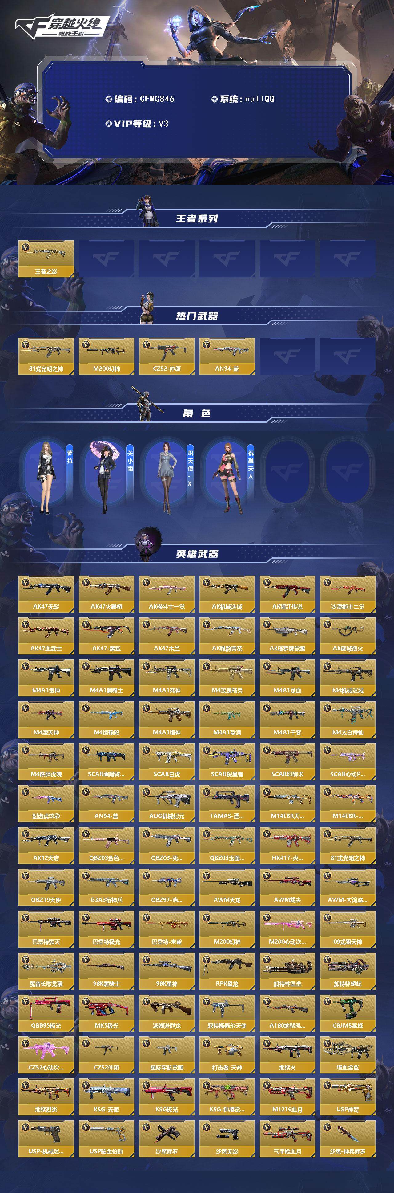 【cfmg846】vip3/237v/王者之影/81式-光明之神/m200-幻神/czs2-仲康/an94-盖/萝拉/关小雨/炽天使-x/祝融夫人/ak47-无影/ak47-火麒麟/ak47-樱斗士-一觉/ak47-机械迷城/ak47-猩红传说/ak47-沙漠郡主-二觉/ak47-血武士/ak47-黑鲨/ak47-木兰/ak47-雅韵青花/ak47-塔罗牌觉醒/ak47-谜城烟火/m4a1-雷神/m4a1-黑骑士/m4a1-死神/m4a1-玫瑰精灵/m4a1-龙血/m4a1-机械迷城/m4a1-堕天神/m4a1-运输船/m4a1-猎神/m4a1-夏清/m4a1-千变/m4a1-太白诗仙/m4a1-铁胆虎魄/scar-幽暗骑士/scar light-白虎/scar-探星者/scar-印刷术/scar-心动pick/剑齿虎-炫彩/aug-机械纪元/famas-湮灭/m14ebr-天神/m14ebr-拂影/ak12-天启/q03-金色蔷薇/q03-死神/q03-玉面羞花/hk417-炎龙铠甲/q19-天使/g3a3-衍神兵/q97-浩瀚征途/awm-天龙/awm-裁决/awm-大湾溢彩/芭蕾特-毁灭/芭蕾特-极光/芭蕾特-朱雀/m200-心动次元/09式狙-天神/09式狙-魔音长歌觉醒/98k-黑骑士/98k-星神/rpk-盘龙/加特林-堡垒/加特林-蟒蛇/qbb95-极光/mk5-极光/汤姆逊-烈龙/双持斯泰尔-天使/a180-地狱凤凰/cbj-ms-毒蜂/czs2-心动次元/ddm4-pdw-星际宇航觉醒/打击者-天神/地狱火/嗜血金鲨/地狱烈炎/ksg-天使/ksg-极光/ksg-钟馗觉醒/m1216-血月/usp-神罚/usp-机械迷城/usp-耀金伯爵/沙鹰-修罗/沙鹰-无影/气手呛-血月/沙鹰-神兵修罗/沙鹰-宇航兔兔/双持沙鹰-元让/改装glock-木兰/左轮-卧龙觉醒/glock18-猎神/qsz92-天使/qsz92-华夏传说/柯尔特-仲达/女皇利刃-铁胆虎魄/炽芒蝶刃/匕首-浩瀚征途/龙啸/神罚战斧/战斧-无影/龙啸-堕天神/手斧-机械迷城/刑天战斧/屠龙/血月/太白诗仙扇/麒麟刺/星芒/马来剑-毁灭/唐刀-华夏传说/唐刀-大唐荣耀/擎天/擎天觉醒/迷你饕餮