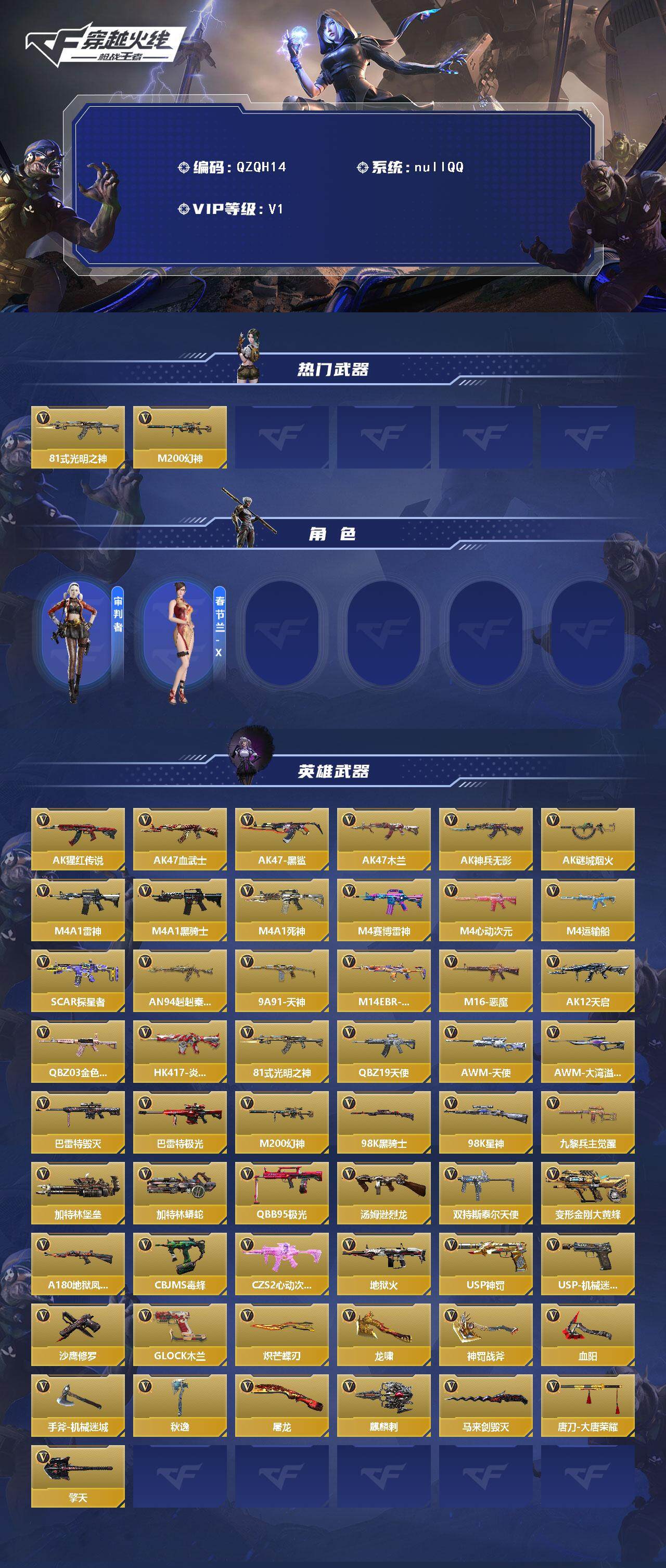 【qzqh14】vip1/92v/81式-光明之神/m200-幻神/审判者/春节兰-x/ak47-猩红传说/ak47-血武士/ak47-黑鲨/ak47-木兰/ak47-神兵无影/ak47-谜城烟火/m4a1-雷神/m4a1-黑骑士/m4a1-死神/m4a1-赛博雷神/m4a1-心动次元/m4a1-运输船/scar-探星者/an94-赳赳秦师/9a91-天神/m14ebr-拂影/m16-恶魔/ak12-天启/q03-金色蔷薇/hk417-炎龙铠甲/q19-天使/awm-天使/awm-大湾溢彩/芭蕾特-毁灭/芭蕾特-极光/98k-黑骑士/98k-星神/vsk-94-九黎兵主觉醒/加特林-堡垒/加特林-蟒蛇/qbb95-极光/汤姆逊-烈龙/双持斯泰尔-天使/qcw05-变形金刚·大黄蜂/a180-地狱凤凰/cbj-ms-毒蜂/czs2-心动次元/地狱火/usp-神罚/usp-机械迷城/沙鹰-修罗/改装glock-木兰/炽芒蝶刃/龙啸/神罚战斧/血阳/手斧-机械迷城/秋逸/屠龙/麒麟刺/马来剑-毁灭/唐刀-华夏传说/唐刀-大唐荣耀/擎天