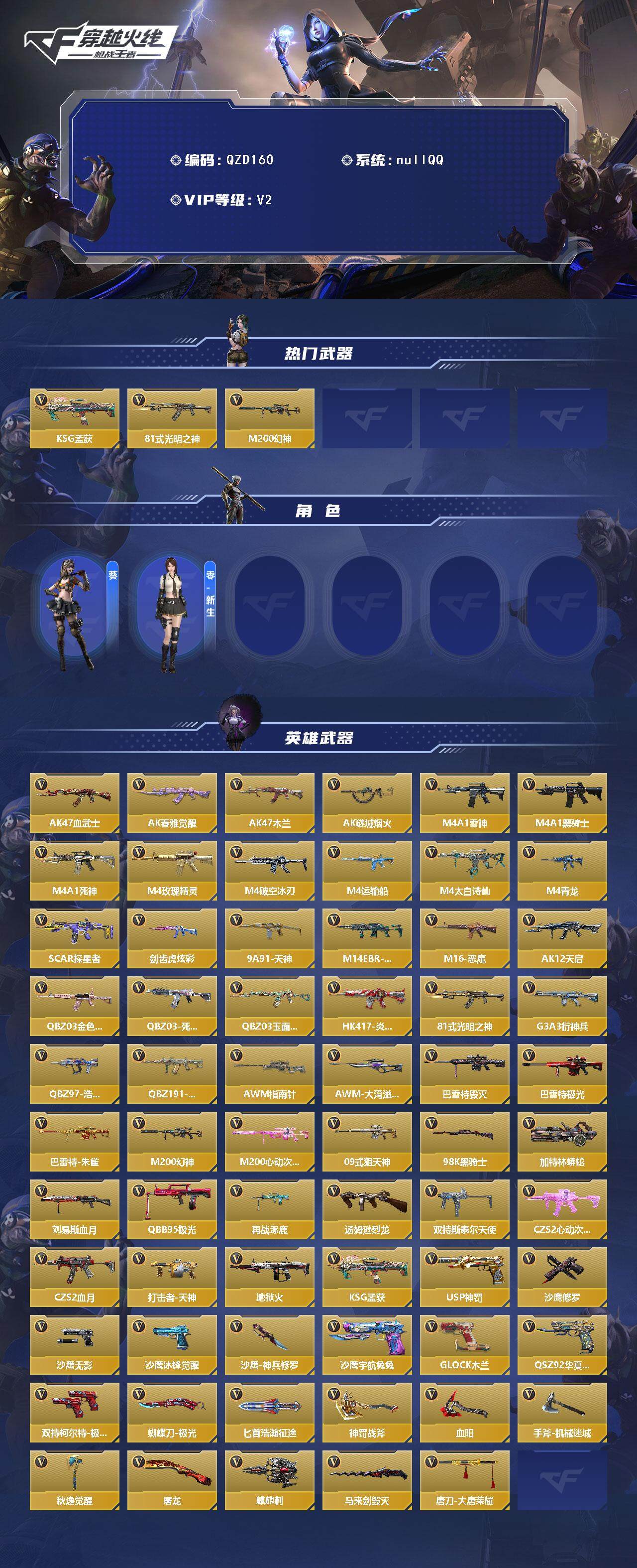 【qzd160】vip2/123v/ksg-孟获/81式-光明之神/m200-幻神/葵/零-新生/ak47-血武士/ak47-春雅觉醒/ak47-木兰/ak47-谜城烟火/m4a1-雷神/m4a1-黑骑士/m4a1-死神/m4a1-玫瑰精灵/m4a1-破空冰刃/m4a1-运输船/m4a1-太白诗仙/m4a1-青龙/scar-探星者/剑齿虎-炫彩/9a91-天神/m14ebr-玄武/m16-恶魔/ak12-天启/q03-金色蔷薇/q03-死神/q03-玉面羞花/hk417-炎龙铠甲/g3a3-衍神兵/q97-浩瀚征途/q191-封神榜/awm-指南针/awm-大湾溢彩/芭蕾特-毁灭/芭蕾特-极光/芭蕾特-朱雀/m200-心动次元/09式狙-天神/98k-黑骑士/加特林-蟒蛇/刘易斯-血月/qbb95-极光/qbb95-再战涿鹿/汤姆逊-烈龙/双持斯泰尔-天使/czs2-心动次元/czs2-血月/打击者-天神/地狱火/usp-神罚/沙鹰-修罗/沙鹰-无影/沙鹰-冰锋觉醒/沙鹰-神兵修罗/沙鹰-宇航兔兔/改装glock-木兰/改装glock-魔杀族/qsz92-华夏传说/双持柯尔特-极光/蝴蝶刀-极光/匕首-浩瀚征途/神罚战斧/血阳/手斧-机械迷城/秋逸觉醒/屠龙/麒麟刺/马来剑-毁灭/唐刀-华夏传说/唐刀-大唐荣耀