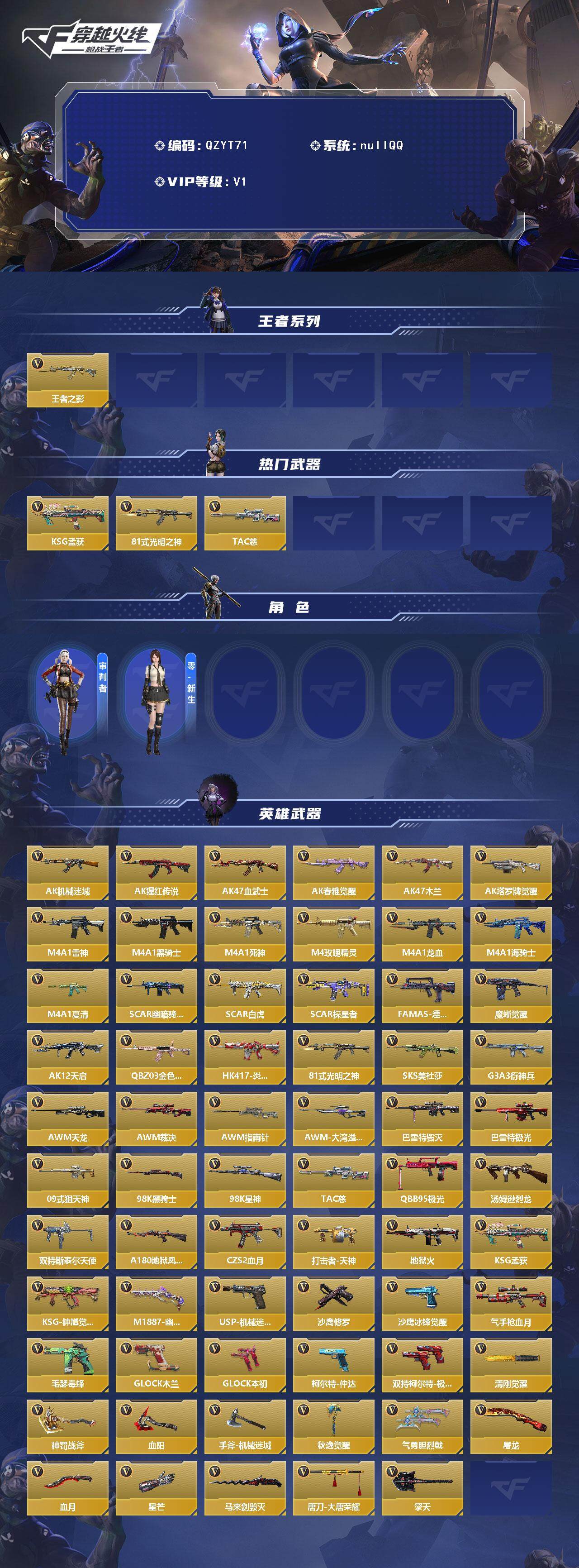 【qzyt71】vip1/125v/王者之影/ksg-孟获/81式-光明之神/tac-慈/审判者/零-新生/ak47-机械迷城/ak47-猩红传说/ak47-血武士/ak47-春雅觉醒/ak47-木兰/ak47-塔罗牌觉醒/m4a1-雷神/m4a1-黑骑士/m4a1-死神/m4a1-玫瑰精灵/m4a1-龙血/m4a1-海骑士/m4a1-夏清/scar-幽暗骑士/scar light-白虎/scar-探星者/famas-湮灭/9a91-魔蜥觉醒/ak12-天启/q03-金色蔷薇/hk417-炎龙铠甲/sks-美杜莎/g3a3-衍神兵/awm-天龙/awm-裁决/awm-指南针/awm-大湾溢彩/芭蕾特-毁灭/芭蕾特-极光/09式狙-天神/98k-黑骑士/98k-星神/qbb95-极光/汤姆逊-烈龙/双持斯泰尔-天使/a180-地狱凤凰/czs2-血月/打击者-天神/地狱火/ksg-钟馗觉醒/m1887-幽冥玄喵觉醒/usp-机械迷城/沙鹰-修罗/沙鹰-冰锋觉醒/气手呛-血月/毛瑟-毒蜂/改装glock-木兰/双持glock18-本初/柯尔特-仲达/双持柯尔特-极光/清刚-觉醒/神罚战斧/血阳/手斧-机械迷城/秋逸觉醒/气勇胆烈戟/屠龙/血月/星芒/马来剑-毁灭/唐刀-大唐荣耀/擎天