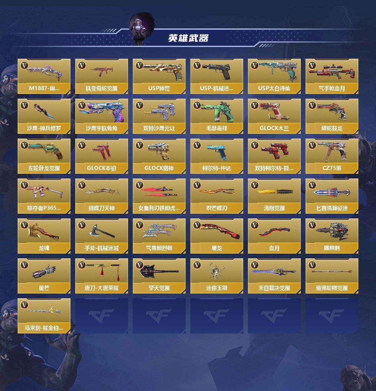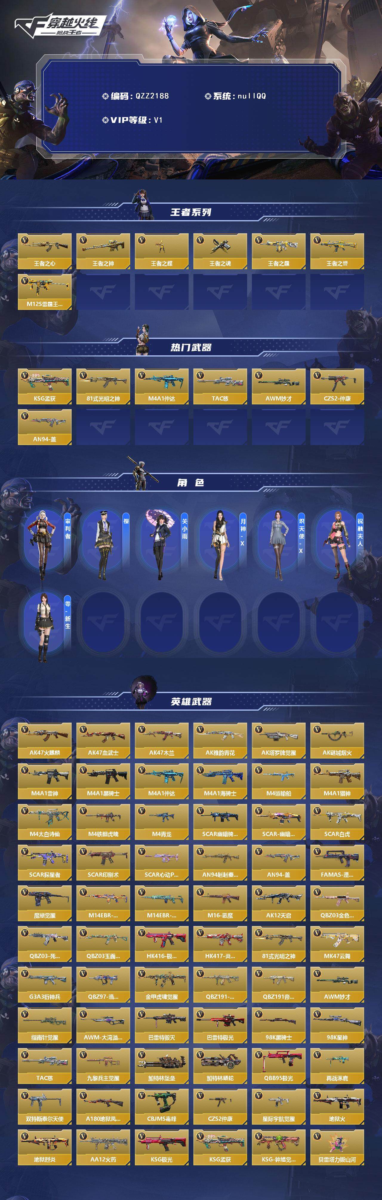 【qzz2188】vip1/228v/王者之心/王者之神/王者之蝶/王者之魂/王者之霆/王者之誉/m12s-雷霆王者/ksg-孟获/81式-光明之神/m4a1-仲达/tac-慈/awm-妙才/czs2-仲康/an94-盖/审判者/樱/关小雨/月神-x/炽天使-x/祝融夫人/零-新生/ak47-火麒麟/ak47-血武士/ak47-木兰/ak47-雅韵青花/ak47-塔罗牌觉醒/ak47-谜城烟火/m4a1-雷神/m4a1-黑骑士/m4a1-海骑士/m4a1-运输船/m4a1-猎神/m4a1-太白诗仙/m4a1-铁胆虎魄/m4a1-青龙/scar-幽暗骑士/scar-幽暗骑士觉醒/scar light-白虎/scar-探星者/scar-印刷术/scar-心动pick/an94-赳赳秦师/famas-湮灭/9a91-魔蜥觉醒/m14ebr-拂影/m14ebr-葫芦山庄/m16-恶魔/ak12-天启/q03-金色蔷薇/q03-死神/q03-玉面羞花/hk416-极光/hk417-炎龙铠甲/mk47-云舞/g3a3-衍神兵/q97-浩瀚征途/q191-金甲虎啸觉醒/q191-封神榜/q191-帝皇铠甲/awm-指南针觉醒/awm-大湾溢彩/芭蕾特-毁灭/芭蕾特-极光/98k-黑骑士/98k-星神/vsk-94-九黎兵主觉醒/加特林-堡垒/加特林-蟒蛇/qbb95-极光/qbb95-再战涿鹿/双持斯泰尔-天使/a180-地狱凤凰/cbj-ms-毒蜂/ddm4-pdw-星际宇航觉醒/地狱火/地狱烈炎/aa12-火药/ksg-极光/ksg-钟馗觉醒/贝雷塔-力拔山河/m1887-幽冥玄喵觉醒/igin12-机变奇蛇觉醒/usp-神罚/usp-机械迷城/usp-太白诗仙/气手呛-血月/沙鹰-神兵修罗/沙鹰-宇航兔兔/双持沙鹰-元让/毛瑟-毒蜂/改装glock-木兰/蟒蛇-鼓龙/左轮-卧龙觉醒/双持glock18-本初/glock18-猎神/柯尔特-仲达/双持柯尔特-极光/cz75-策/掠夺者p365-虹舞/蝴蝶刀-天神/女皇利刃-铁胆虎魄/炽芒蝶刃/清刚-觉醒/匕首-浩瀚征途/龙啸/手斧-机械迷城/气勇胆烈戟/屠龙/血月/太白诗仙扇/麒麟刺/星芒/唐刀-大唐荣耀/擎天觉醒/迷你玉凝/末日裁决觉醒/破邪蛇棍觉醒/马来剑-耀金伯爵