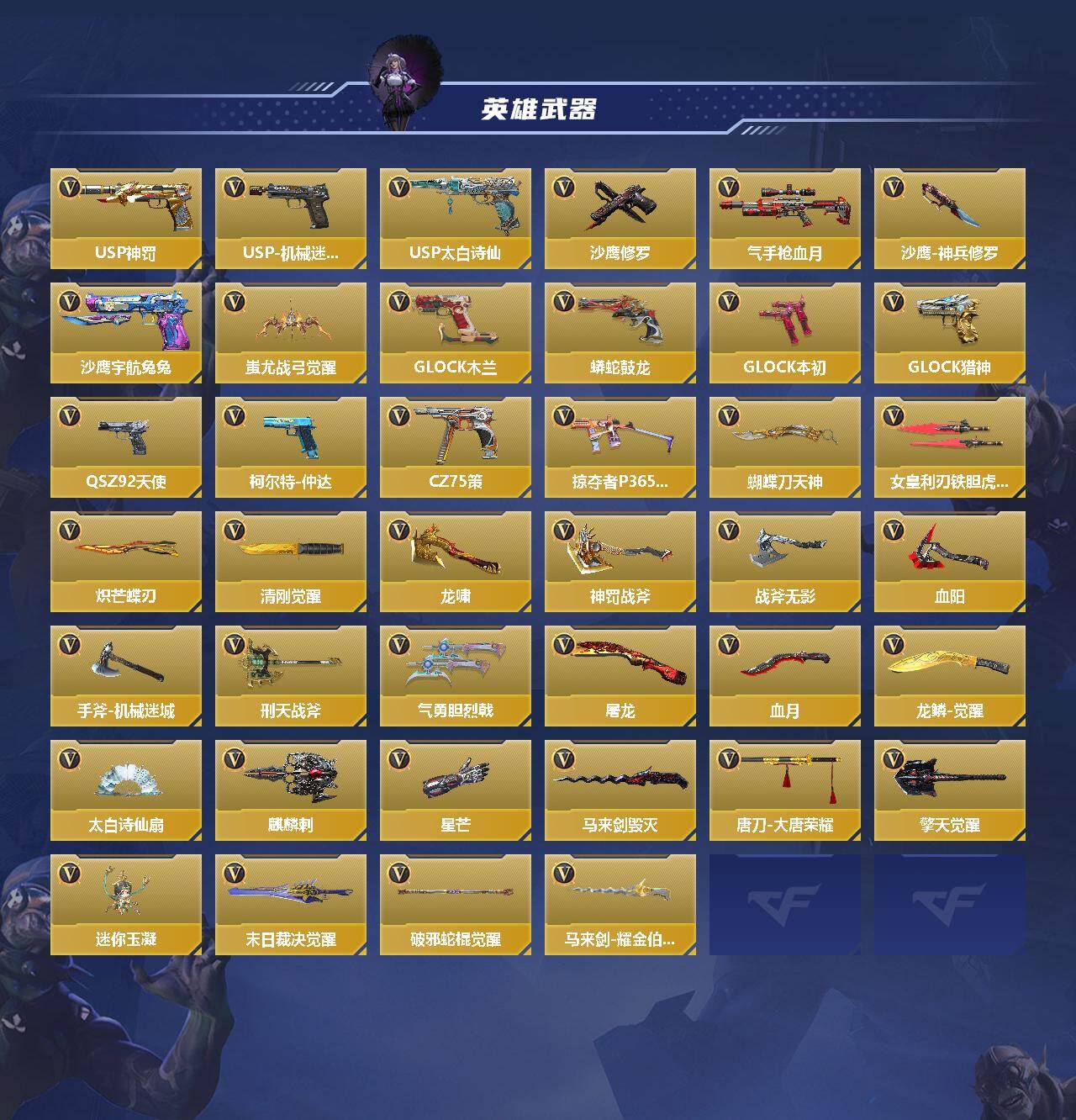 【qzz2264】vip3/265v/王者之影/王者之蝶/王者之狱/王者之霆/王者之誉/ksg-孟获/81式-光明之神/m4a1-仲达/awm-妙才/81式-阿波罗/czs2-仲康/零-水下丽影/炽天使-x/零-新生/九安-x/ak47-无影/ak47-火麒麟/ak47-黑武士觉醒/ak47-猩红传说/ak47-血武士/ak47-华夏传说/ak47-死神/ak47-木兰/ak47-雅韵青花/ak47-塔罗牌觉醒/ak47-谜城烟火/m4a1-雷神/m4a1-黑骑士/m4a1-黑龙/m4a1-死神/m4a1-玫瑰精灵/m4a1-龙血/m4a1-海骑士/m4a1-冰锋觉醒/m4a1-破空冰刃/m4a1-运输船/m4a1-猎神/m4a1-千变/m4a1-太白诗仙/m4a1-铁胆虎魄/scar-幽暗骑士/scar light-白虎/scar-探星者/scar-印刷术/scar-心动pick/an94-赳赳秦师/aug-机械纪元/9a91-魔蜥觉醒/m14ebr-拂影/m14ebr-玄武/m14ebr-葫芦山庄/m16-恶魔/ak12-天启/q03-湮灭/q03-金色蔷薇/q03-死神/q03-玉面羞花/q19-天使/mk47-云舞/sks-曳鼎/g3a3-五色琉璃觉醒/g3a3-衍神兵/q191-金甲虎啸觉醒/q191-封神榜/awm-指南针/awm-大湾溢彩/芭蕾特-毁灭/芭蕾特-极光/09式狙-天神/09式狙-魔音长歌觉醒/98k-黑骑士/98k-星神/tac-晴舞/vsk-94-九黎兵主觉醒/加特林-堡垒/加特林-炼狱/加特林-堡垒觉醒/加特林-蟒蛇/qbb95-极光/qbb95-再战涿鹿/汤姆逊-烈龙/寒霜烈龙/双持斯泰尔-天使/cbj-ms-毒蜂/czs2-善财童子/打击者-天神/地狱火/地狱烈炎/aa12-火药/aa12-火药觉醒/ksg-极光/ksg-钟馗觉醒/贝雷塔-力拔山河/igin12-机变奇蛇觉醒/usp-神罚/usp-机械迷城/usp-太白诗仙/沙鹰-修罗/气手呛-血月/沙鹰-神兵修罗/沙鹰-宇航兔兔/蚩尤战弓觉醒/改装glock-木兰/蟒蛇-鼓龙/双持glock18-本初/glock18-猎神/qsz92-天使/柯尔特-仲达/cz75-策/掠夺者p365-虹舞/蝴蝶刀-天神/女皇利刃-铁胆虎魄/炽芒蝶刃/清刚-觉醒/龙啸/神罚战斧/战斧-无影/血阳/手斧-机械迷城/刑天战斧/气勇胆烈戟/屠龙/血月/龙鳞-觉醒/太白诗仙扇/麒麟刺/星芒/马来剑-毁灭/唐刀-大唐荣耀/擎天觉醒/迷你玉凝/末日裁决觉醒/破邪蛇棍觉醒/马来剑-耀金伯爵