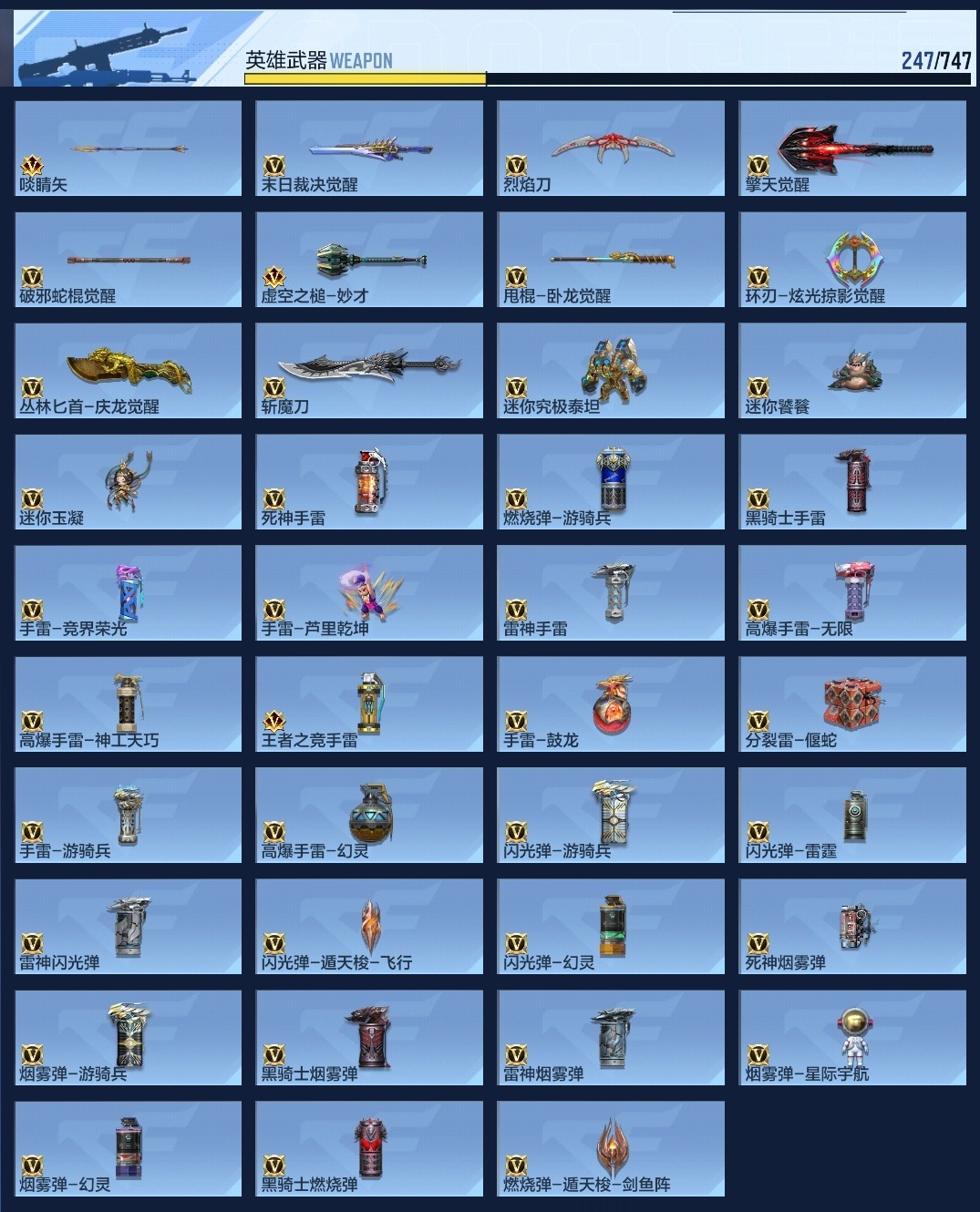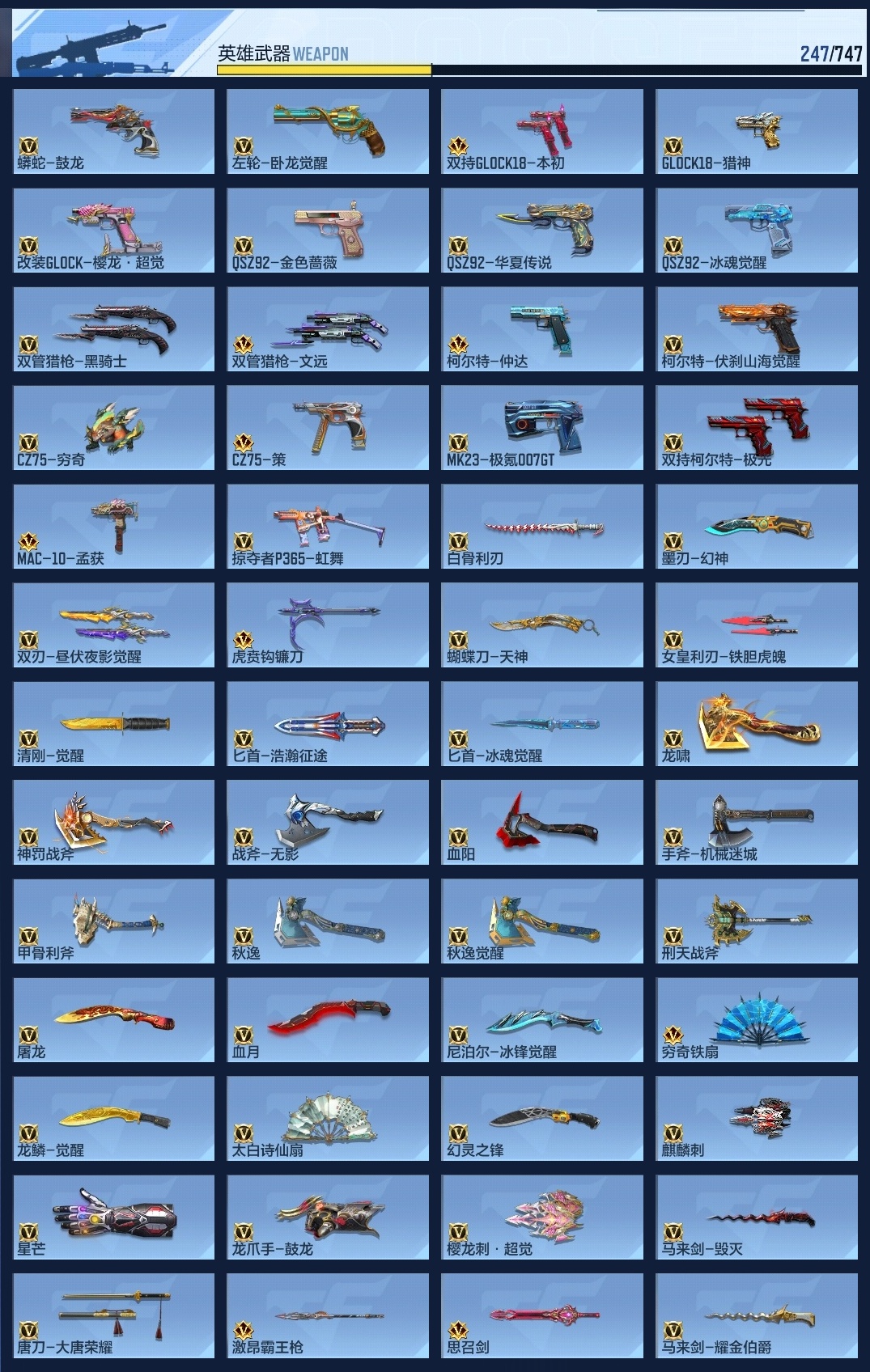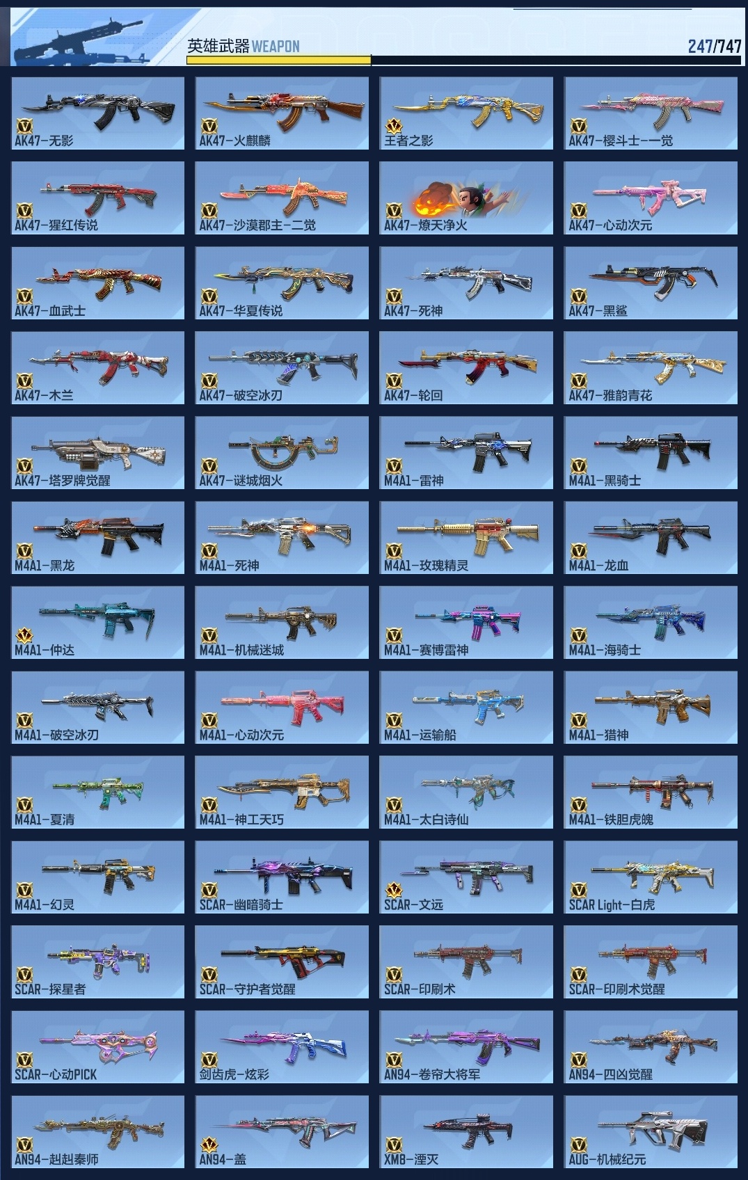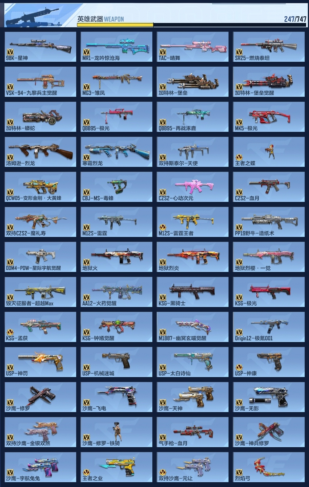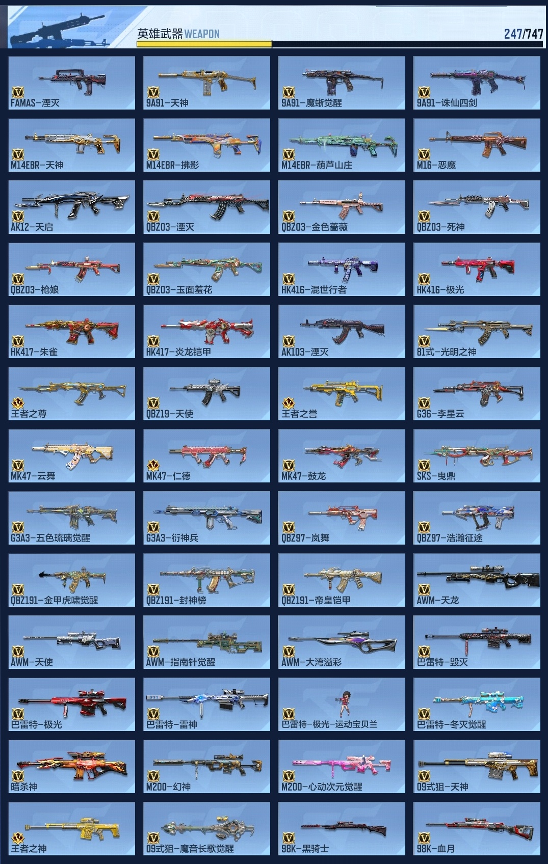 647256 【极品6王者-冰皮王神-烽火仲达套-赢魔仁德-过载文远套-幻神-盖】 王者v武器数量7 英雄武器数量247 音效卡数量11 万化数量489 vip等级【文本】vip5级 【大师】 【支持】 【是】 【可排位】 音效卡12 狙击呛线4 消灭音效4 语音卡2 抛物线6 音效卡:王者之影-现代战场,王者之心-现代战场,ak47-无影-电音,芭蕾特-毁灭-现代战场,m4a1-仲达-原汁原味,mk47-鼓龙-嘴炮,m4a1-雷神-电音,ak47-火麒麟-电音,98k-星神-电音,m4a1-仲达-过载之音,激昂霸王呛-古代战场,气勇胆烈戟-古代战场; 狙击呛线:狙击呛线-诸神黄昏,狙击呛线-heartshot,awm-裁决-流光之线,狙击呛线-过载; 消灭音效:消灭音效-诸神黄昏,消灭音效-能量核心,消灭音效-斩杀,消灭音效-炎龙铠甲; 语音卡:葫芦娃语音卡,云悠悠语音卡; 抛物线:抛物线-能量核心,抛物线-heartshot,抛物线-绿,抛物线-蓝,抛物线-黄,抛物线-粉;