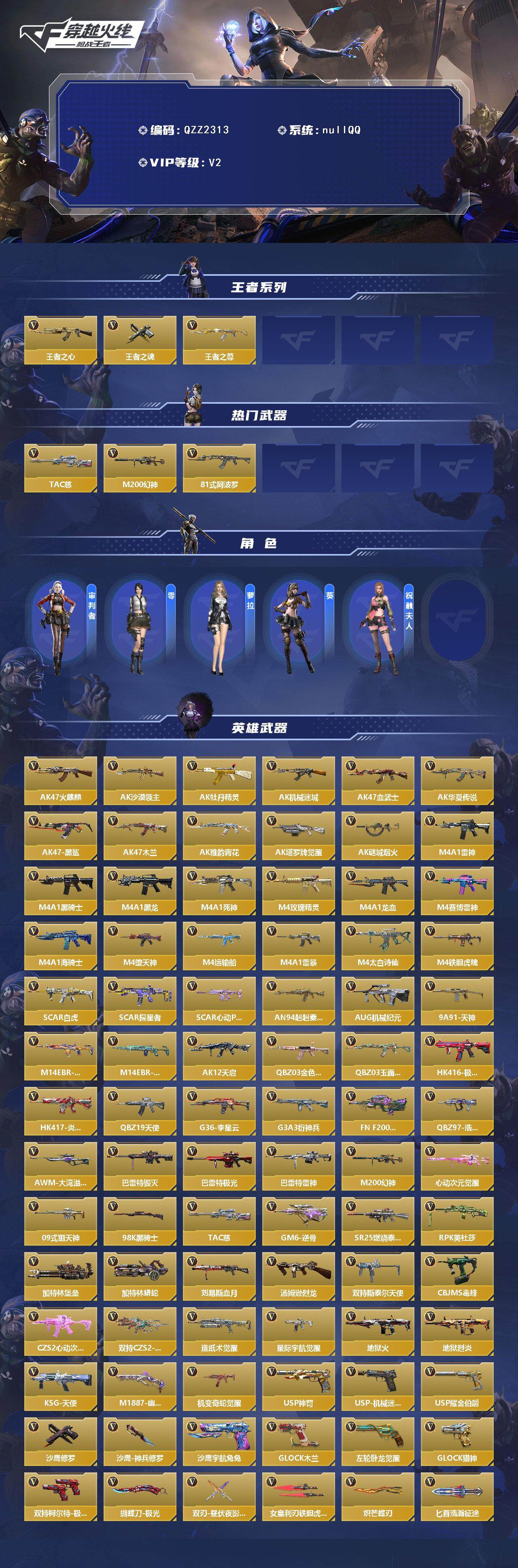【qzz2313】vip2/197v/王者之心/王者之魂/王者之尊/tac-慈/m200-幻神/81式-阿波罗/审判者/零/萝拉/葵/祝融夫人/ak47-火麒麟/ak47-沙漠领主/ak47-牡丹精灵/ak47-机械迷城/ak47-血武士/ak47-华夏传说/ak47-黑鲨/ak47-木兰/ak47-雅韵青花/ak47-塔罗牌觉醒/ak47-谜城烟火/m4a1-雷神/m4a1-黑骑士/m4a1-黑龙/m4a1-死神/m4a1-玫瑰精灵/m4a1-龙血/m4a1-赛博雷神/m4a1-海骑士/m4a1-堕天神/m4a1-运输船/m4a1-雷暴/m4a1-太白诗仙/m4a1-铁胆虎魄/scar light-白虎/scar-探星者/scar-心动pick/an94-赳赳秦师/aug-机械纪元/9a91-天神/m14ebr-拂影/m14ebr-葫芦山庄/ak12-天启/q03-金色蔷薇/q03-玉面羞花/hk416-极光/hk417-炎龙铠甲/q19-天使/g36-李星云/g3a3-衍神兵/fn f2000-十绝阵觉醒/q97-浩瀚征途/awm-大湾溢彩/芭蕾特-毁灭/芭蕾特-极光/芭蕾特-雷神/m200-心动次元觉醒/09式狙-天神/98k-黑骑士/gm6-逆骨/sr25-燃烧泰坦/rpk-美杜莎/加特林-堡垒/加特林-蟒蛇/刘易斯-血月/汤姆逊-烈龙/双持斯泰尔-天使/cbj-ms-毒蜂/czs2-心动次元/双持czs2-魔礼寿/pp19野牛-造纸术觉醒/ddm4-pdw-星际宇航觉醒/地狱火/地狱烈炎/ksg-天使/m1887-幽冥玄喵觉醒/igin12-机变奇蛇觉醒/usp-神罚/usp-机械迷城/usp-耀金伯爵/沙鹰-修罗/沙鹰-神兵修罗/沙鹰-宇航兔兔/改装glock-木兰/左轮-卧龙觉醒/glock18-猎神/双持柯尔特-极光/蝴蝶刀-极光/双刃-昼伏夜影觉醒/女皇利刃-铁胆虎魄/炽芒蝶刃/匕首-浩瀚征途/龙啸/神罚战斧/手斧-机械迷城/屠龙/血月/太白诗仙扇/马来剑-毁灭/唐刀-大唐荣耀/末日裁决觉醒/分裂雷-天使/雷神手蕾/高爆手蕾-无限/粘性手蕾-附骨之虫觉醒/手蕾-游骑兵/黑武士闪光丹/闪光丹-游骑兵/闪光丹-惊涛骇浪/雷神闪光丹/盐雾蛋-游骑兵/盐雾蛋-匿影遁形/雷神盐雾蛋/盐雾蛋-神工天巧/盐雾蛋-星际宇航/盐雾蛋-遁天梭-重山盾/盐雾蛋-幻灵/燃烧弹-游骑兵