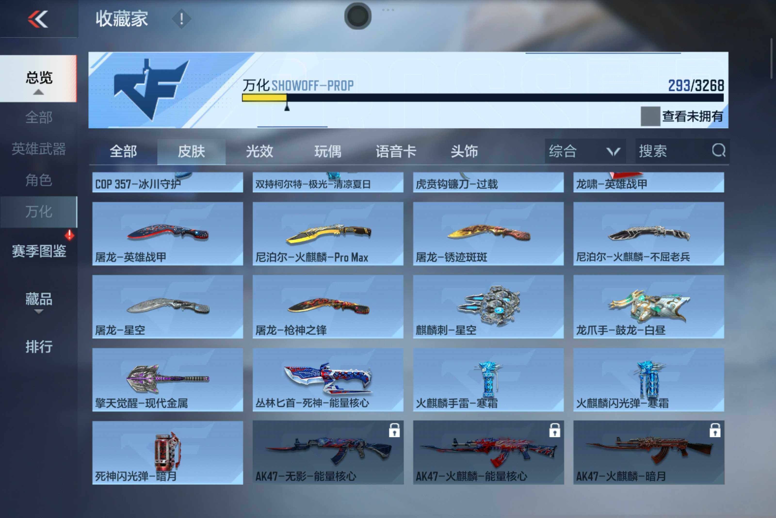 v7/7王者279英雄/王者之心/王者之尊/王者之霆/王者之魂/王影闪光2烟雾/ak孟德套装/ak奉先/m4游骑兵/an94盖/81光明之神2/awm游骑兵永恒誓约/m200幻神/awm妙才/czs2仲康/雷霆cop/堕天神cop/黑铁cop冰川守护/柯尔特仲达/双持gl0ck18本初/7屠龙/穷奇铁扇/炽芒蝶刃/角色/祝融夫人/消灭音效/炎龙铠甲/巴巴塔/能量核心/斩杀/狙击呛线/暗影核心/
