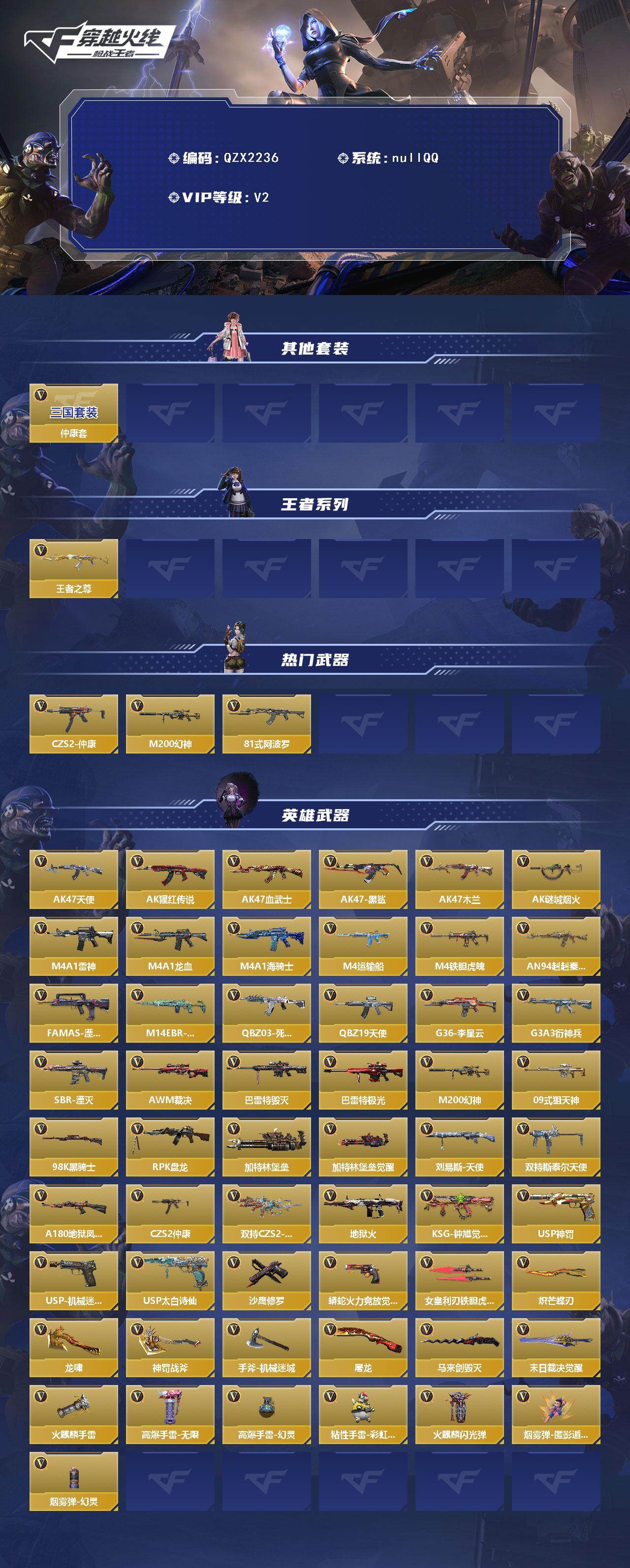 【qzx2236】vip2/97v/仲康套/王者之尊/czs2-仲康/m200-幻神/81式-阿波罗/ak47-天使/ak47-猩红传说/ak47-血武士/ak47-黑鲨/ak47-木兰/ak47-谜城烟火/m4a1-雷神/m4a1-龙血/m4a1-海骑士/m4a1-运输船/m4a1-铁胆虎魄/an94-赳赳秦师/famas-湮灭/m14ebr-葫芦山庄/q03-死神/q19-天使/g36-李星云/g3a3-衍神兵/sbr-湮灭/awm-裁决/芭蕾特-毁灭/芭蕾特-极光/09式狙-天神/98k-黑骑士/rpk-盘龙/加特林-堡垒/加特林-堡垒觉醒/刘易斯-天使/双持斯泰尔-天使/a180-地狱凤凰/双持czs2-魔礼寿/地狱火/ksg-钟馗觉醒/usp-神罚/usp-机械迷城/usp-太白诗仙/沙鹰-修罗/蟒蛇-火力竞放觉醒/女皇利刃-铁胆虎魄/炽芒蝶刃/龙啸/神罚战斧/手斧-机械迷城/屠龙/马来剑-毁灭/末日裁决觉醒/火麒麟手蕾/高爆手蕾-无限/高爆手蕾-幻灵/粘性手蕾-彩虹小白马觉醒/火麒麟闪光丹/盐雾蛋-匿影遁形/盐雾蛋-幻灵