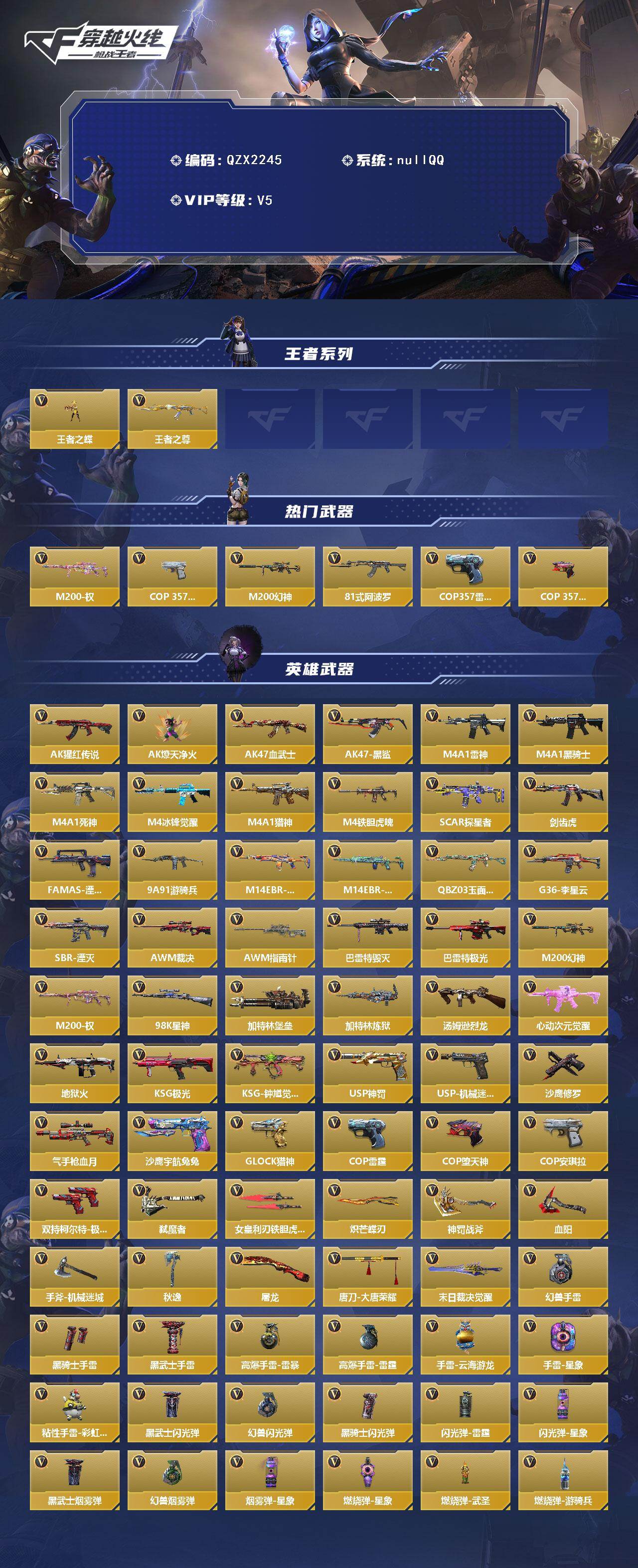 【qzx2245】vip5/114v/王者之蝶/王者之尊/m200-权/cop 357-安琪拉/m200-幻神/81式-阿波罗/cop 357-雷霆/cop 357-堕天神/ak47-猩红传说/ak47-燎天净火/ak47-血武士/ak47-黑鲨/m4a1-雷神/m4a1-黑骑士/m4a1-死神/m4a1-冰锋觉醒/m4a1-猎神/m4a1-铁胆虎魄/scar-探星者/剑齿虎/famas-湮灭/9a91-游骑兵/m14ebr-拂影/m14ebr-葫芦山庄/q03-玉面羞花/g36-李星云/sbr-湮灭/awm-裁决/awm-指南针/芭蕾特-毁灭/芭蕾特-极光/98k-星神/加特林-堡垒/加特林-炼狱/汤姆逊-烈龙/czs2-心动次元觉醒/地狱火/ksg-极光/ksg-钟馗觉醒/usp-神罚/usp-机械迷城/沙鹰-修罗/气手呛-血月/沙鹰-宇航兔兔/glock18-猎神/双持柯尔特-极光/弑魔者/女皇利刃-铁胆虎魄/炽芒蝶刃/神罚战斧/血阳/手斧-机械迷城/秋逸/屠龙/唐刀-大唐荣耀/末日裁决觉醒/幻兽手蕾/黑骑士手蕾/黑武士手蕾/高爆手蕾-雷暴/高爆手蕾-雷霆/手蕾-云海游龙/手蕾-星象/粘性手蕾-彩虹小白马觉醒/黑武士闪光丹/幻兽闪光丹/黑骑士闪光丹/闪光丹-雷霆/闪光丹-星象/黑武士盐雾蛋/幻兽盐雾蛋/盐雾蛋-星象/燃烧弹-星象/燃烧弹-武圣/燃烧弹-游骑兵