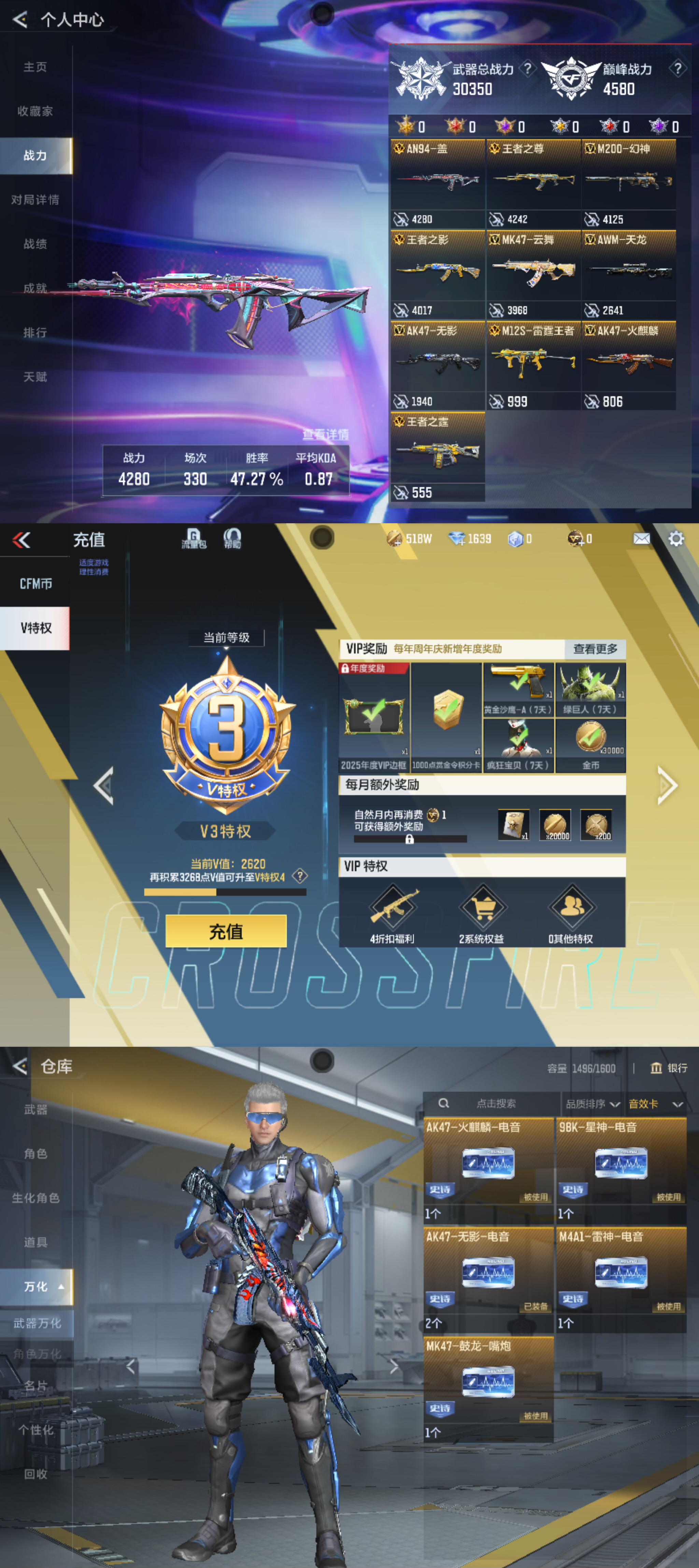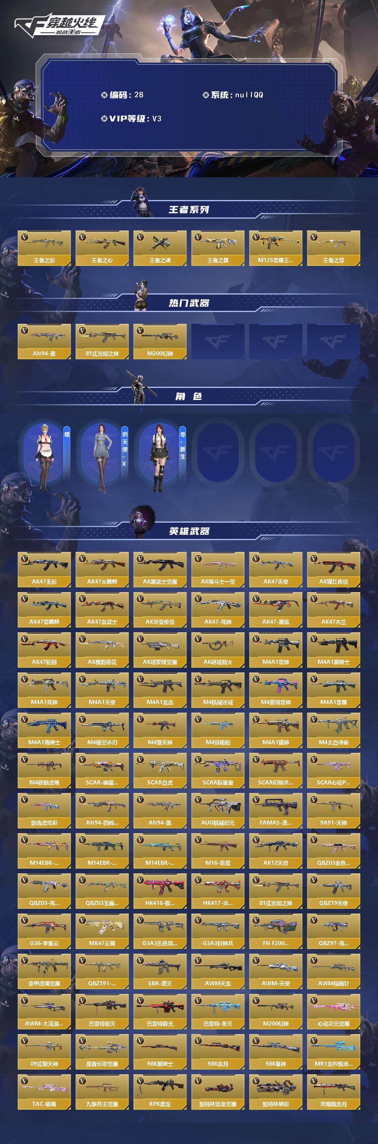 【v3 329v 王者之影/心/魂/霆/尊 雷霆王者 盖 幻神 光明神 炫彩剑齿虎】【等级】98【区服】手q-苹果【金角色数】2【金武器数】270【金v角色】零 关小雨【金v武器】ak47-木兰 唐刀-大唐荣耀 神罚战斧 神罚战斧 awm-天使 改装glock-木兰 m4a1-海骑士 加特林-堡垒 m4a1-猎神 ksg-极光 scar-心动pick scar light-白虎